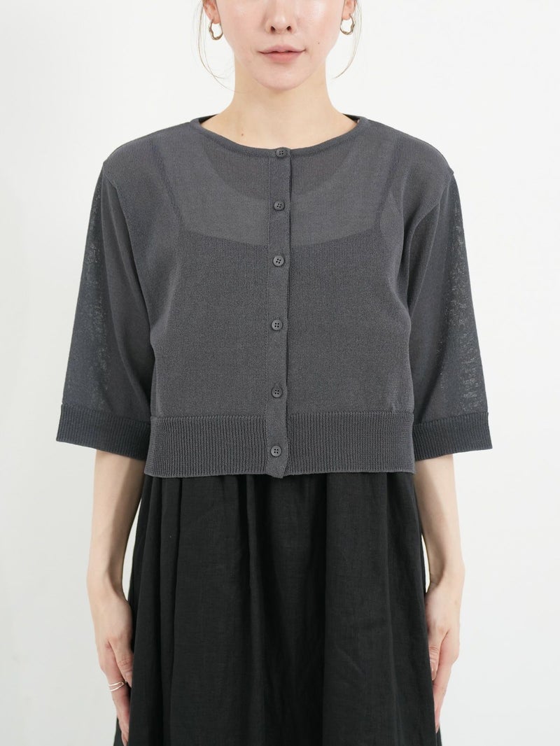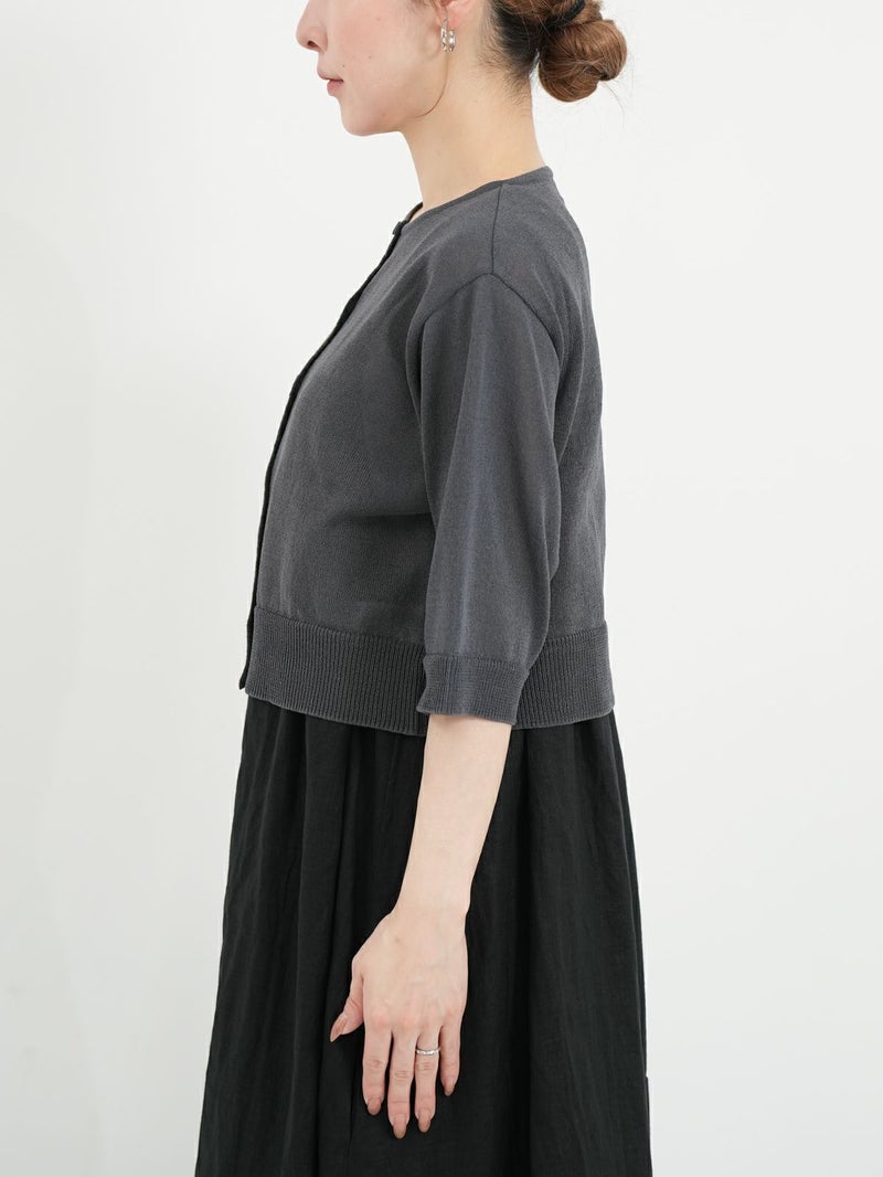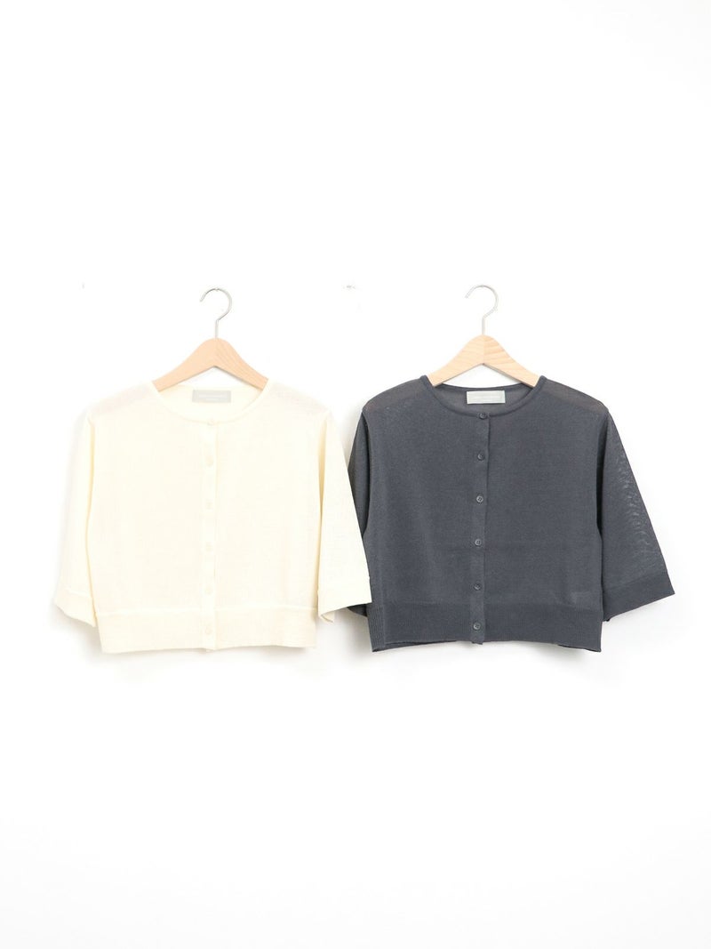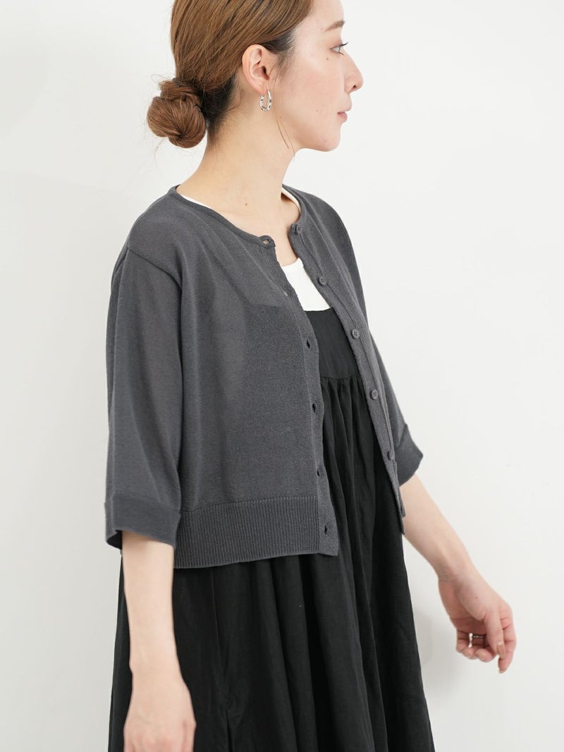 ドライな素材感が魅力のショート丈カーディガン。 和紙混のさらっとした生地で肌離れもよく、今からの時期にぴったりな1枚。程よくコンパクトな身幅と5分袖のデザインはトレンドのボリュームボトムスとも相性よく着用していただけます。