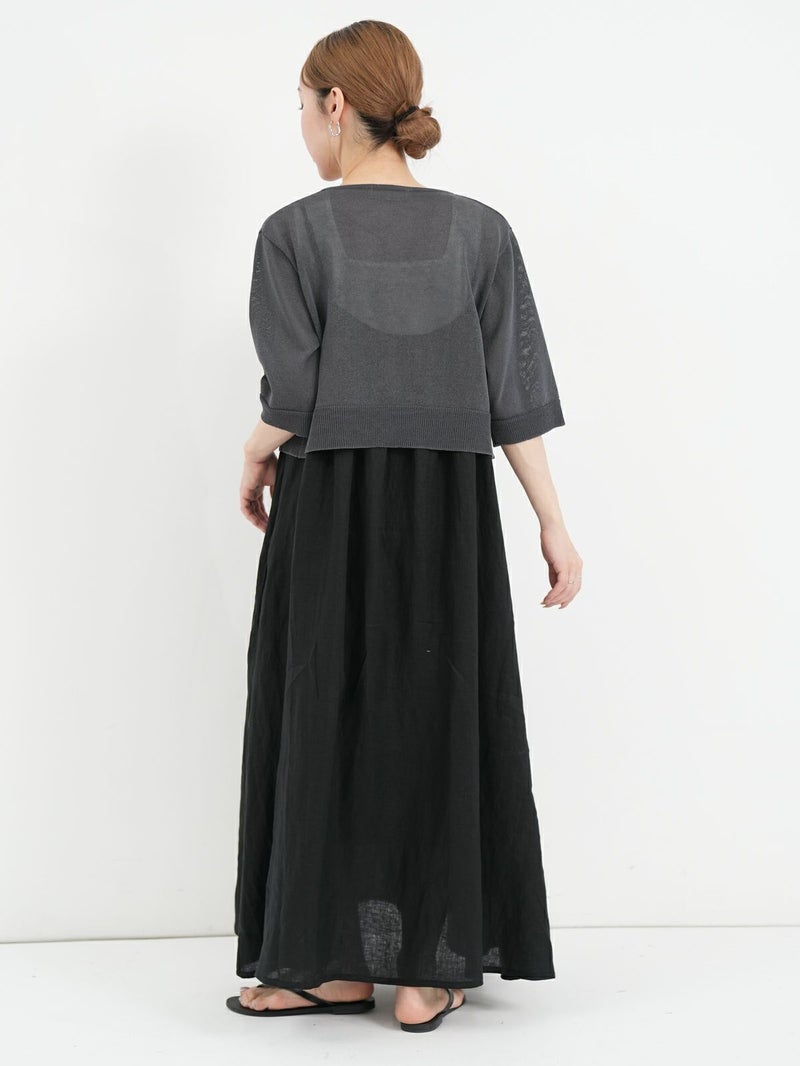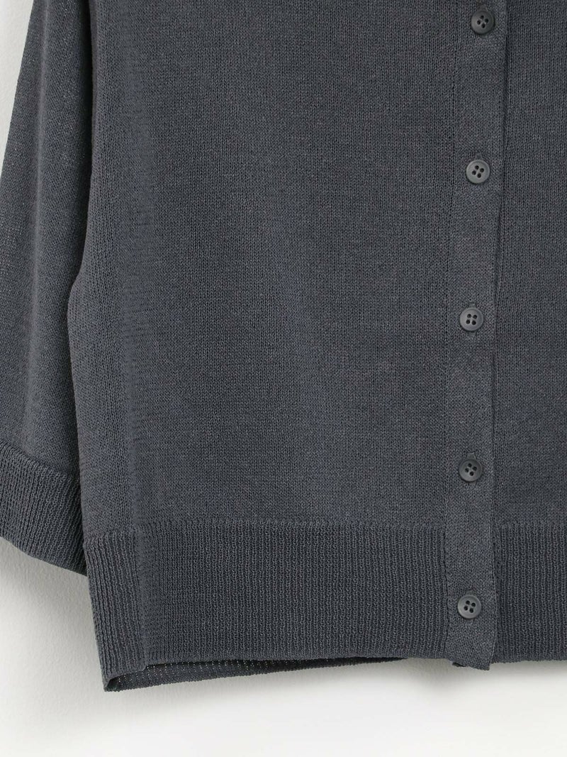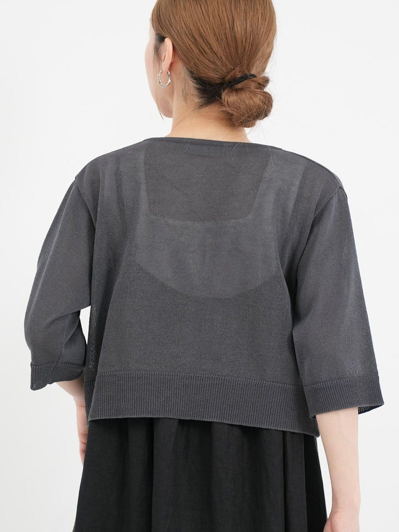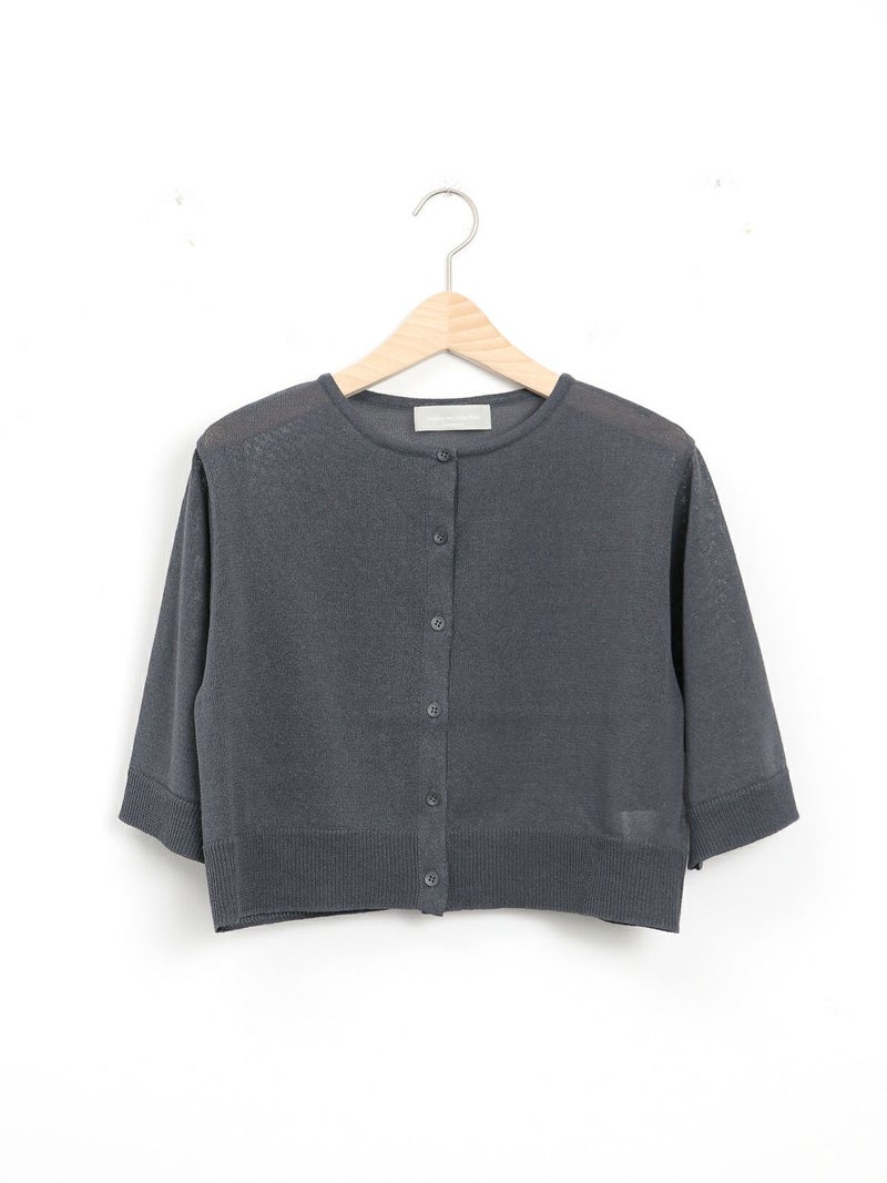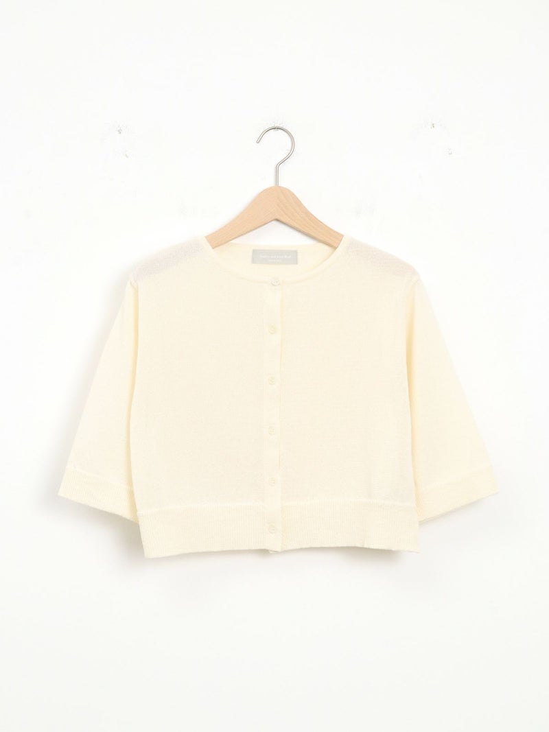 ドライな素材感が魅力のショート丈カーディガン。 和紙混のさらっとした生地で肌離れもよく、今からの時期にぴったりな1枚。程よくコンパクトな身幅と5分袖のデザインはトレンドのボリュームボトムスとも相性よく着用していただけます。