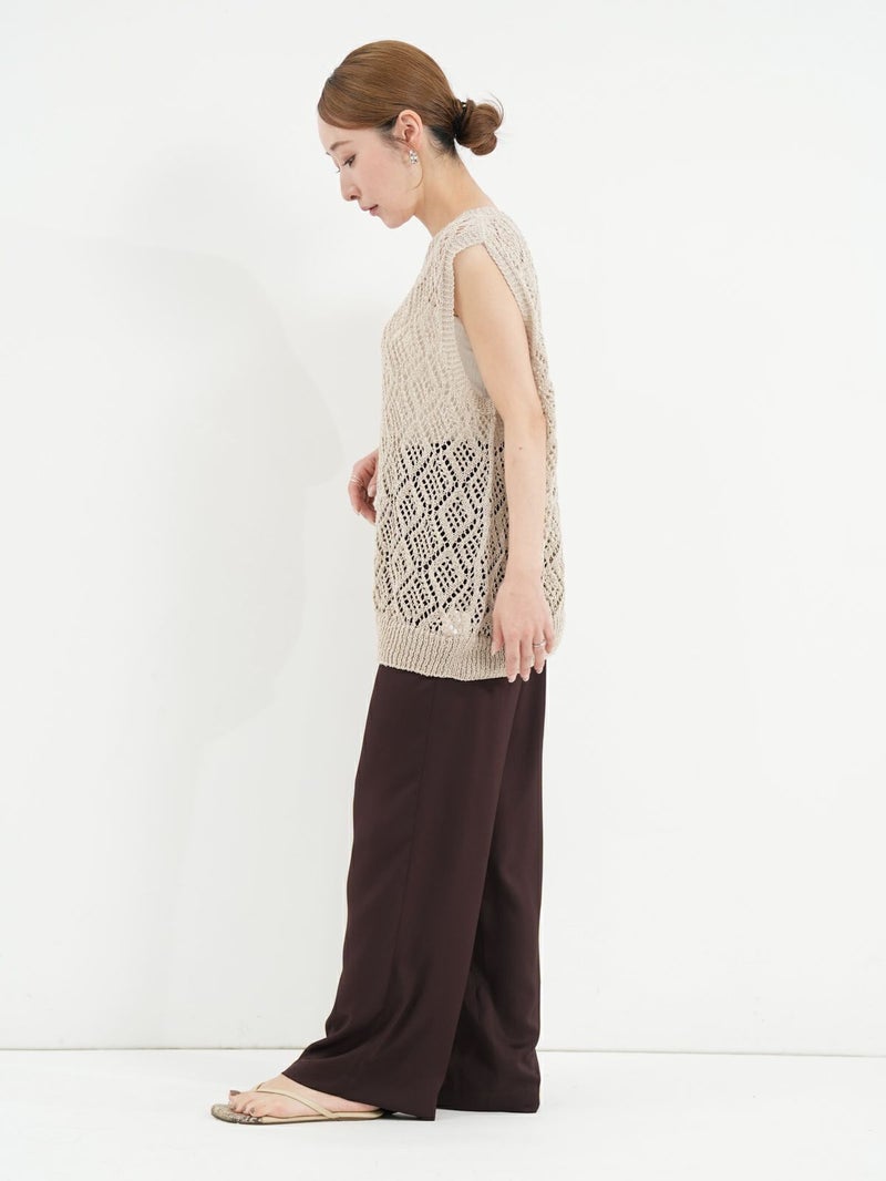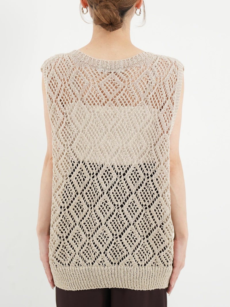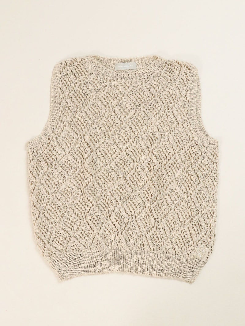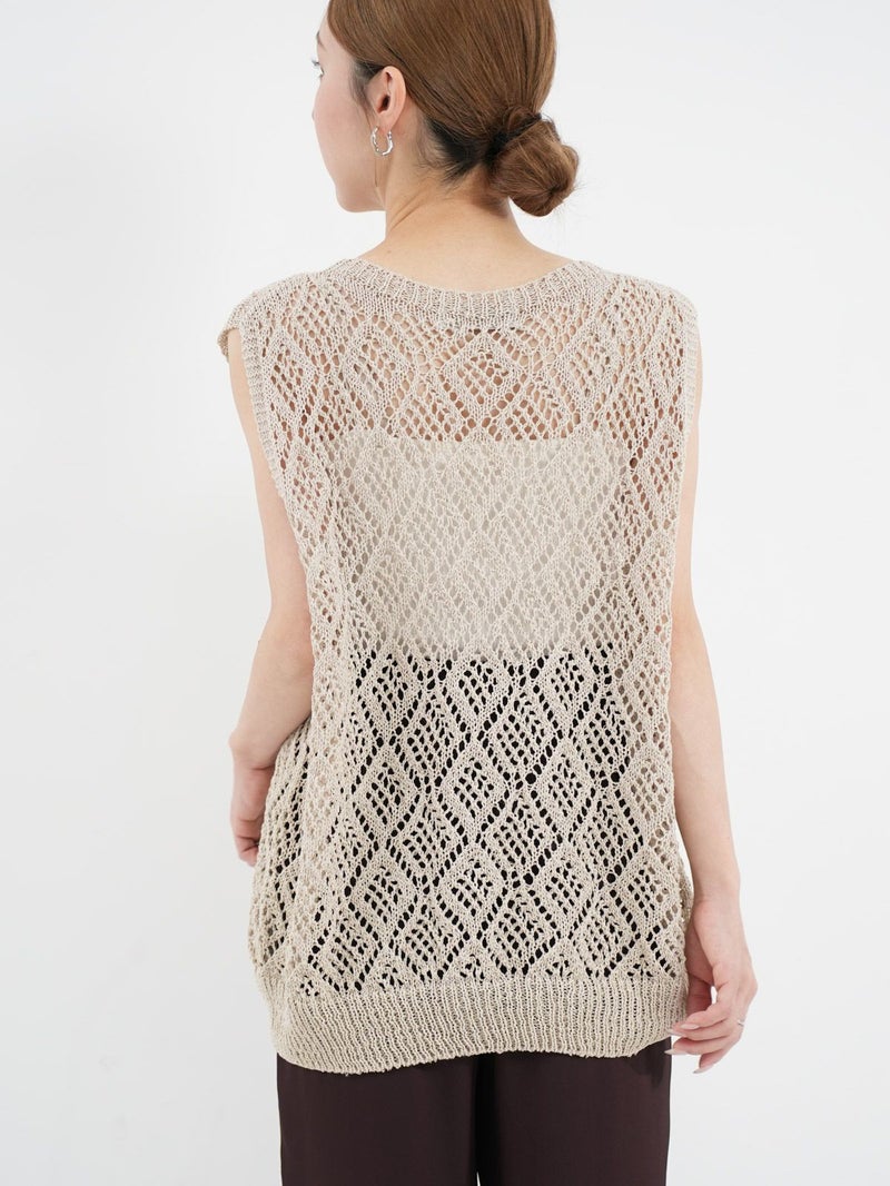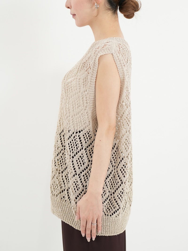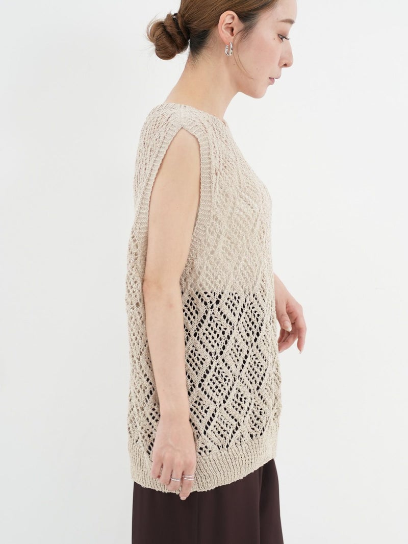 軽量で清潔感のある、ナチュラルなシャリ感が魅力の和紙混合素材を使用したノースリーブプルオーバー。 ホールガーメントで編み立てた自然な立体感や着心地の良さが魅力の1枚です。
