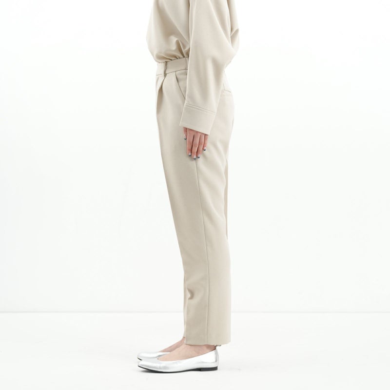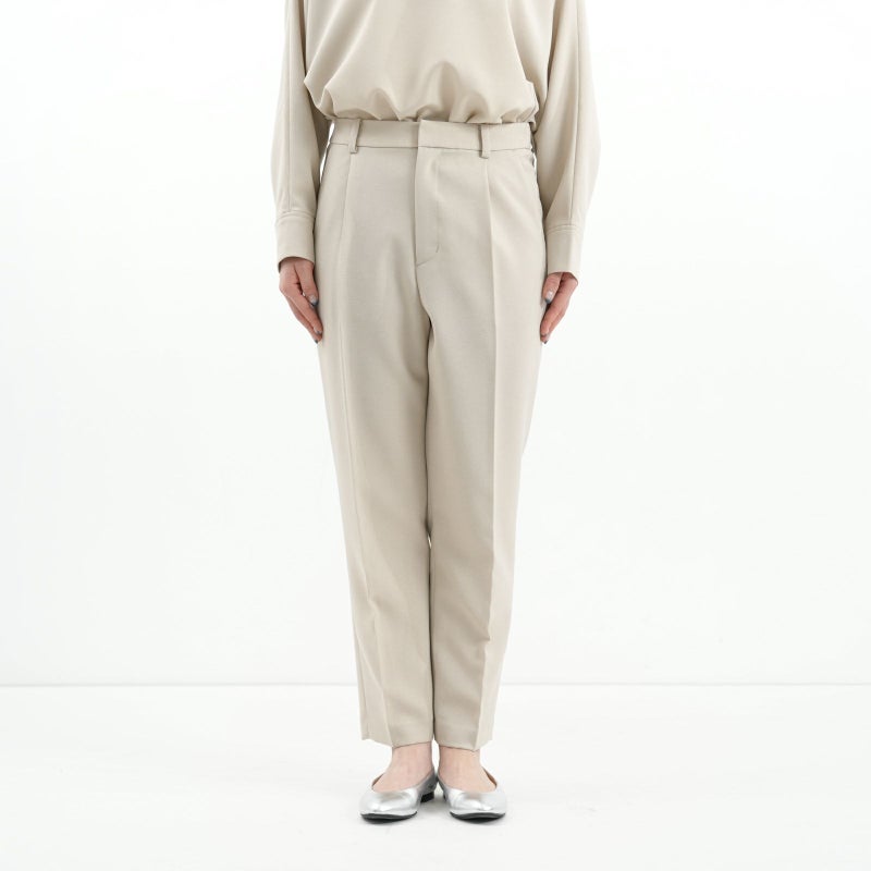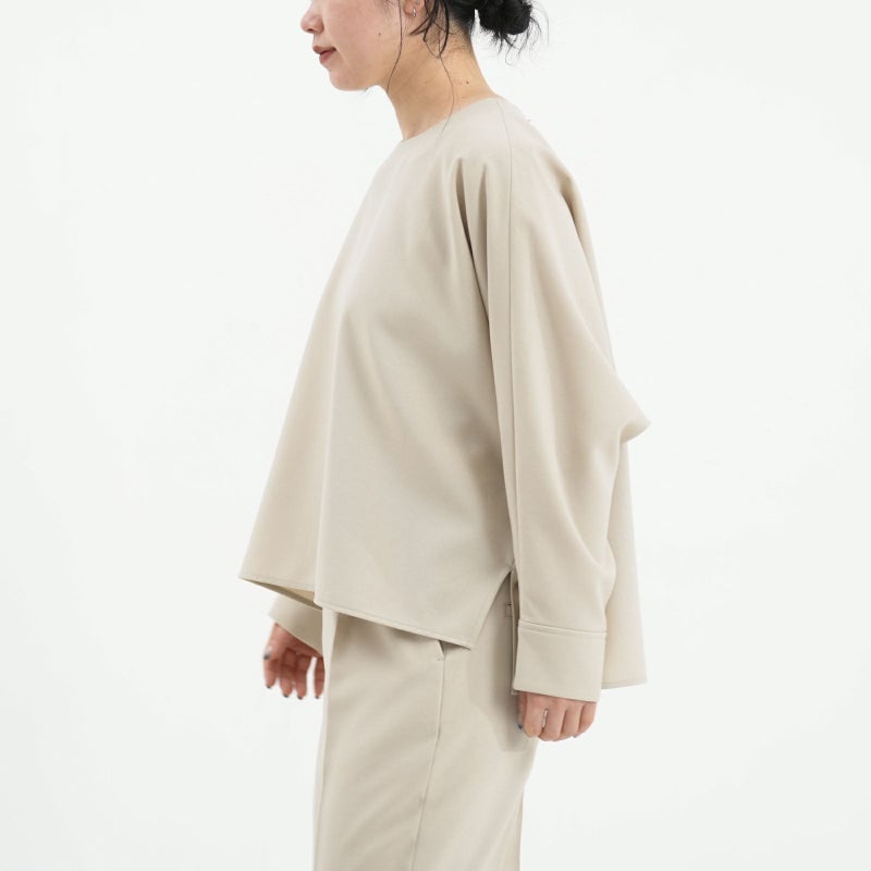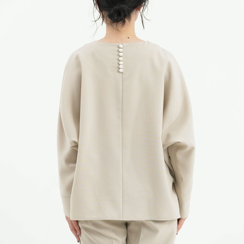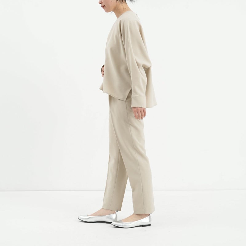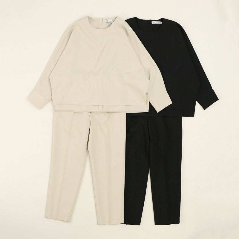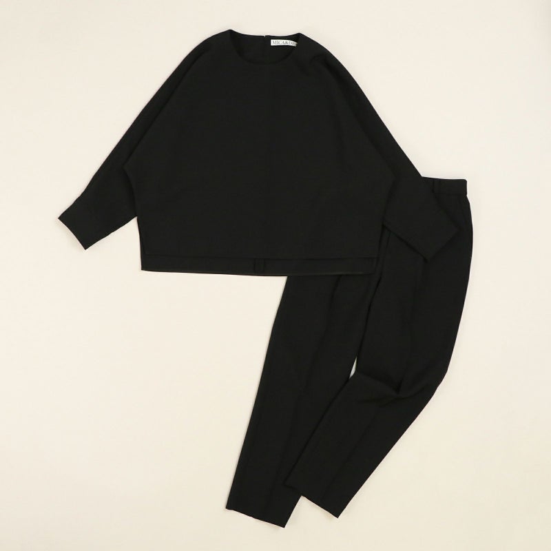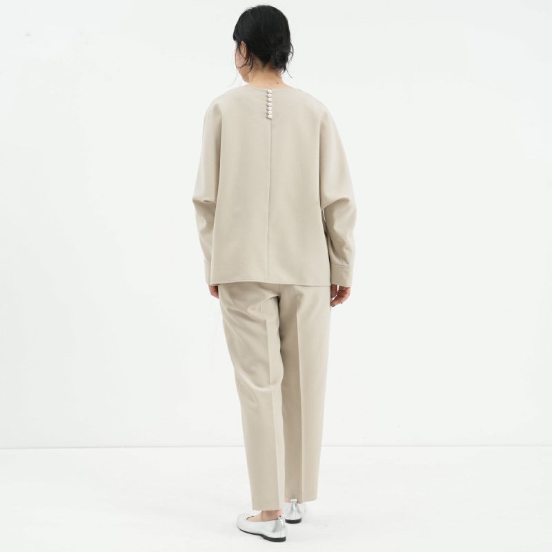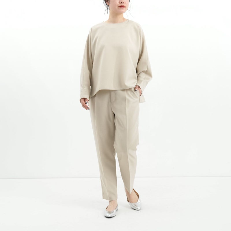 しゃきっとしたマットなポリエステルトロピカル素材を使用し、きちんと感がありながら肩肘張らないちょうど良い着心地に定評があります。 ドルマンスリーブが肩のラインを優しく見せてくれる、リラクシーなドレスブラウスです。 バックパールボタンがさりげなく上品な印象を与えてくれます。 ボトムはすっきりとしたテーパードシルエットをウエストゴムでイージーに。様々なシーンで活躍しそうな便利なアイテムです。