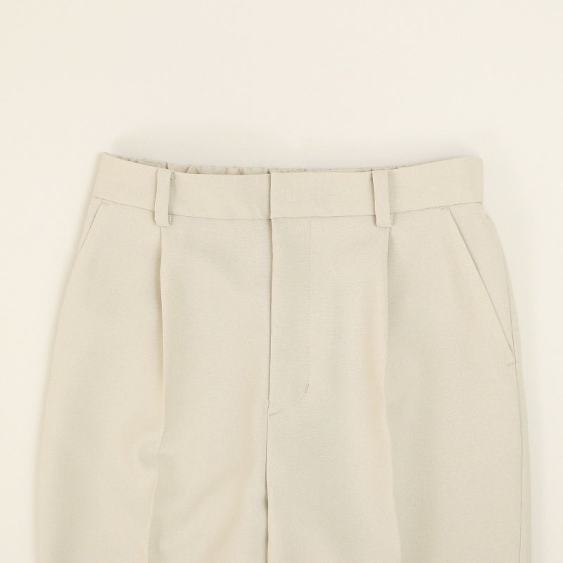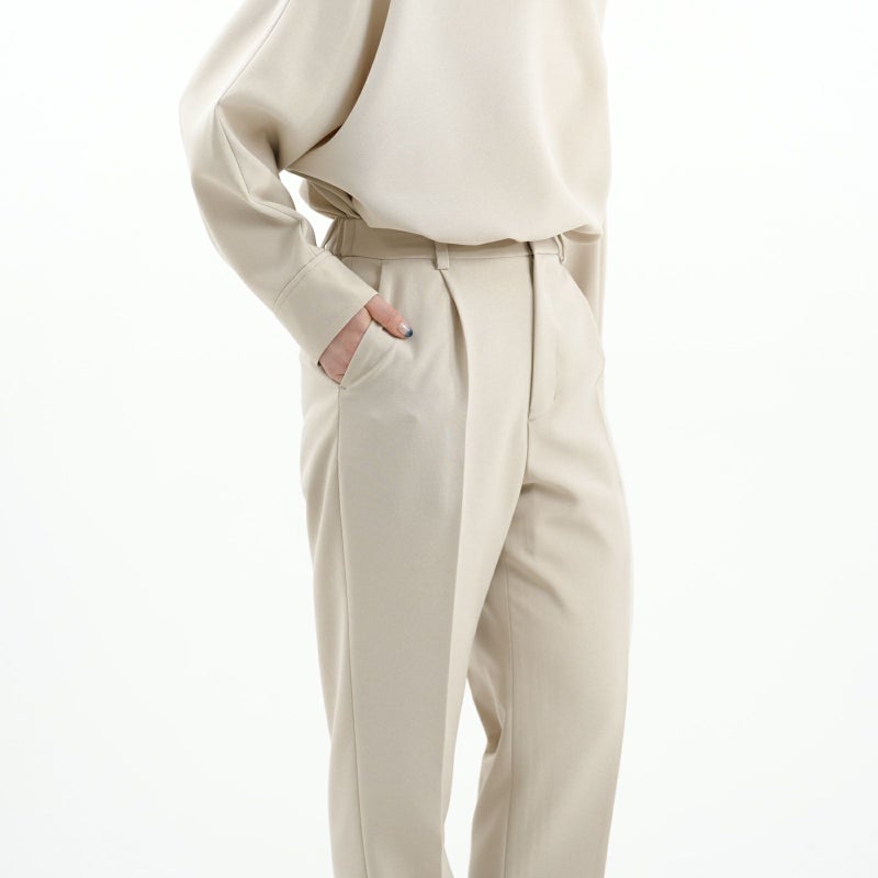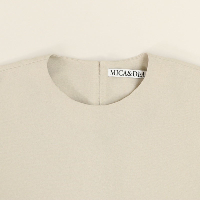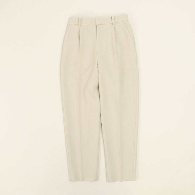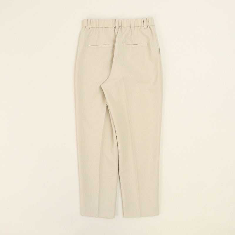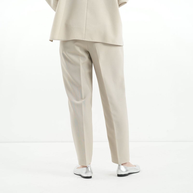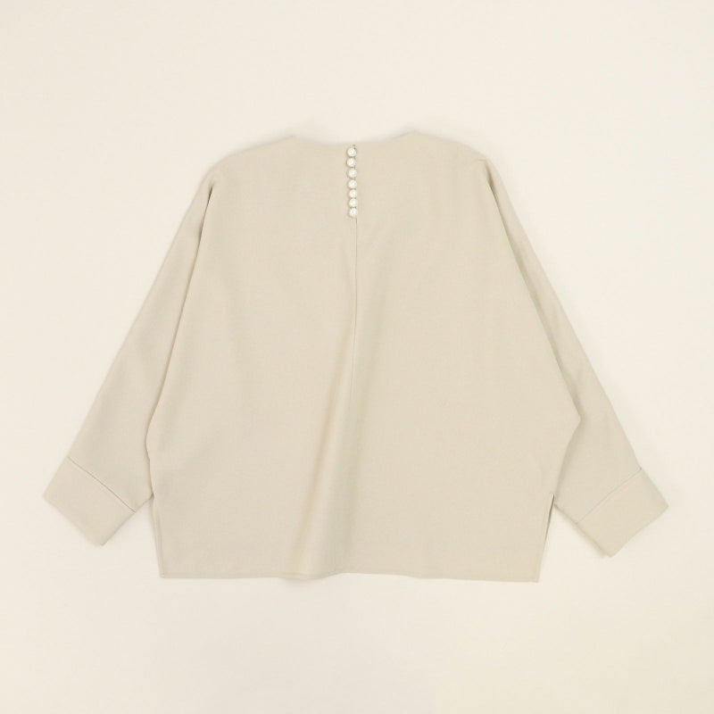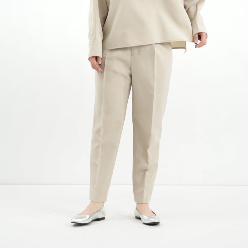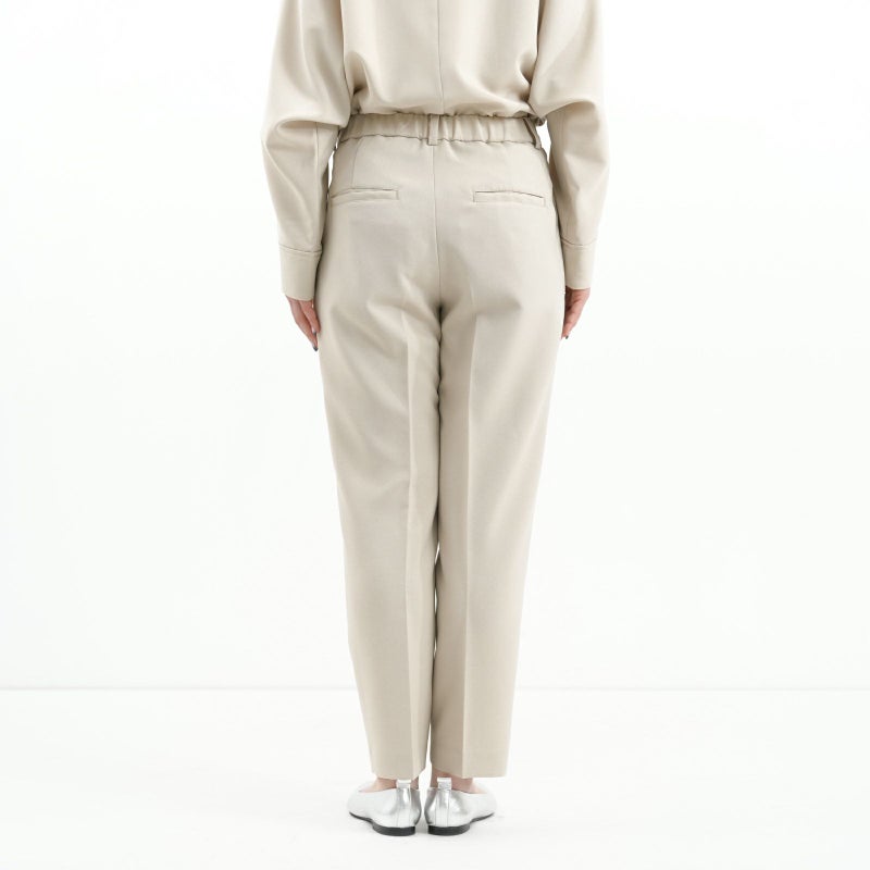 しゃきっとしたマットなポリエステルトロピカル素材を使用し、きちんと感がありながら肩肘張らないちょうど良い着心地に定評があります。 ドルマンスリーブが肩のラインを優しく見せてくれる、リラクシーなドレスブラウスです。 バックパールボタンがさりげなく上品な印象を与えてくれます。 ボトムはすっきりとしたテーパードシルエットをウエストゴムでイージーに。様々なシーンで活躍しそうな便利なアイテムです。