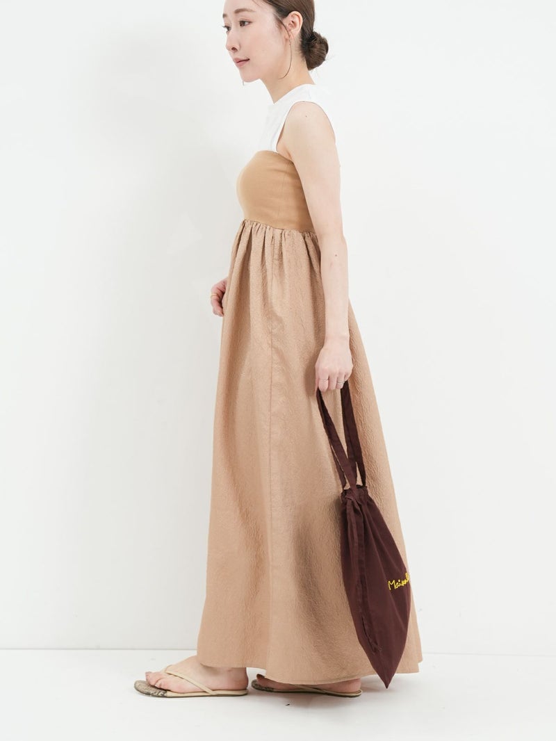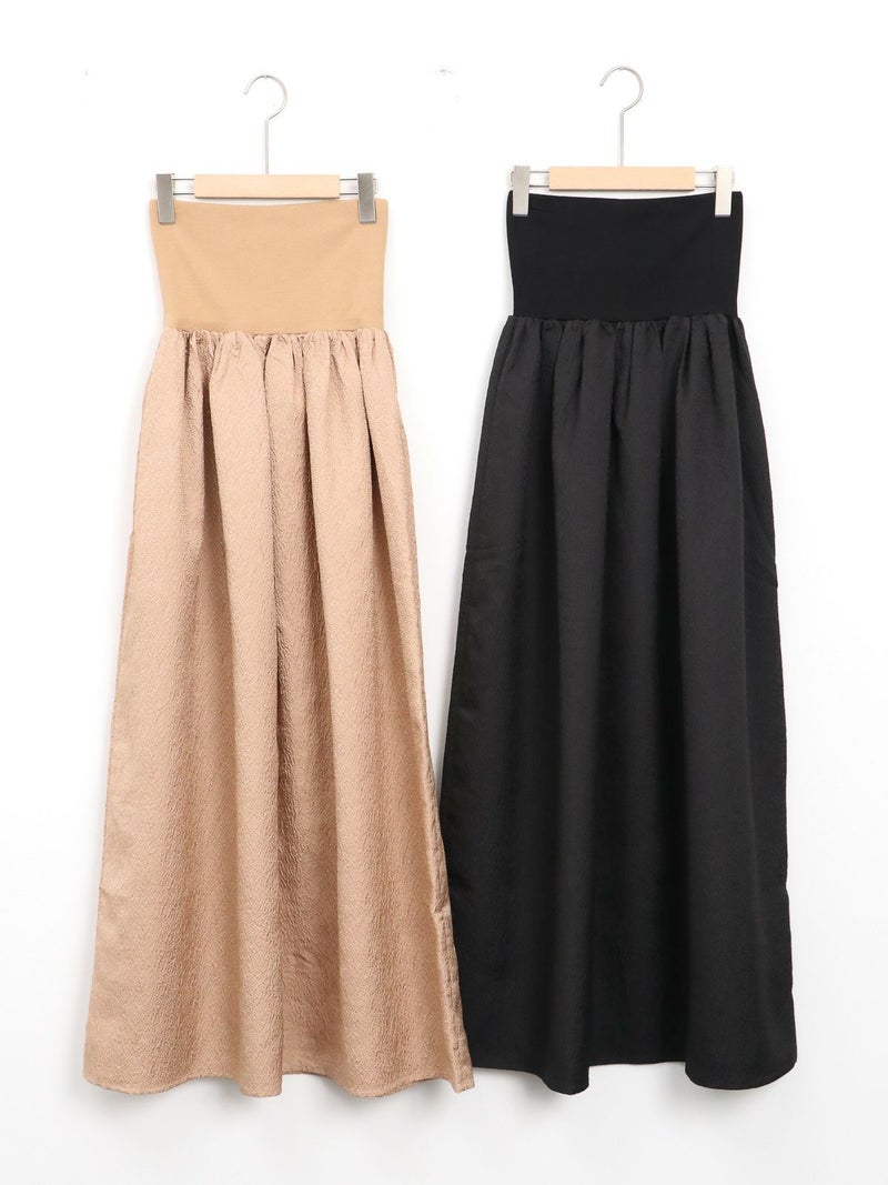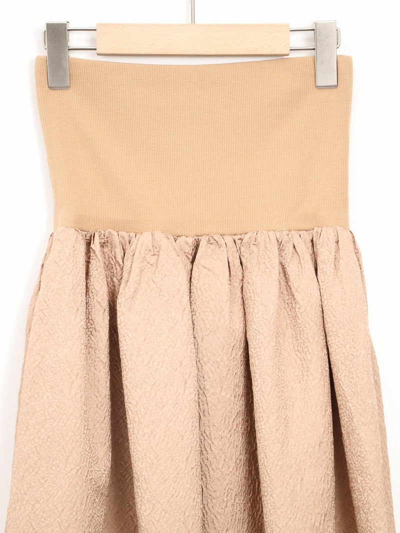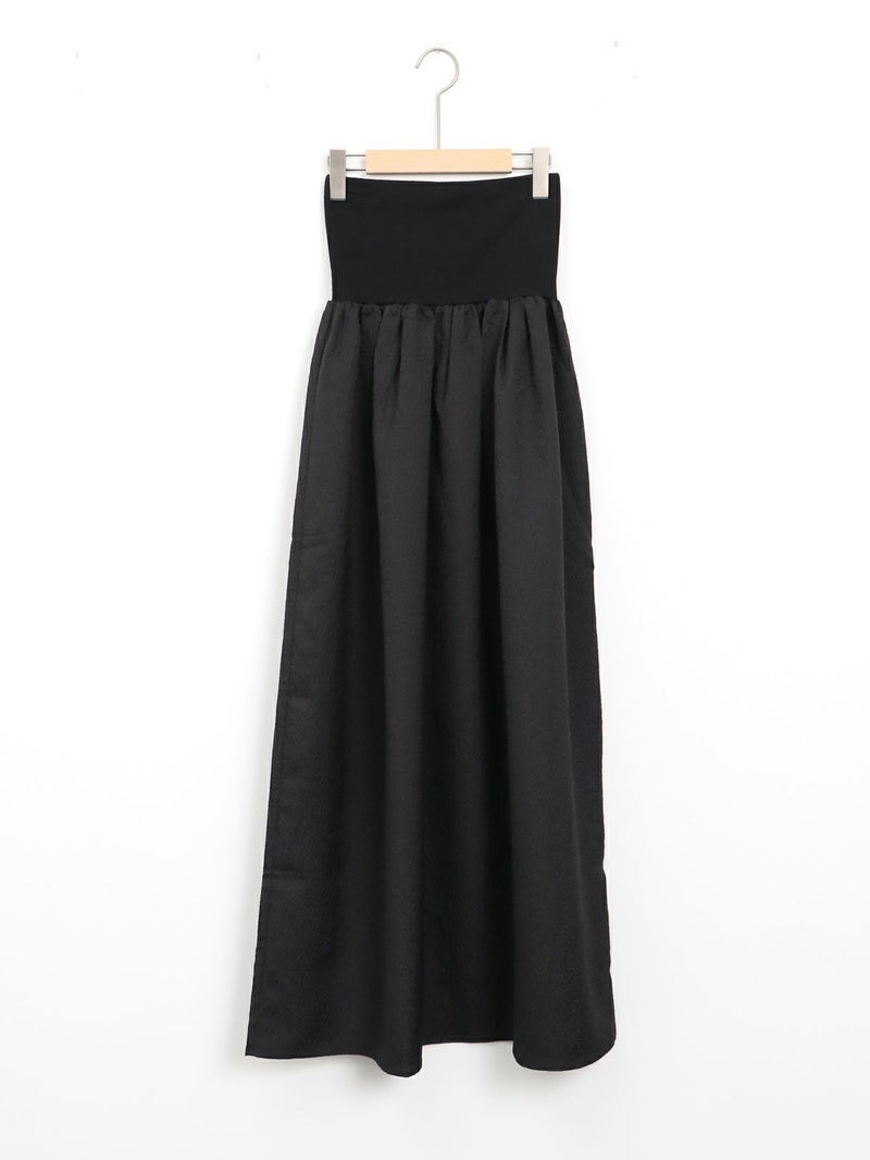 膨れジャガード生地とテレコカットソーをハイブリッドしたベアトップワンピース。 こちらはカットソー部分を折り返し、スカートとしても着用して頂けます。Tシャツなどシンプルなカットソーとの重ね着もお勧めです。