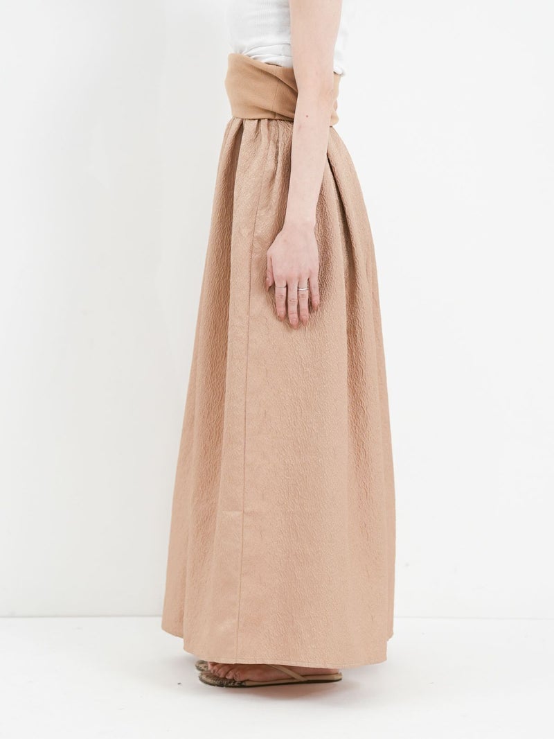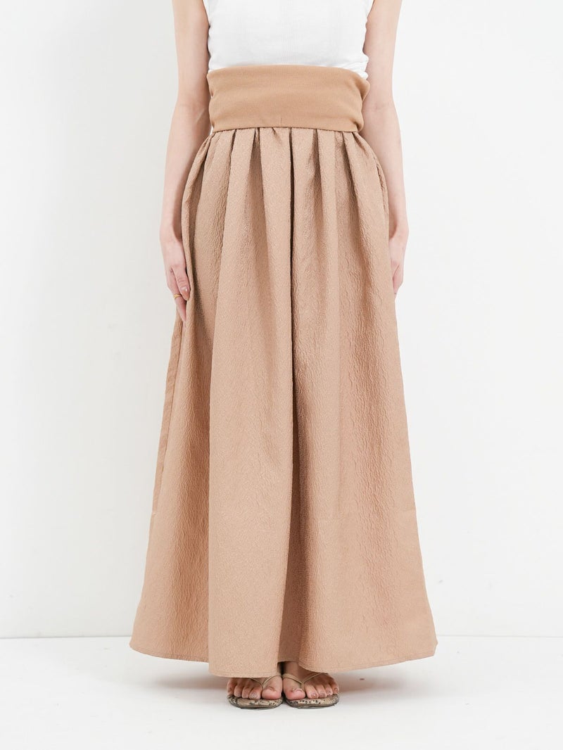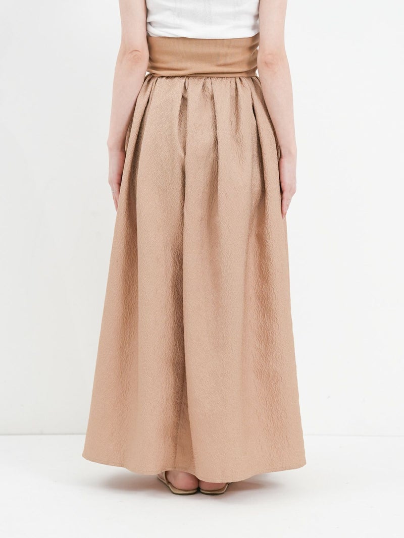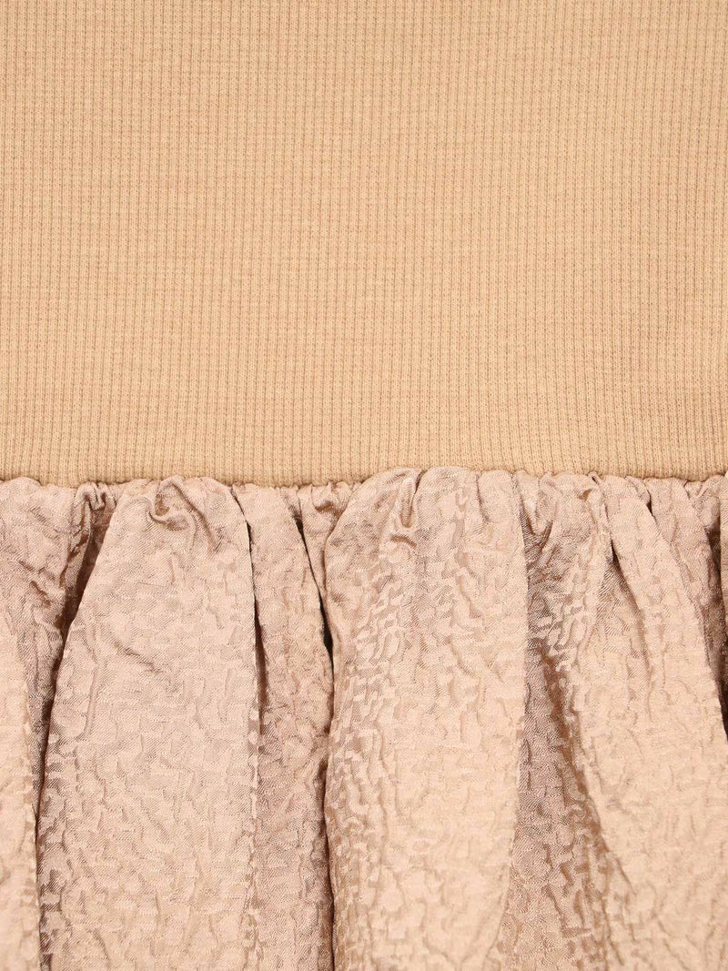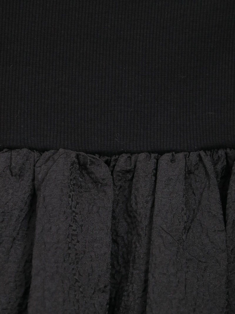 膨れジャガード生地とテレコカットソーをハイブリッドしたベアトップワンピース。 こちらはカットソー部分を折り返し、スカートとしても着用して頂けます。Tシャツなどシンプルなカットソーとの重ね着もお勧めです。
