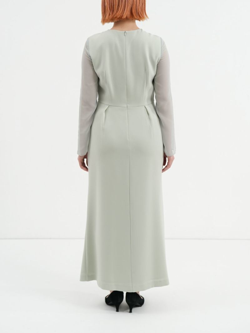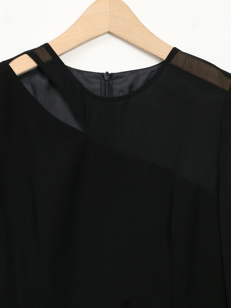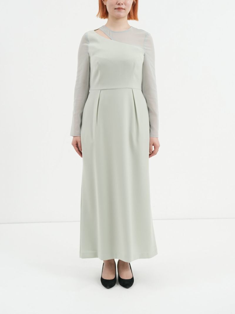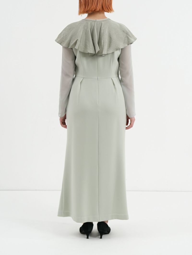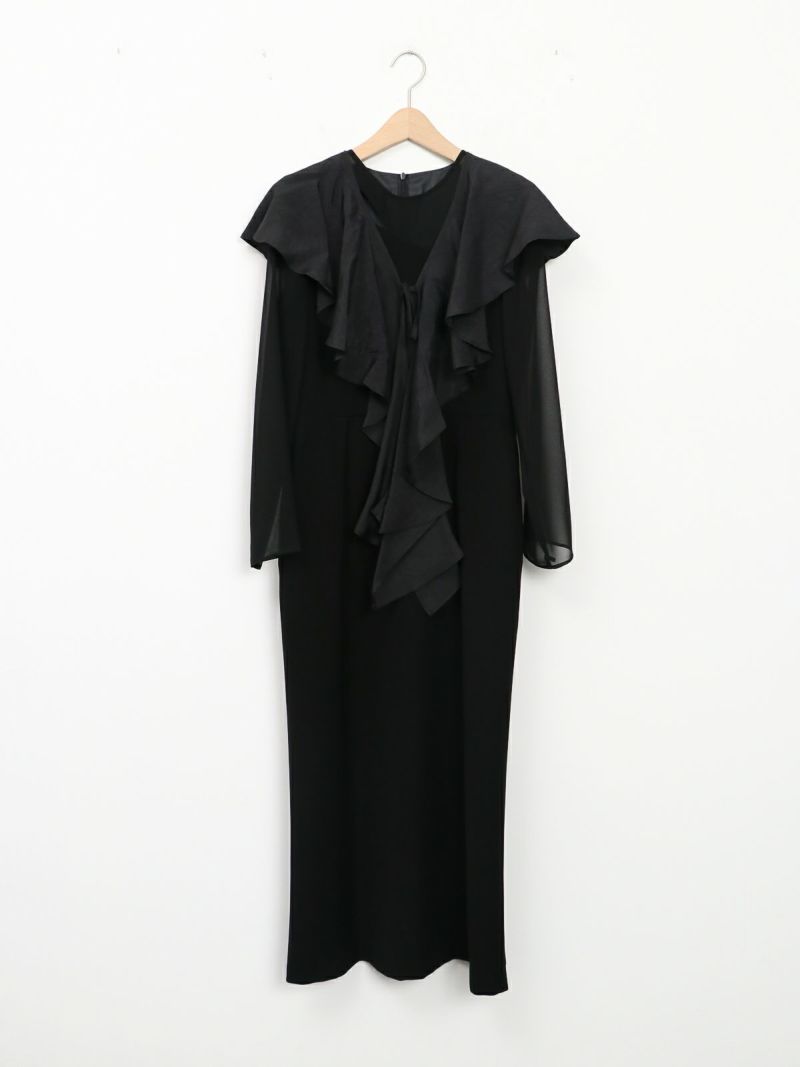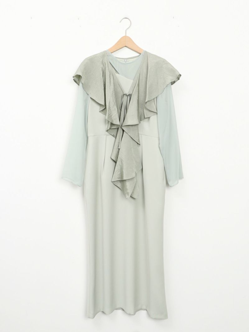 モードな切替えとレディなラッフルショールの合わせが印象的なセットドレス。 フレアーショールのバリエーションで最大5タイプの着用法が可能。 モードな斜めかけスタイルに、またウエストに巻いてペプラム風に…気分によって印象を変えることができます。 またショールを付けずに、ドレスのみで衿のカッティングを印象づけるスタイルもオススメ。 ドレスのマーメイドシルエットは身体のラインを綺麗にみせ、高めの胸下切替えでスタイルアップ効果もあります。