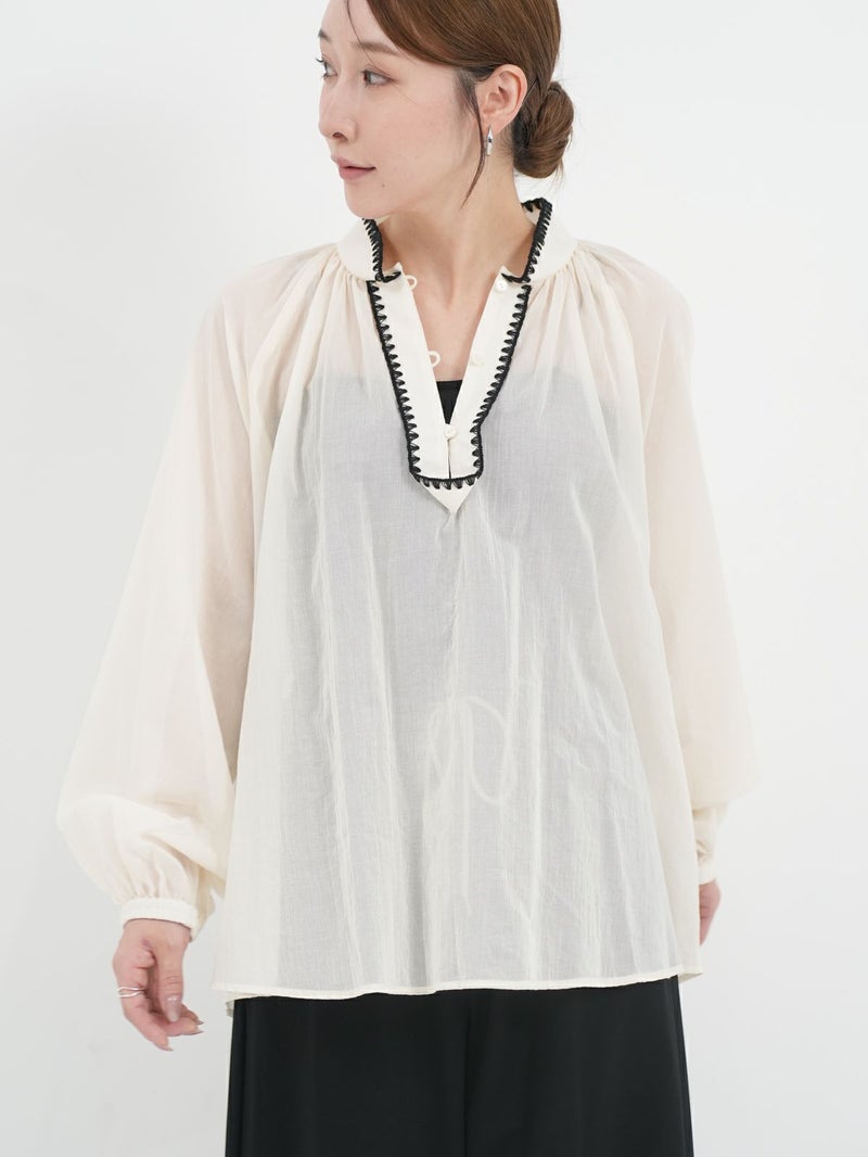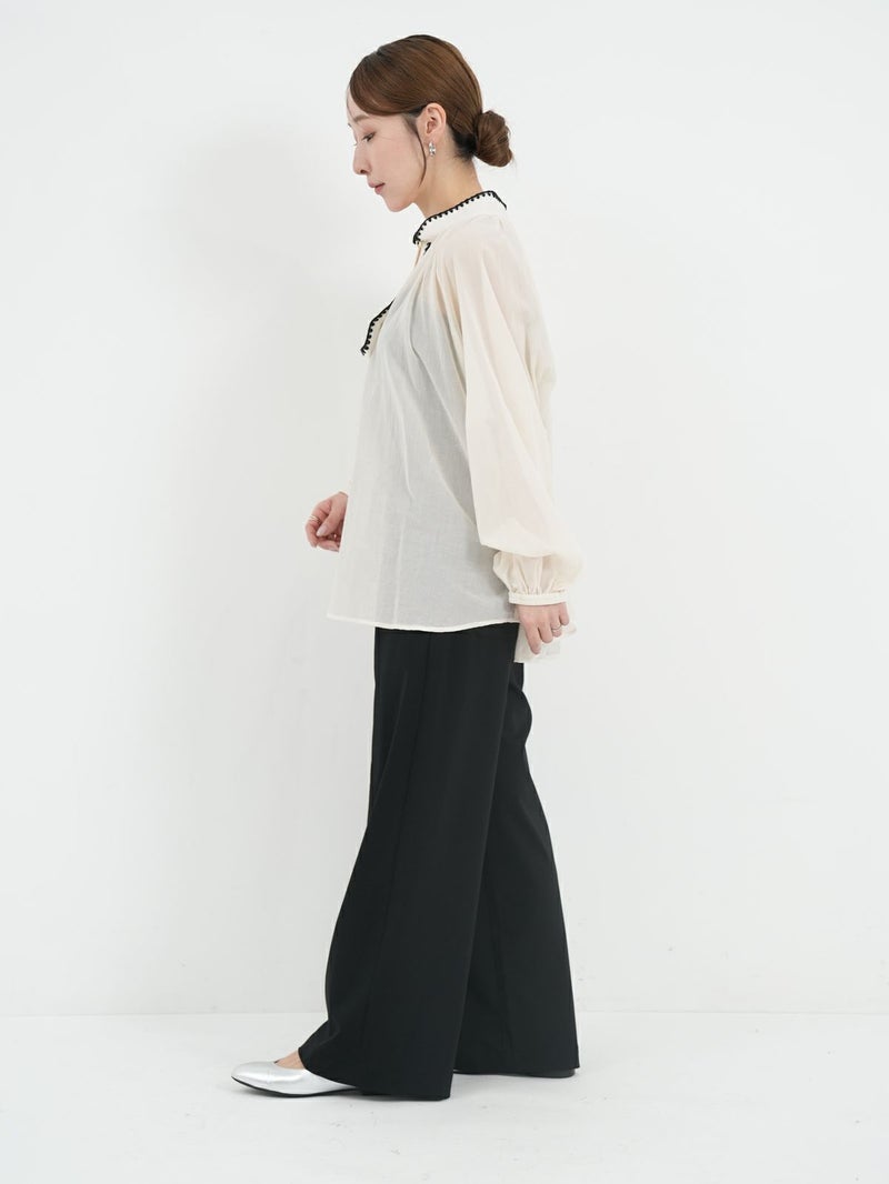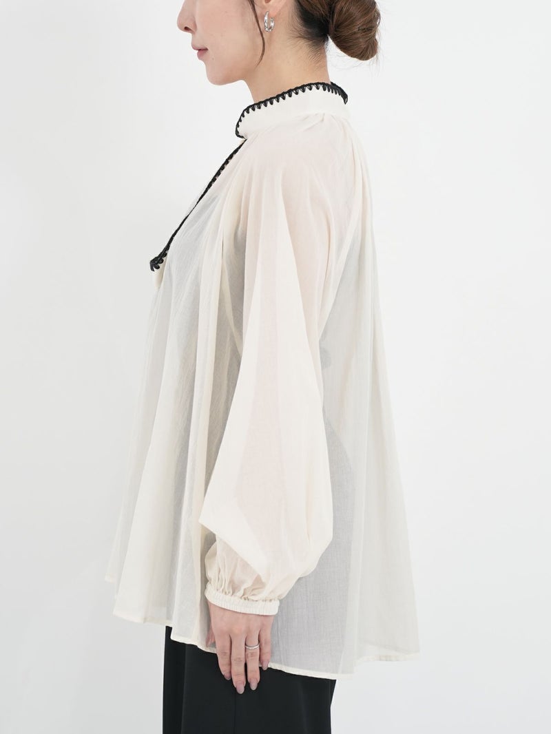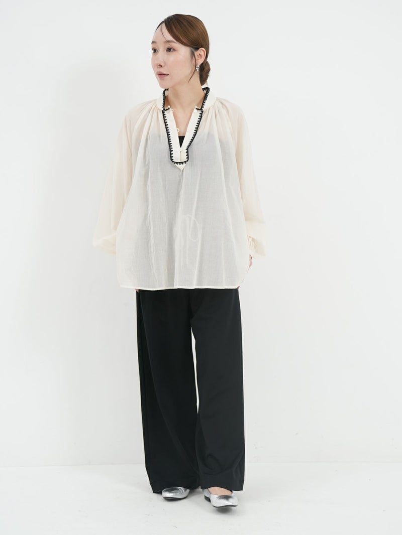 ふわりと広がるシルエットが魅力的なギャザーフレアブラウス。 やや透け感のある軽やかな綿シフォン素材は、快適な着心地です。ネック周りから胸元にかけての刺繍も着こなしのアクセントに。ボトムを選ばず幅広いシーンで活躍する一着です。