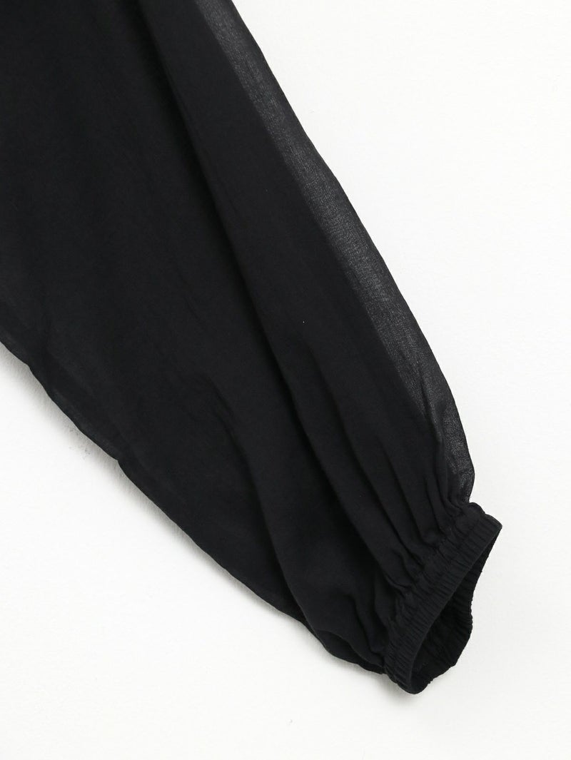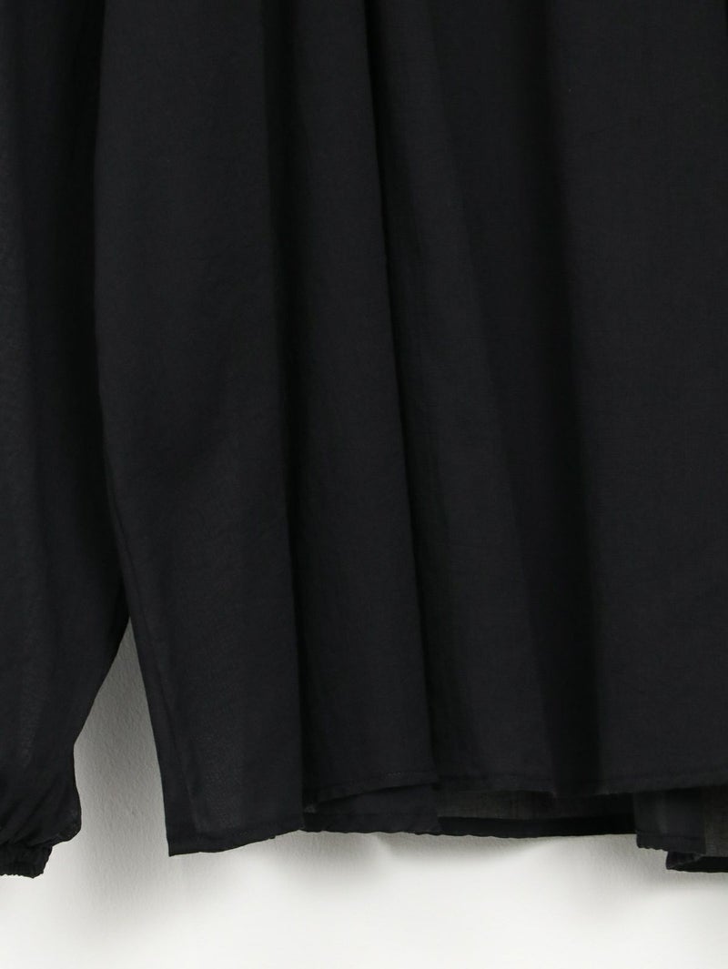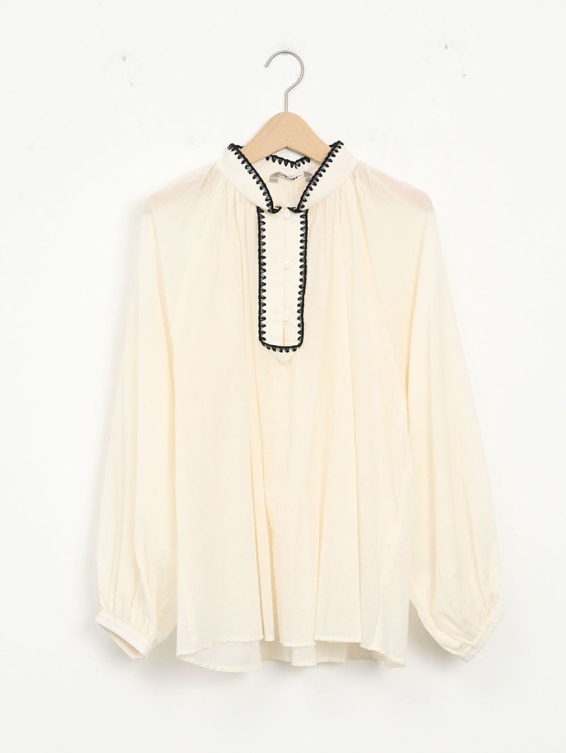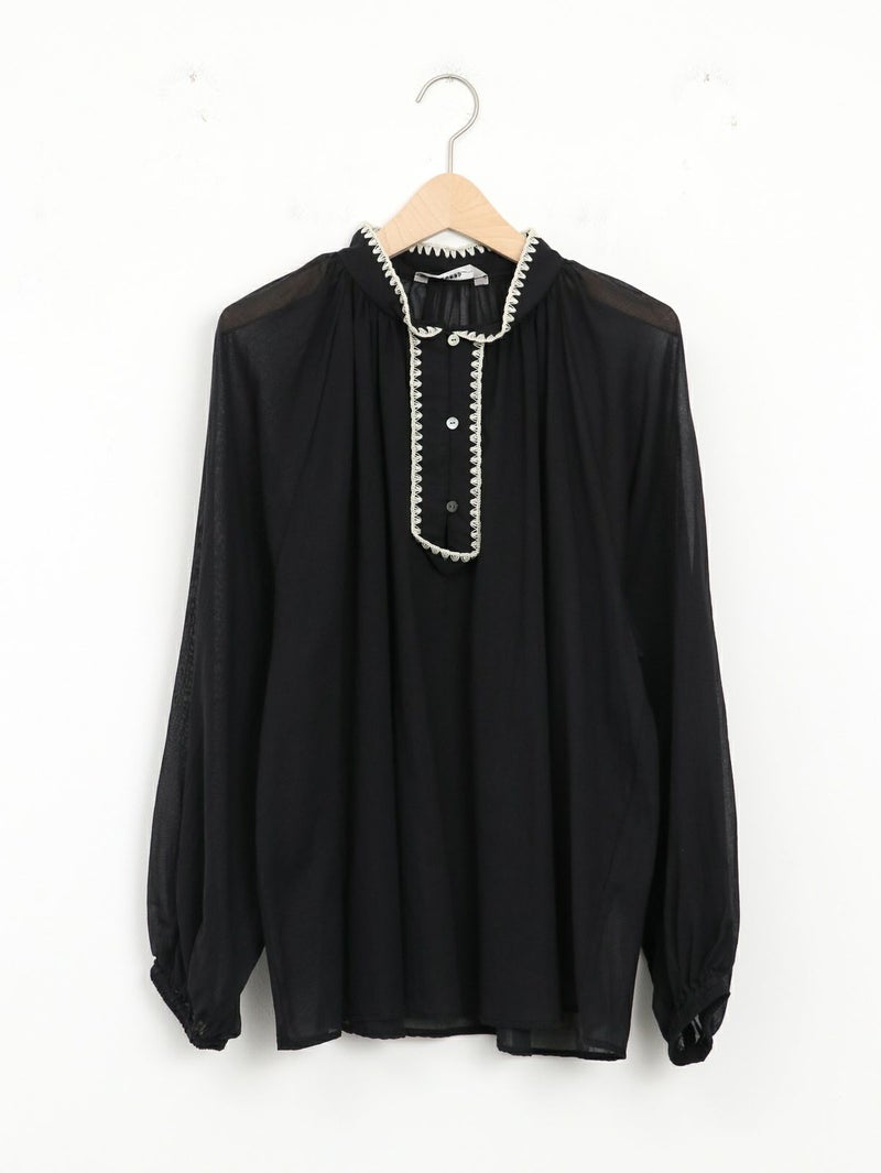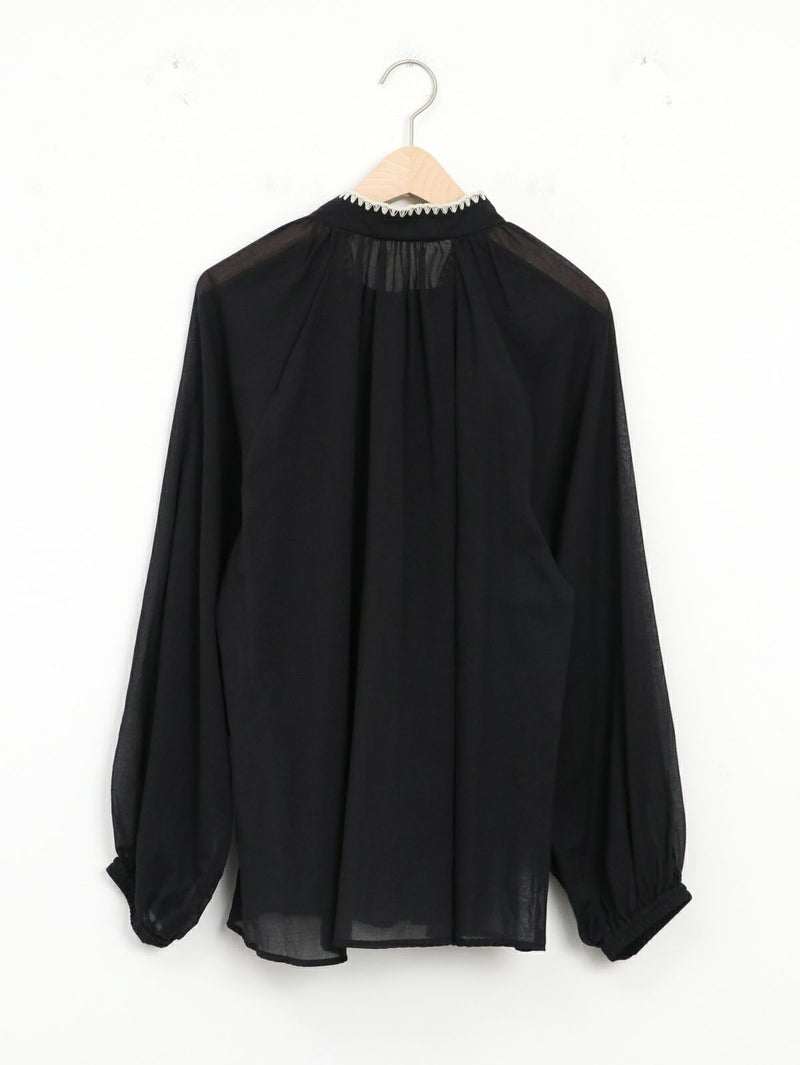 ふわりと広がるシルエットが魅力的なギャザーフレアブラウス。 やや透け感のある軽やかな綿シフォン素材は、快適な着心地です。ネック周りから胸元にかけての刺繍も着こなしのアクセントに。ボトムを選ばず幅広いシーンで活躍する一着です。