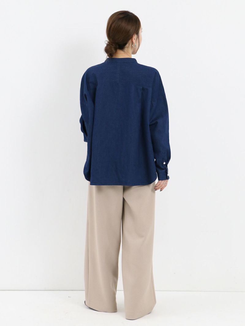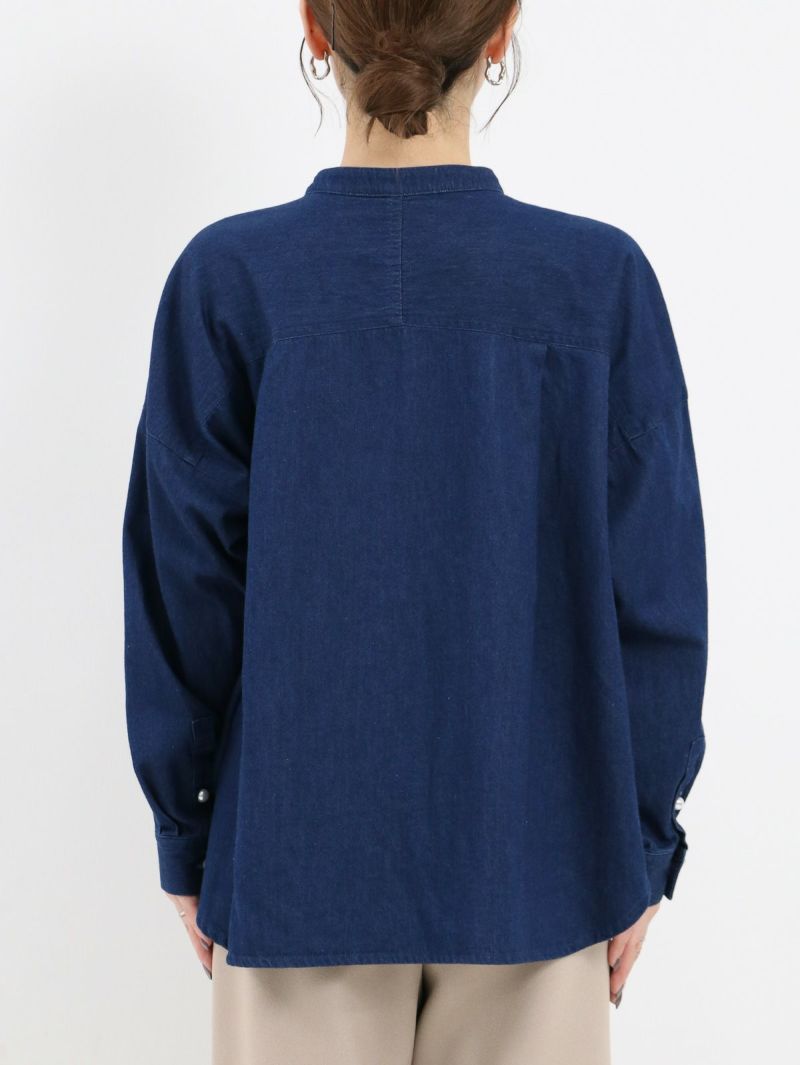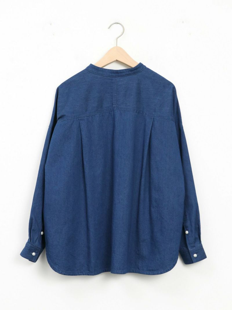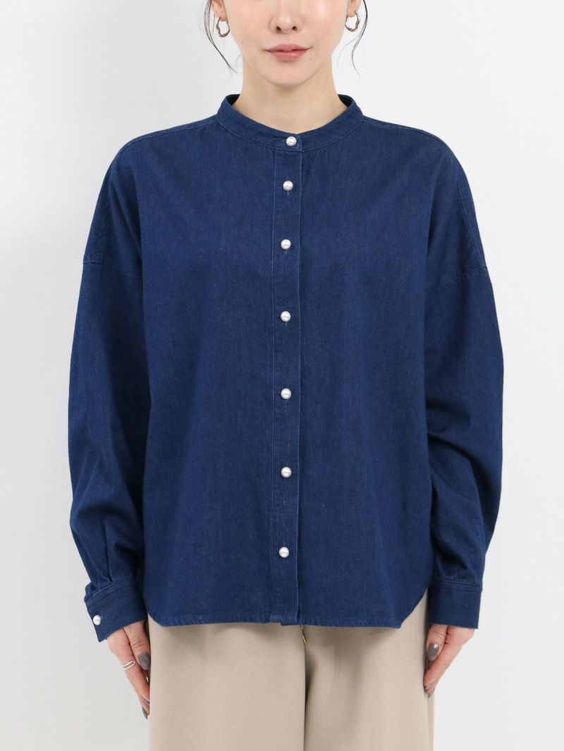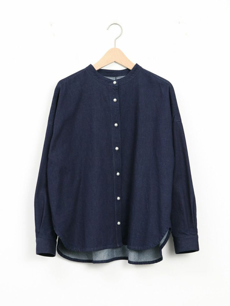 パールボタンを使用した女性らしいデニムシャツ。 1枚で着用するのはもちろん、羽織としても活躍するためロングシーズン着用可能です。 首元はバンドカラーですっきりとしたシンプルなデザイン。柔らかな着心地も嬉しいポイントです♪