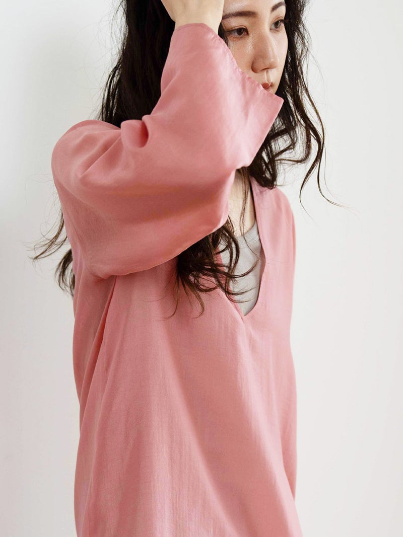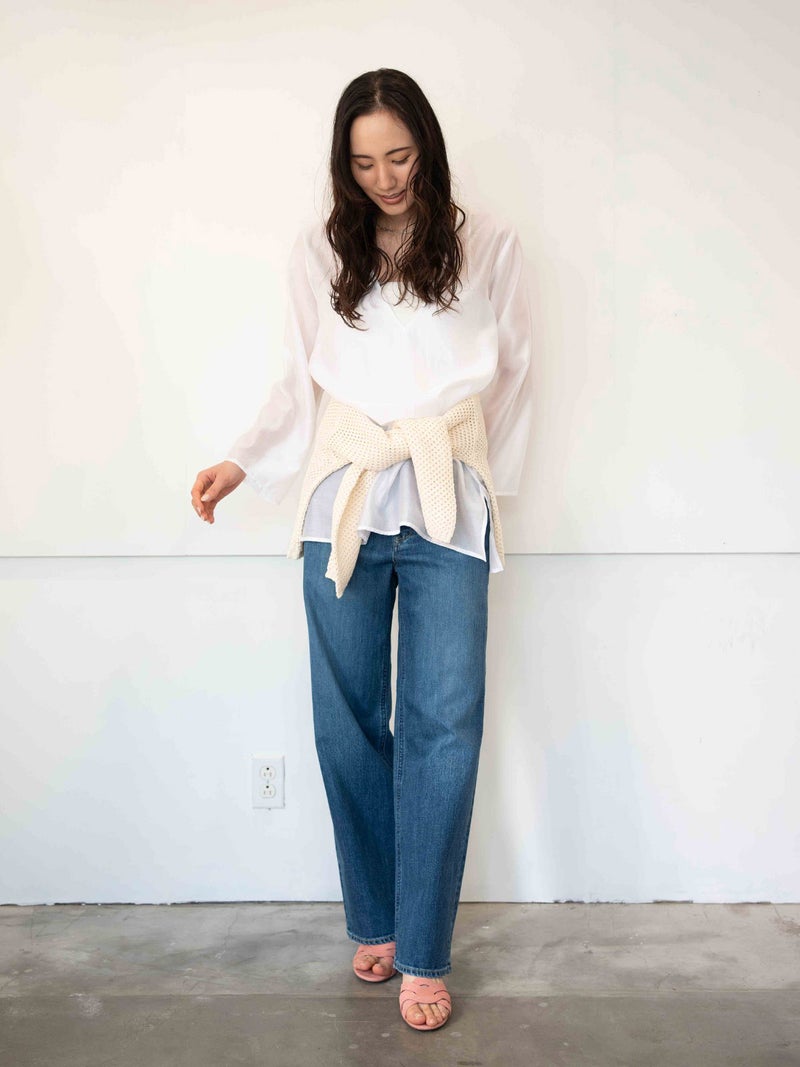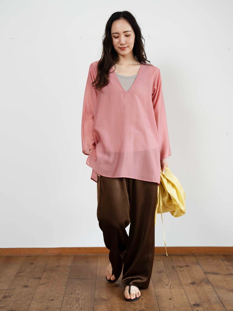 クリーンな印象のVネックシアーブラウス。 身体を泳がせるような適度なゆとりがありつつも、生地の落ち感がすっきりとした縦のラインを強調。シャープなVネックがデコルテをすっきりとみせてくれ、都会的な印象に。風を通す軽やかな素材感で、真夏までストレスフリーな着心地をキープ。 インナーに「Uネック L/S T」を合わせたり、キャミソール一枚で透け感を主役にしたり。合わせるアイテム次第で、印象を変えられます。
