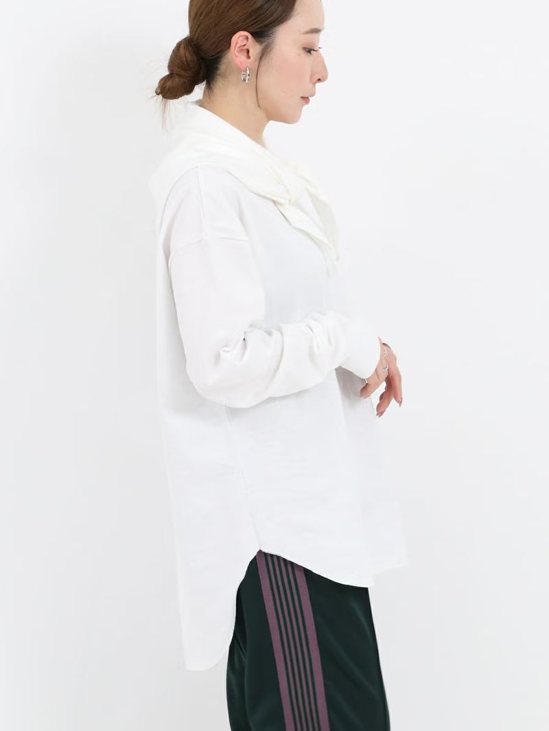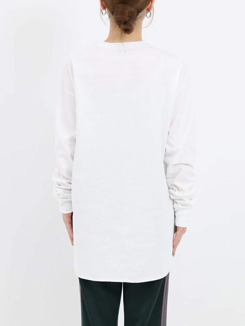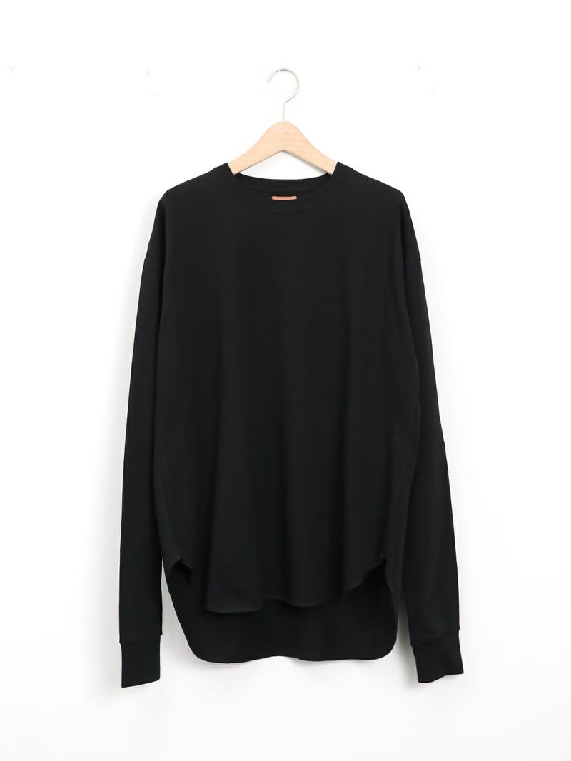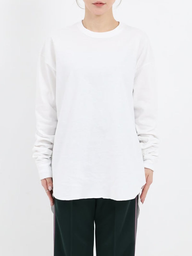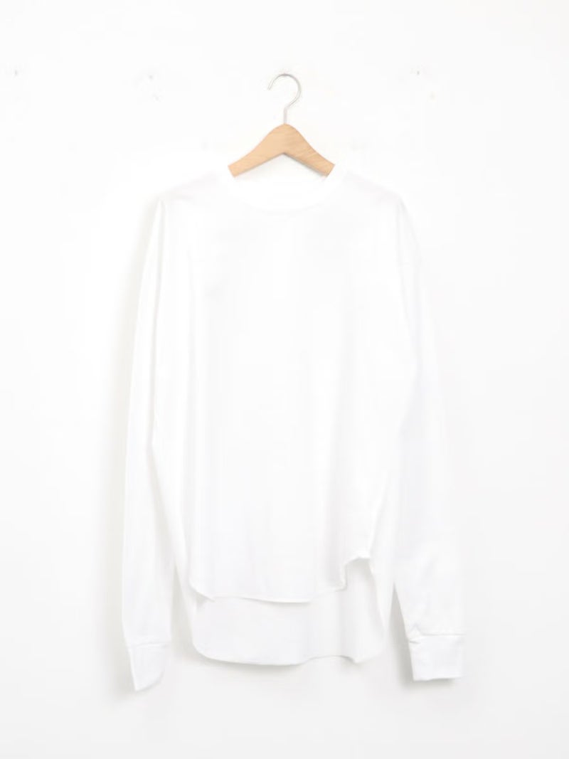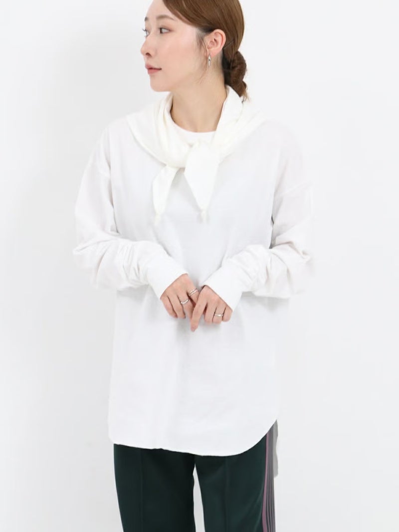 一枚でサマになるロニースコッツ別注ロンTee。 ゆるっとしたサイズ感と少し長めに設定した袖がルーズに見え過ぎないよう、袖口はフライスカフスで、袖をたくし上げた時に好きな位置にキープしやすくなっています。程よい厚さで透けにくいのも嬉しいポイントです。