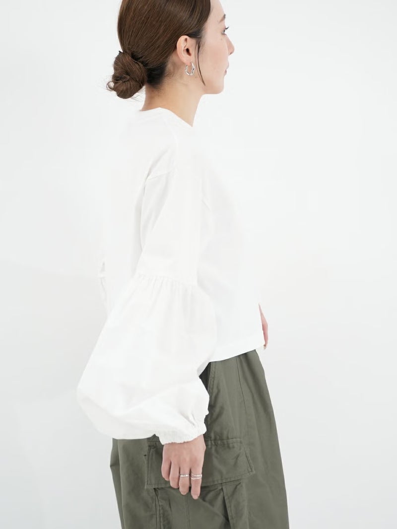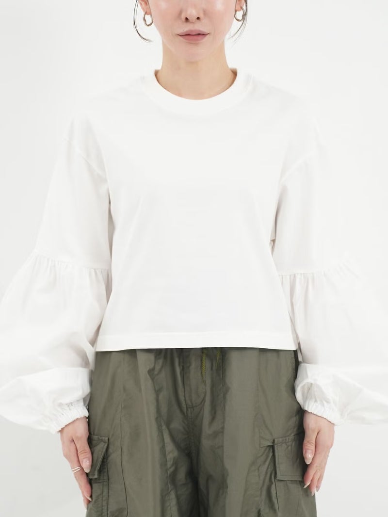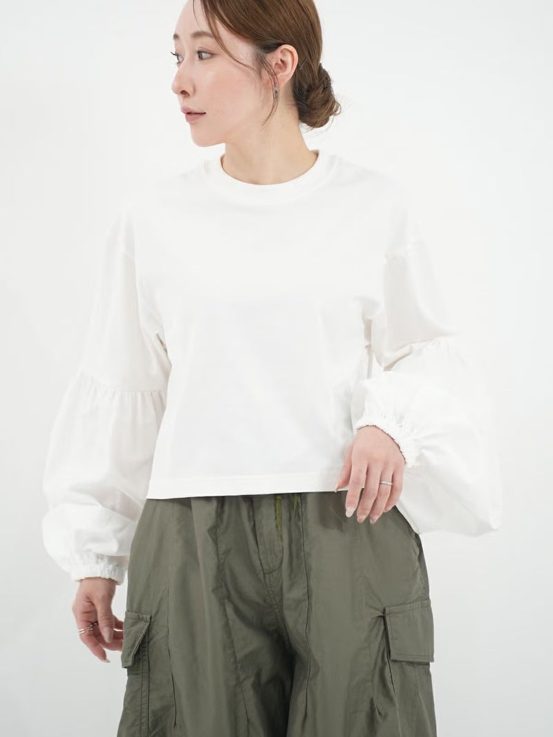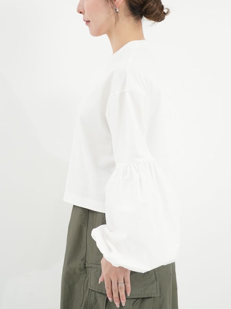 袖のパフスリーブと丈の短さがポイントのロニースコッツ別注カットソー。 ウエストインをせずにボリュームのあるボトムスとのバランスが取りやすい一枚。シンプルになりがちなワイドパンツとのコーディネートがオススメです。