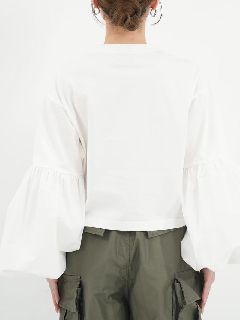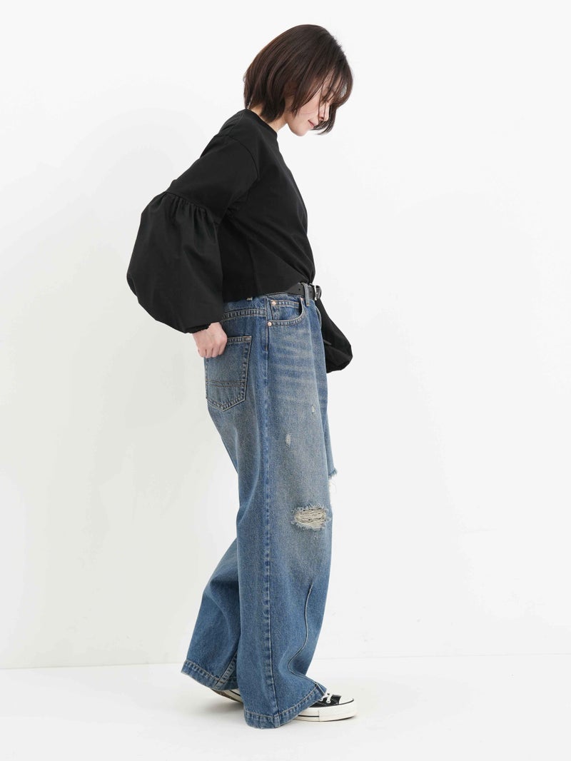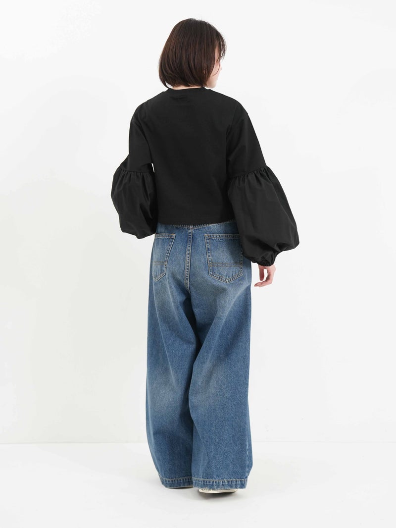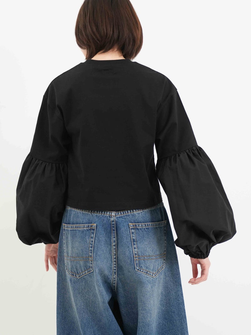 袖のパフスリーブと丈の短さがポイントのロニースコッツ別注カットソー。 ウエストインをせずにボリュームのあるボトムスとのバランスが取りやすい一枚。シンプルになりがちなワイドパンツとのコーディネートがオススメです。