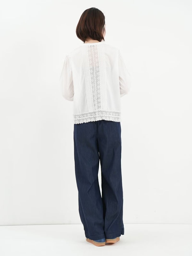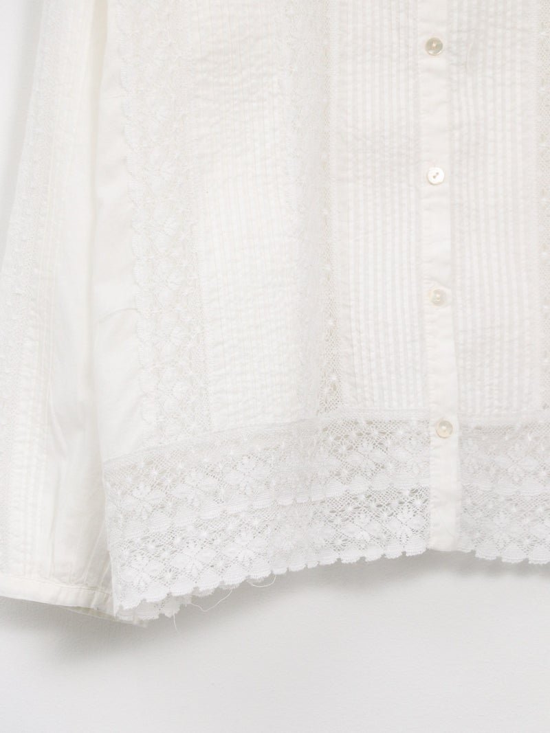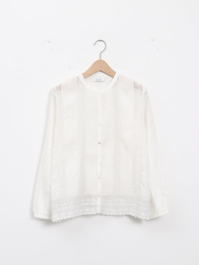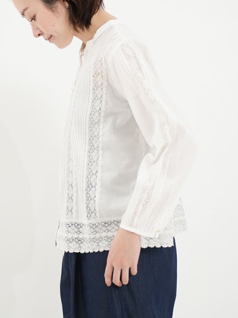 リバーレースをふんだんにあしらったクラフト感とフェミニンさのあるブラウス。 繊細な透け感と軽やかさが魅力のコットンボイルを使用。前身頃には細かなピンタックを施し、すっきりとした印象に。程よくゆとりのあるシルエットで羽織としても活躍します。