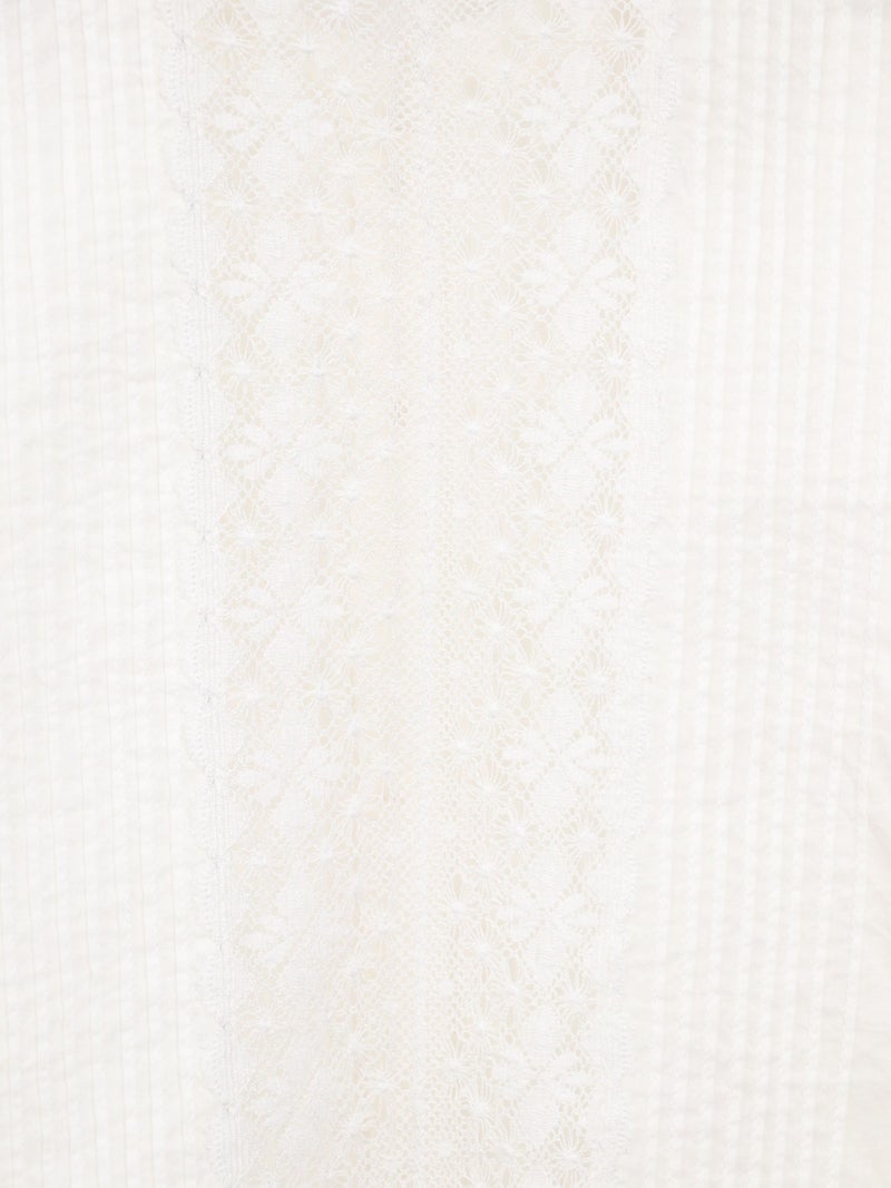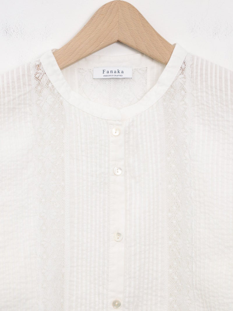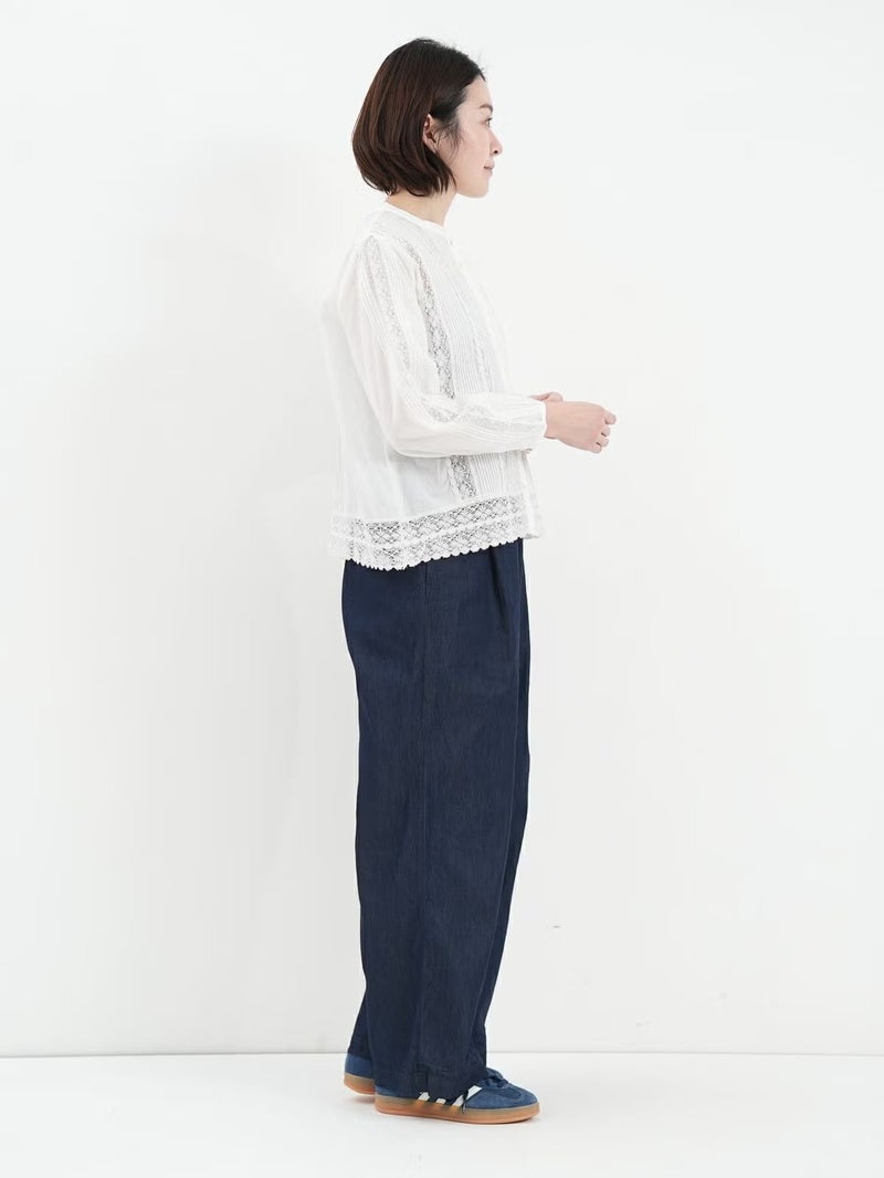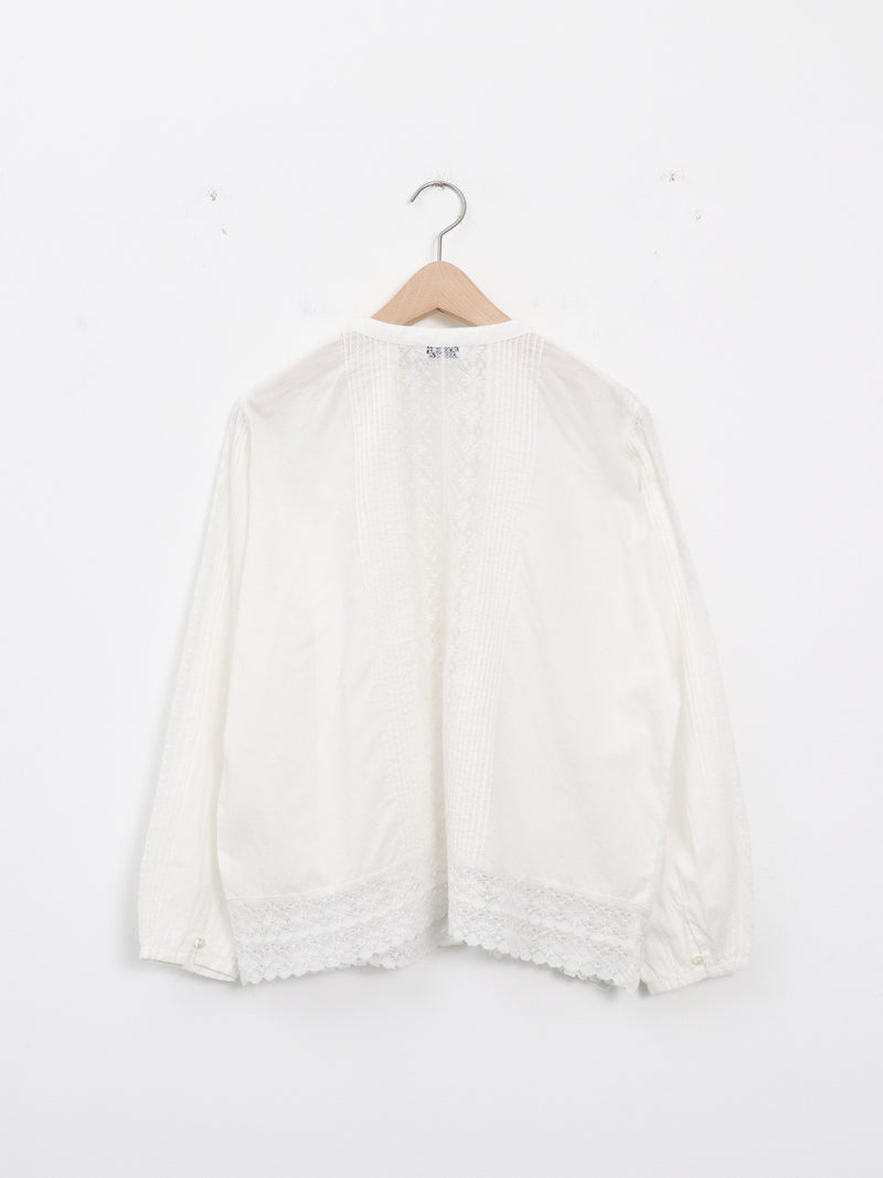 リバーレースをふんだんにあしらったクラフト感とフェミニンさのあるブラウス。 繊細な透け感と軽やかさが魅力のコットンボイルを使用。前身頃には細かなピンタックを施し、すっきりとした印象に。程よくゆとりのあるシルエットで羽織としても活躍します。