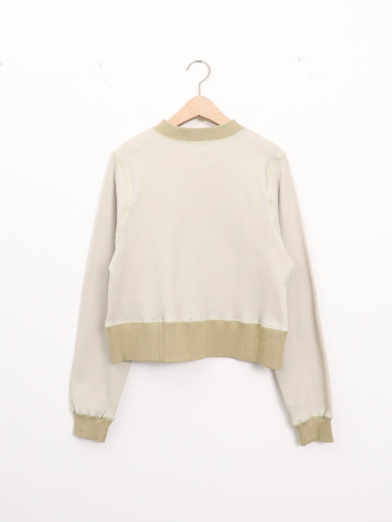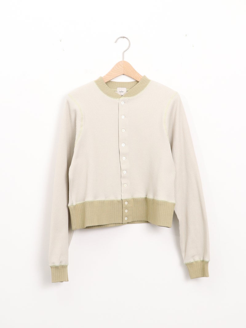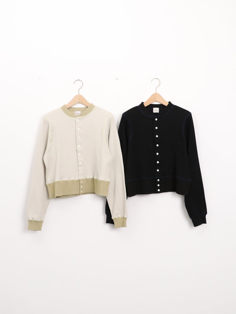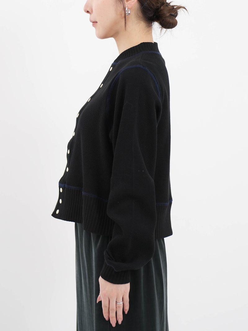 ステッチの配色がポイントのワッフルクロップドカーディガン。 コンパクトな丈感ながら身幅やアームホールにはゆとりがあるため着まわしが効きます。ボタンを閉めてプルオーバーライクにも◎気温差のある季節にも取り入れやすいアイテムです。