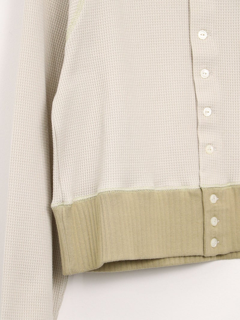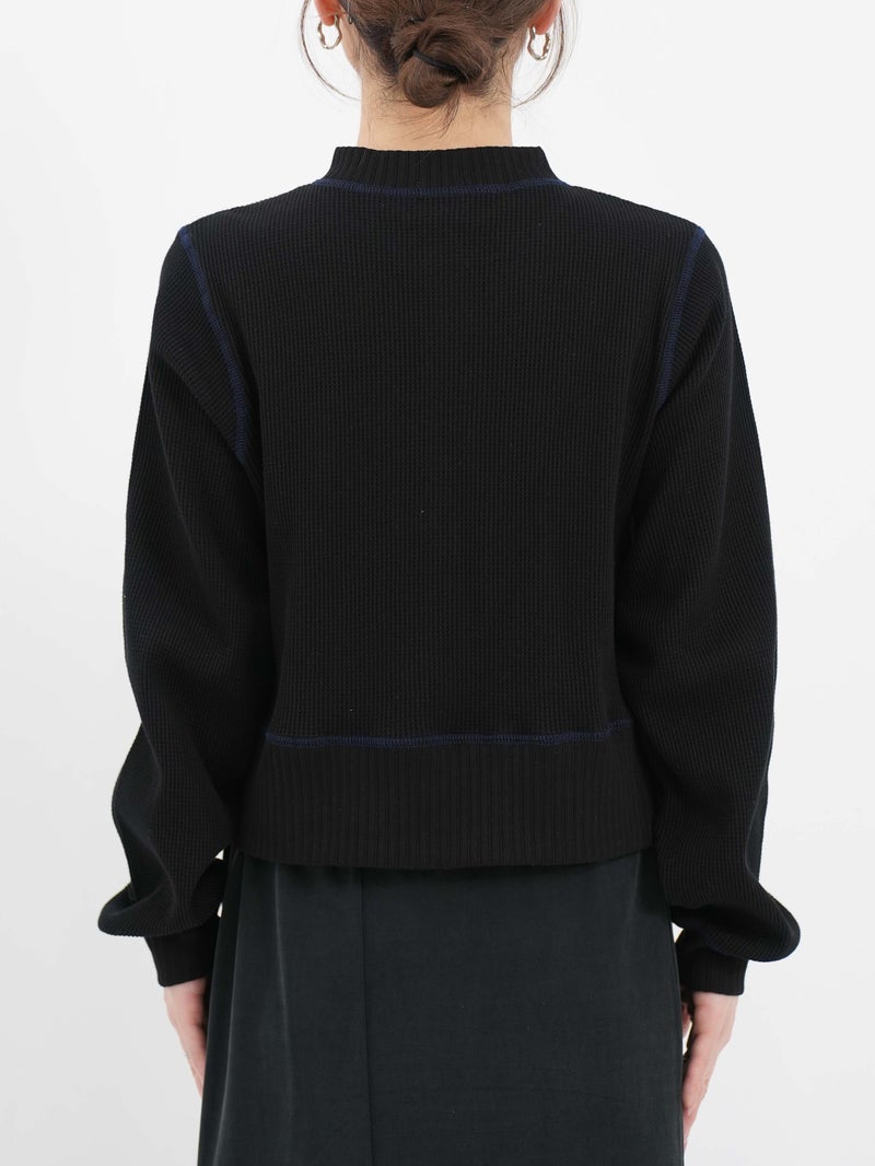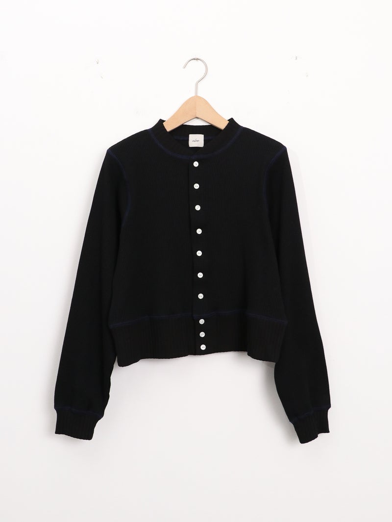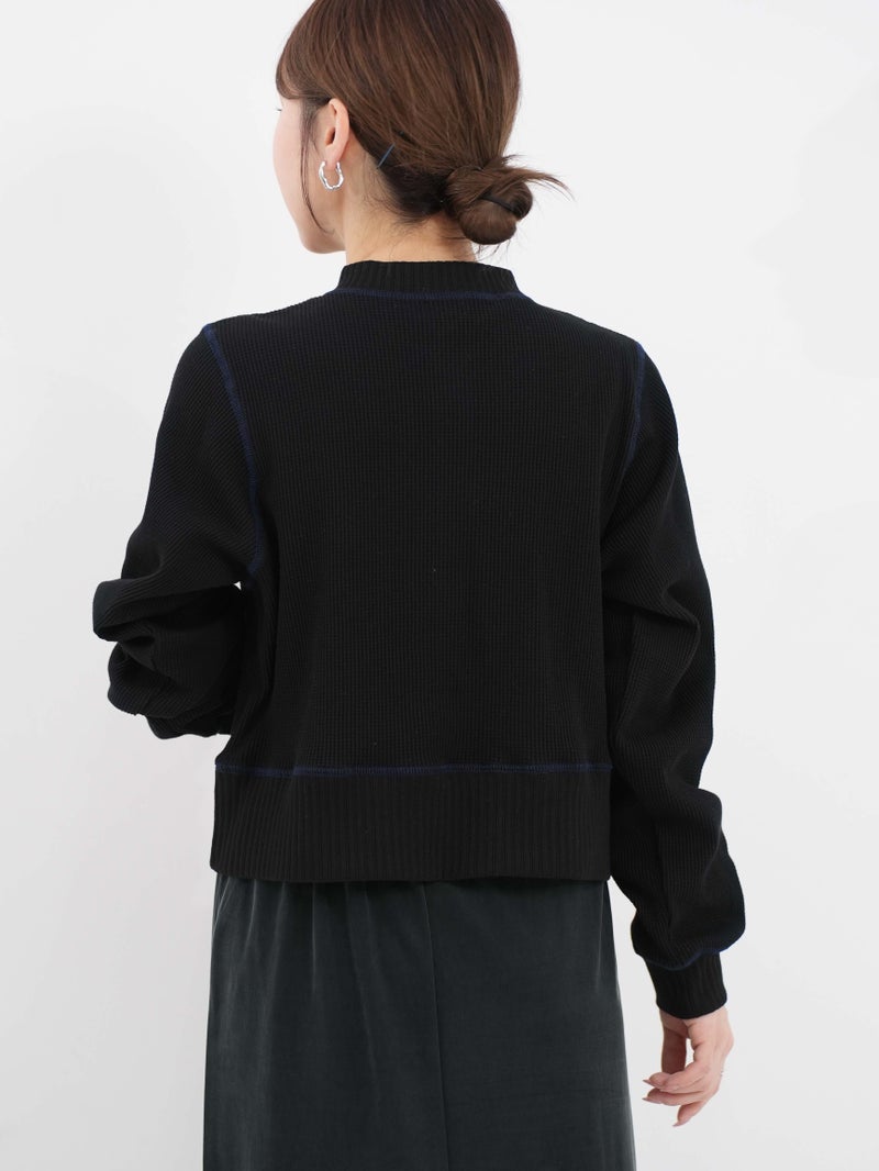 ステッチの配色がポイントのワッフルクロップドカーディガン。 コンパクトな丈感ながら身幅やアームホールにはゆとりがあるため着まわしが効きます。ボタンを閉めてプルオーバーライクにも◎気温差のある季節にも取り入れやすいアイテムです。