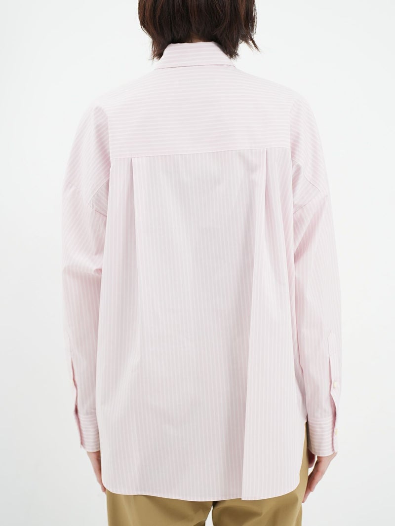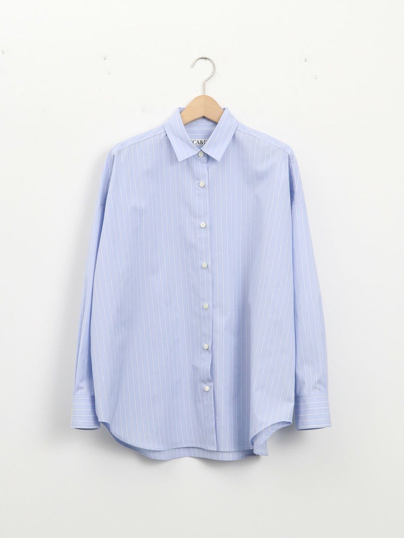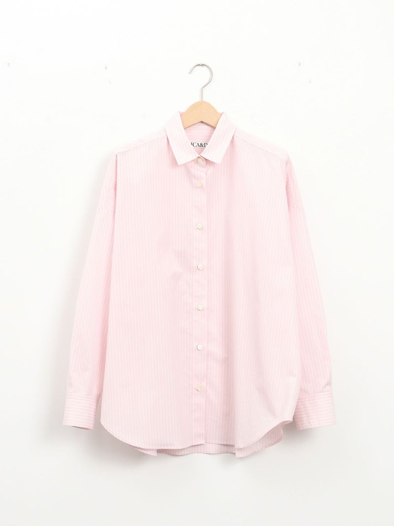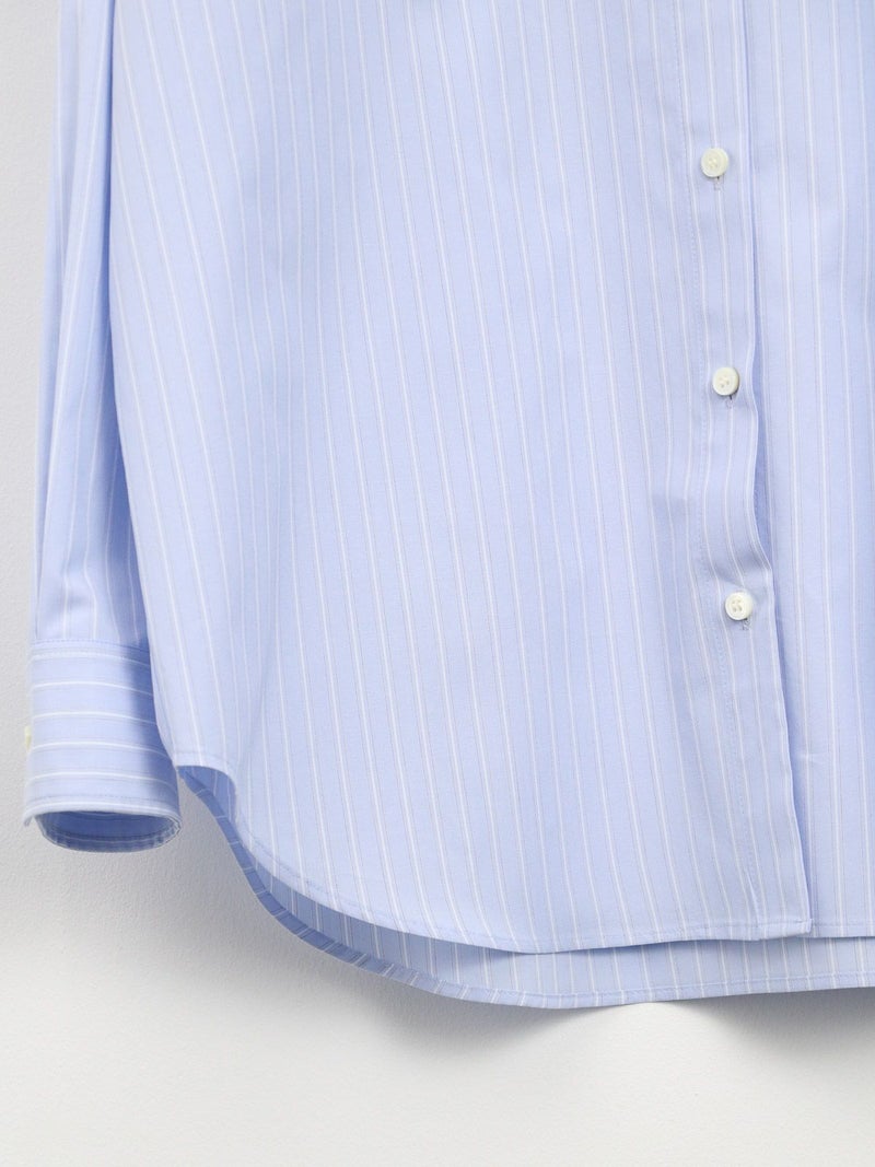 ベーシックで着回し力の高いストライプシャツ。 程よくオーバーサイズなシルエットで、体のラインを拾わずリラックスした着心地。裾のカッティングにこだわり、羽織り・インナー・1枚着と、幅広いスタイリングに対応するデザインに仕上げました。シーズンを問わず活躍し、ワードローブに欠かせない万能アイテムです。