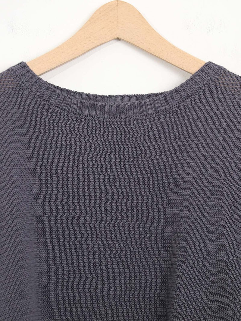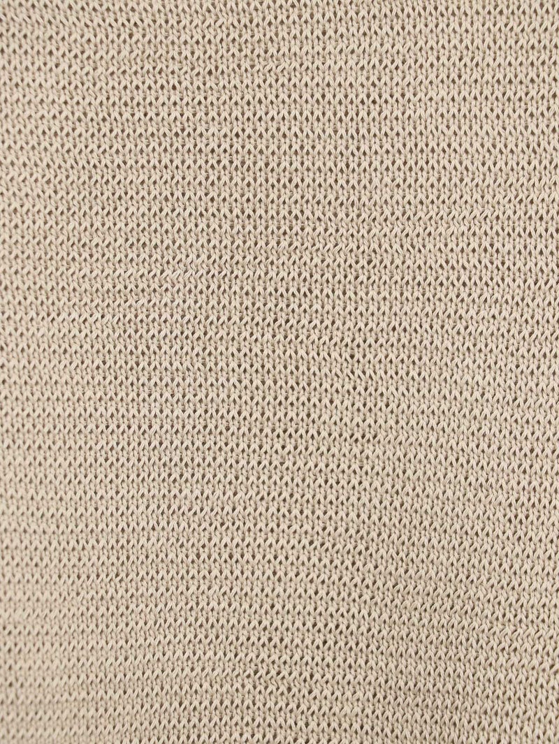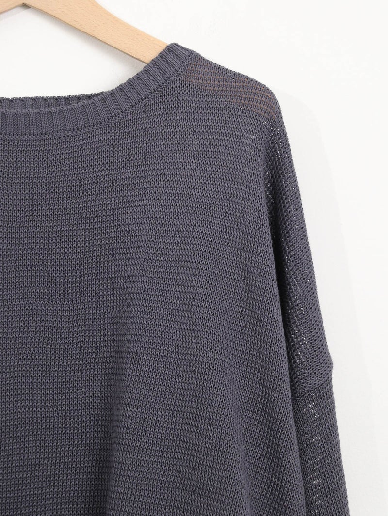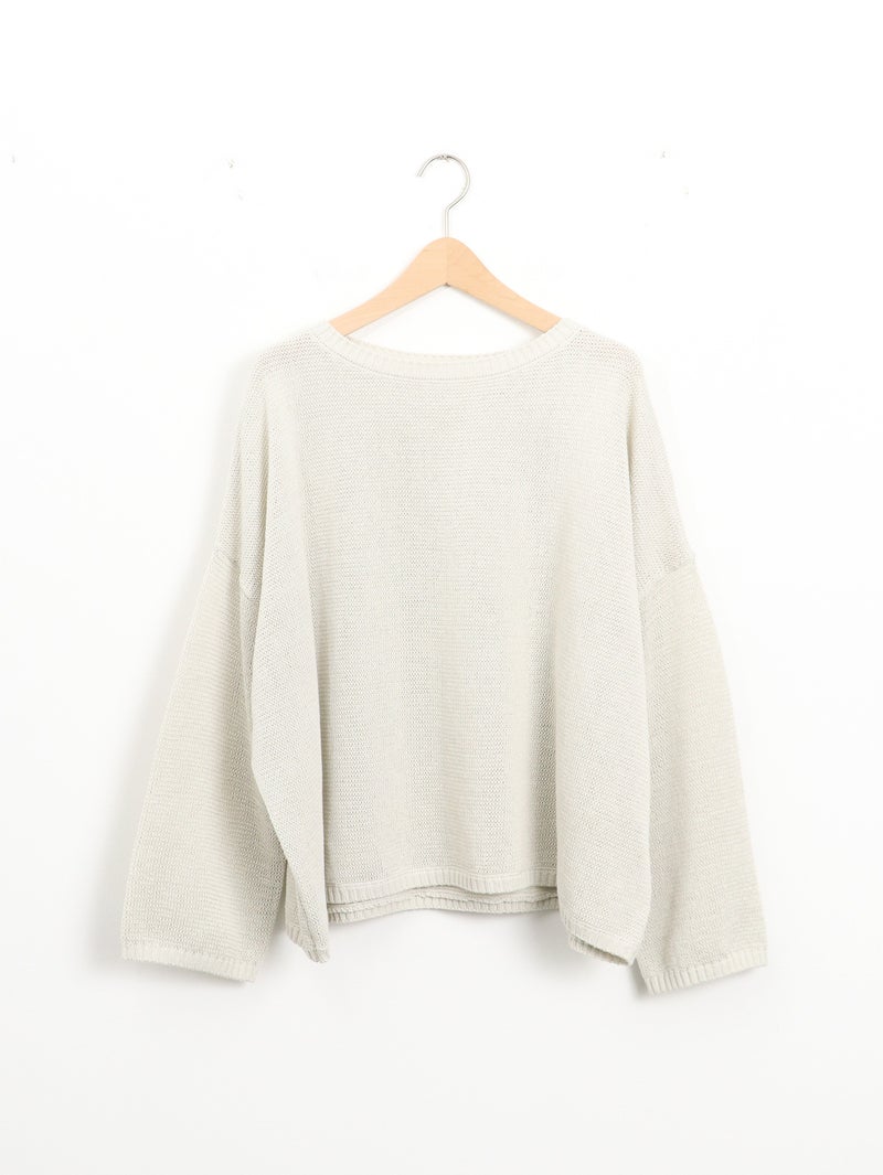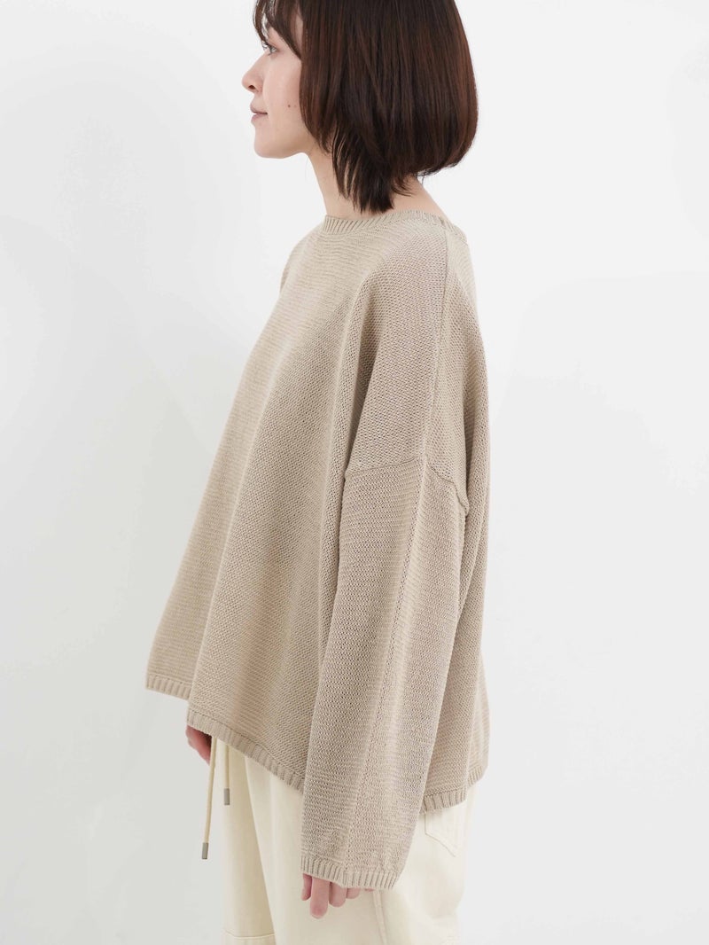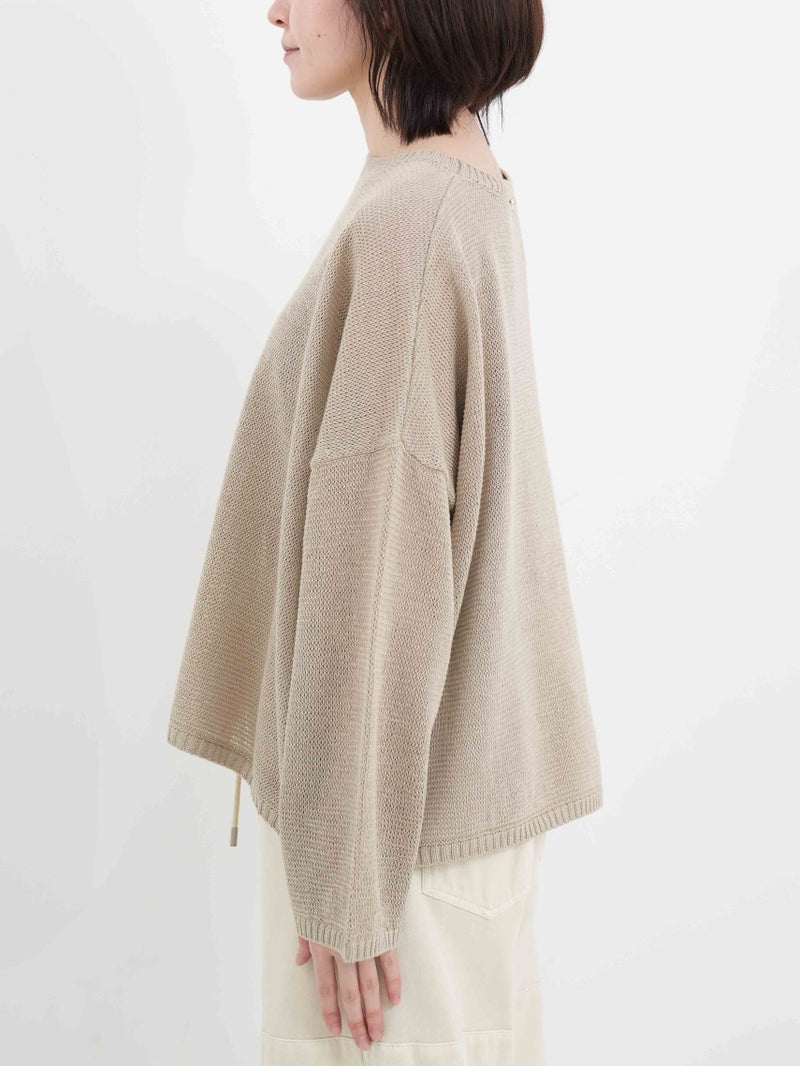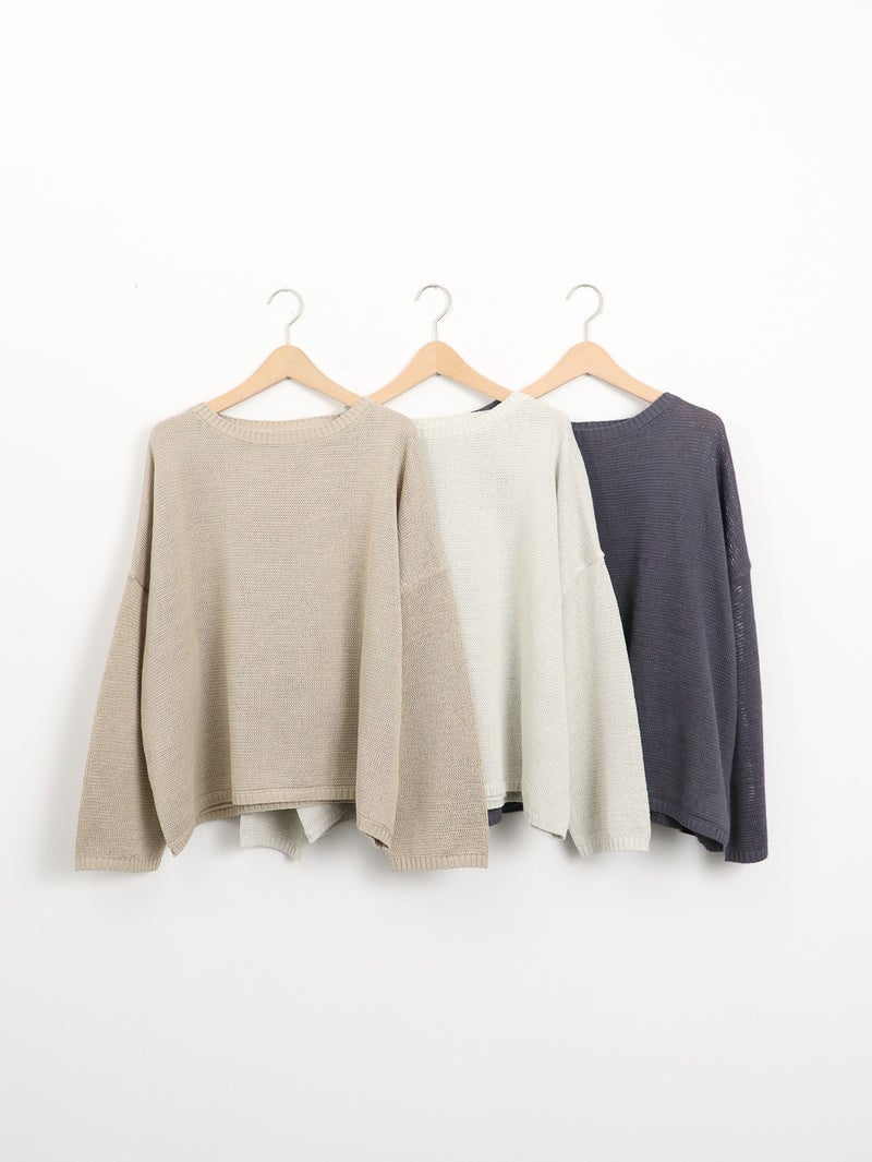 蒟蒻を原料とした特殊な樹脂を糸に固着させることにより麻に使いシャリ感を演出した、編み地に表情のあるプルオーバー。 程よい透け感がシーズンムード漂う1枚です。ネックは少しカーブのあるボートネックになっており女性らしい雰囲気に仕上げています。