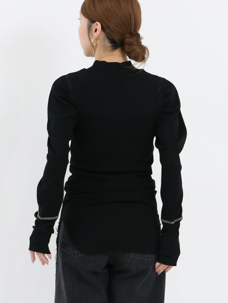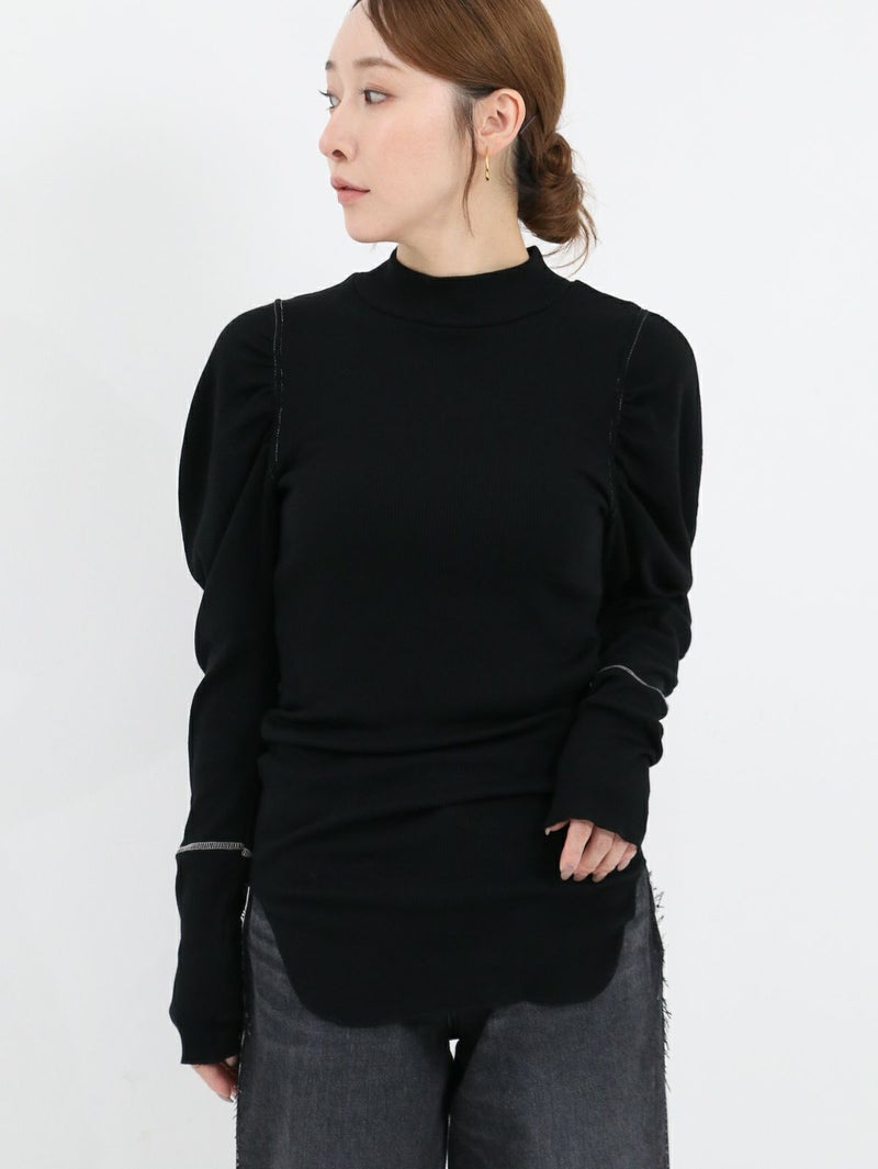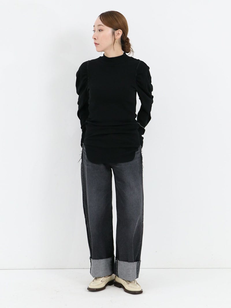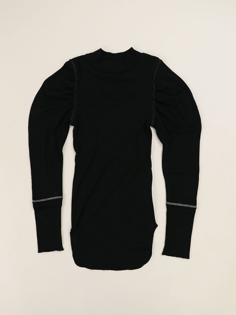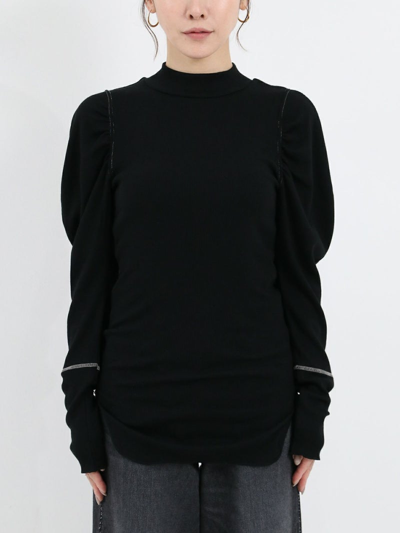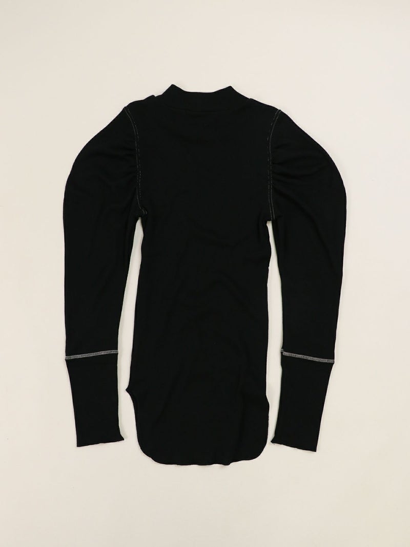 伸縮性のある細いリブ生地を使用したリブパフスリーブカットソー。 袖や裾のデザインと飾り縫いがポイントです。柔らかい生地感なので重ね着もでき、一枚でも様になります。女性らしい雰囲気のトップスなのでベーシックなベイカーパンツやデニムに合わせても相性良く、トラッドなベストやワークなアイテムにも合います。