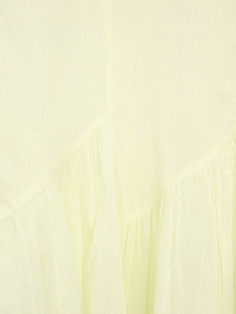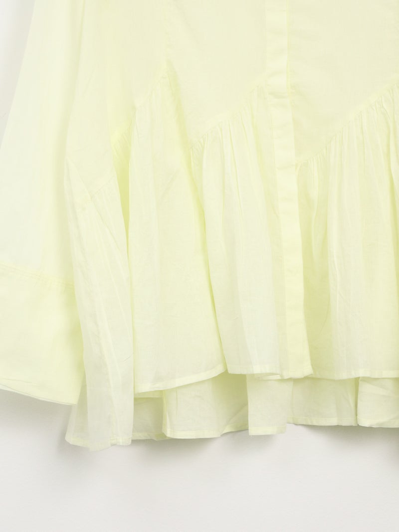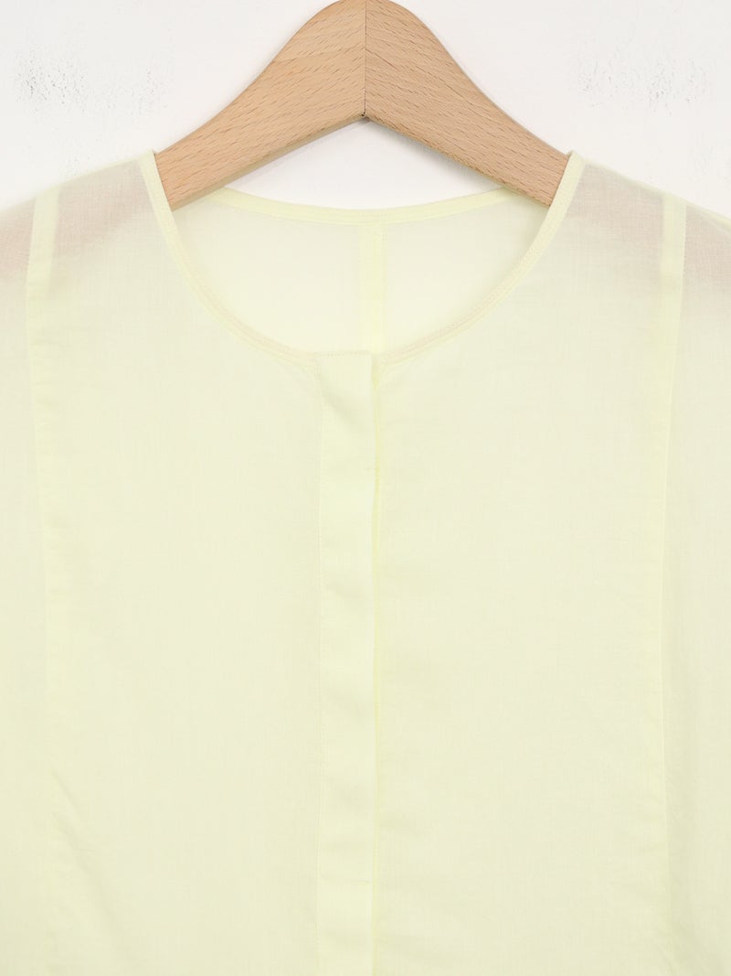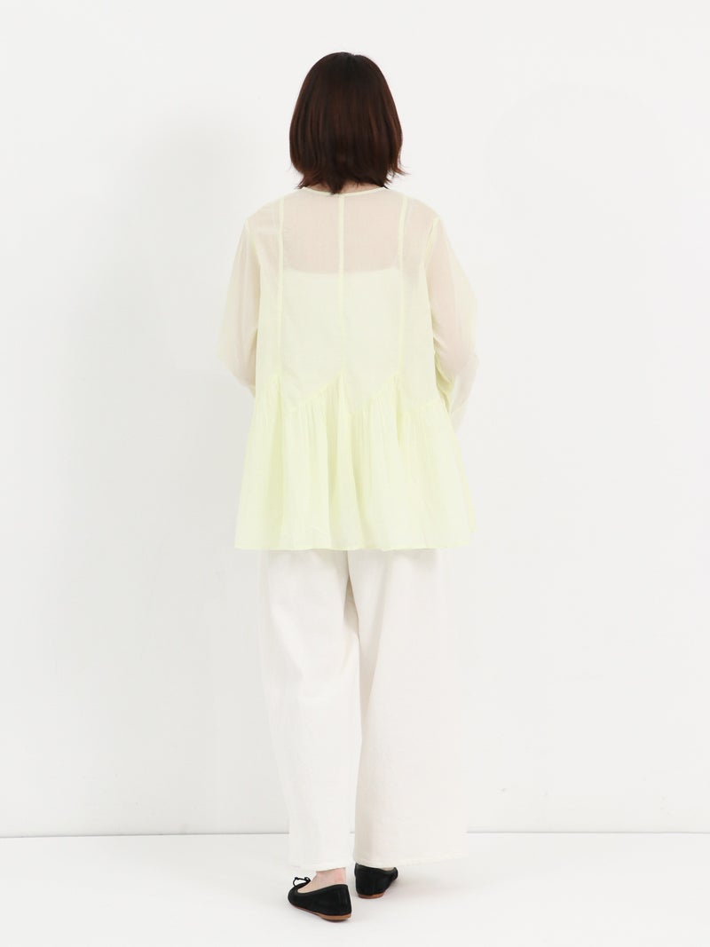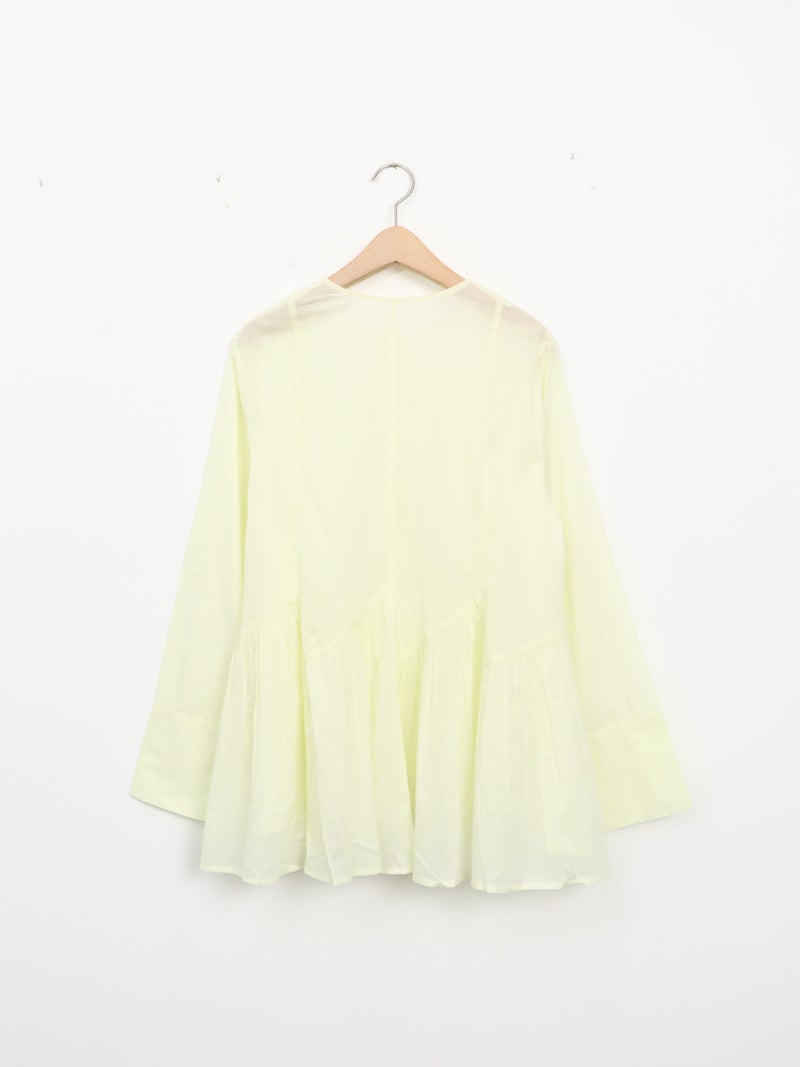 透け感のある薄手のコットンボイルの柔らかなブラウス。 ギャザーの切り替えが斜めに切り上がり、シルエットに動きが出て新鮮な表情に。テキスタイルの心地よい肌触りを存分に感じていただける一枚仕立て。やや後ろ下がりのデザインでボトムスを選ばず、ボタンを開けて、タンクトップやキャミソールの上から羽織るようにひらりと着るのもオススメです。