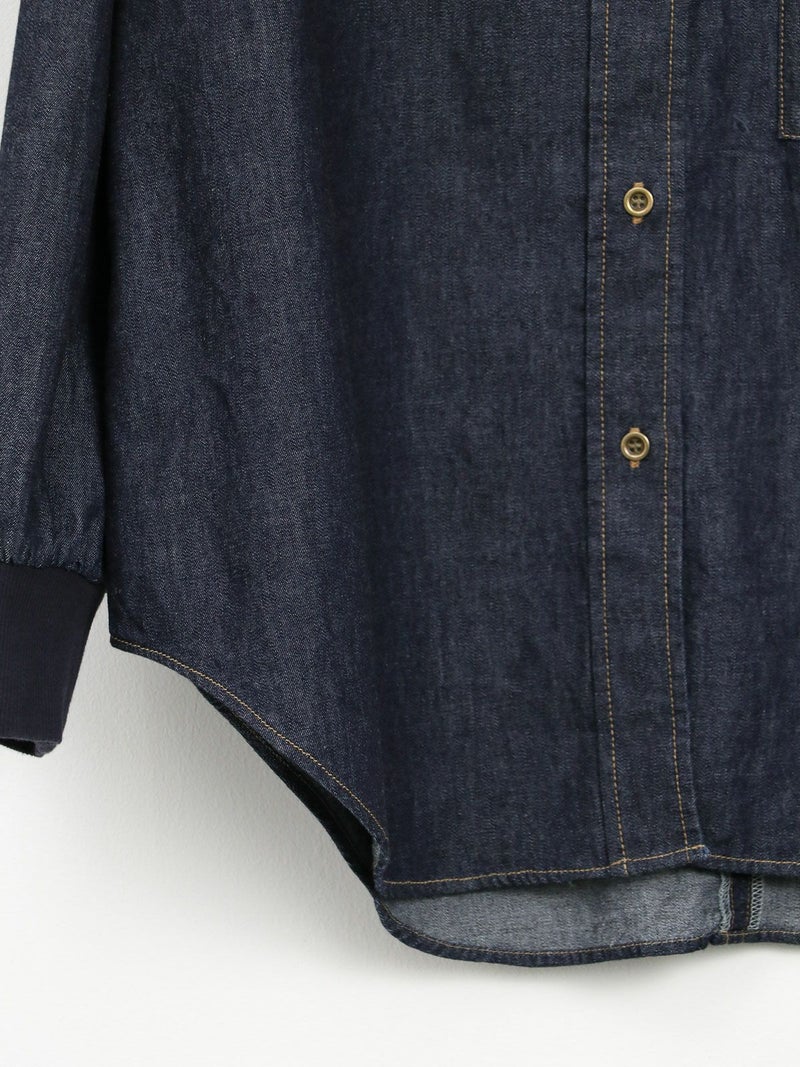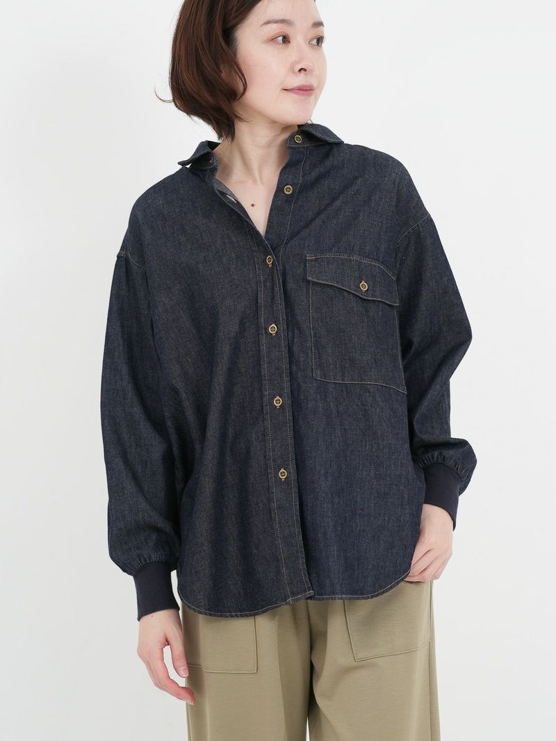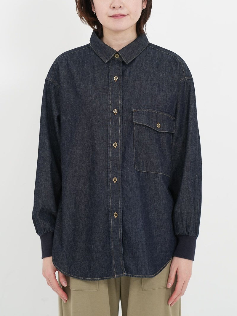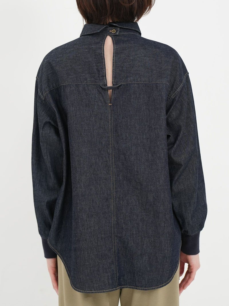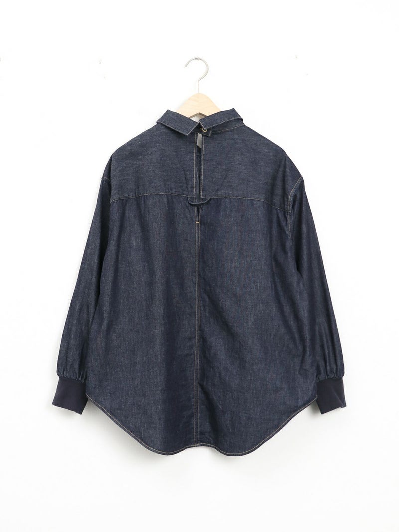 ロングセラーのデニムシャツを袖口リブ仕様にアレンジした6ozデニムシャツ。 程良くゆとりのあるサイジングでリラックスした雰囲気になります。後ろ衿をボタンで留めることによりスリットになり、カジュアル過ぎず女性らしさも演出できます。