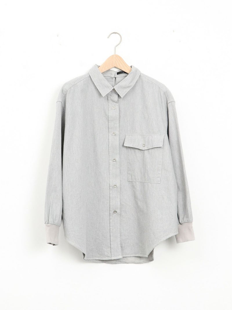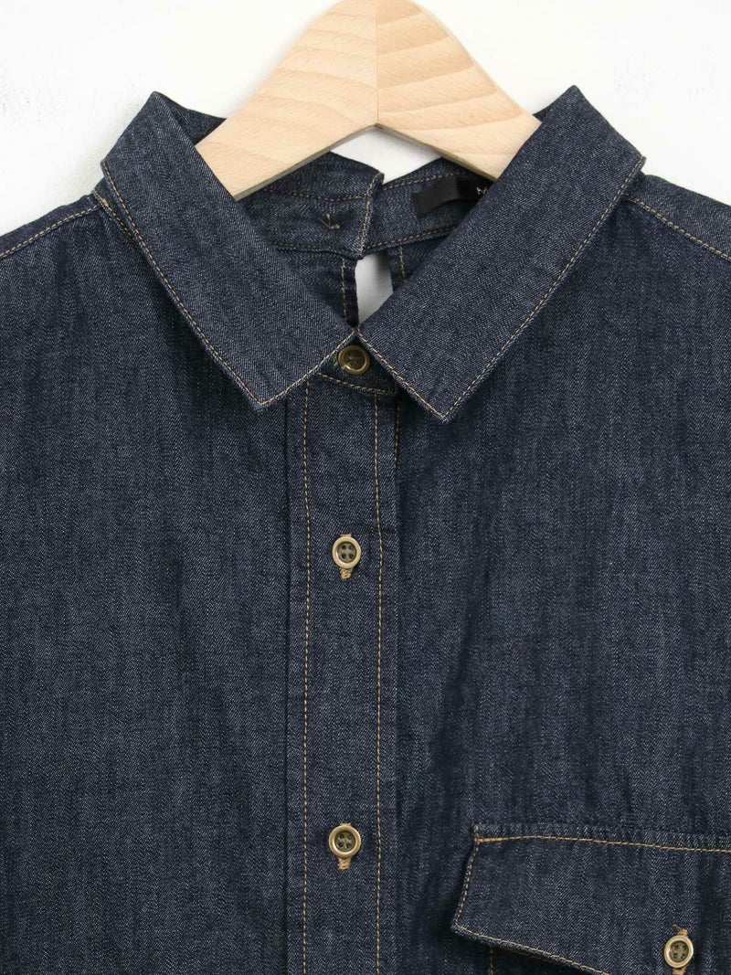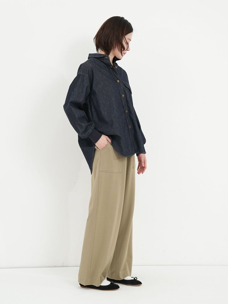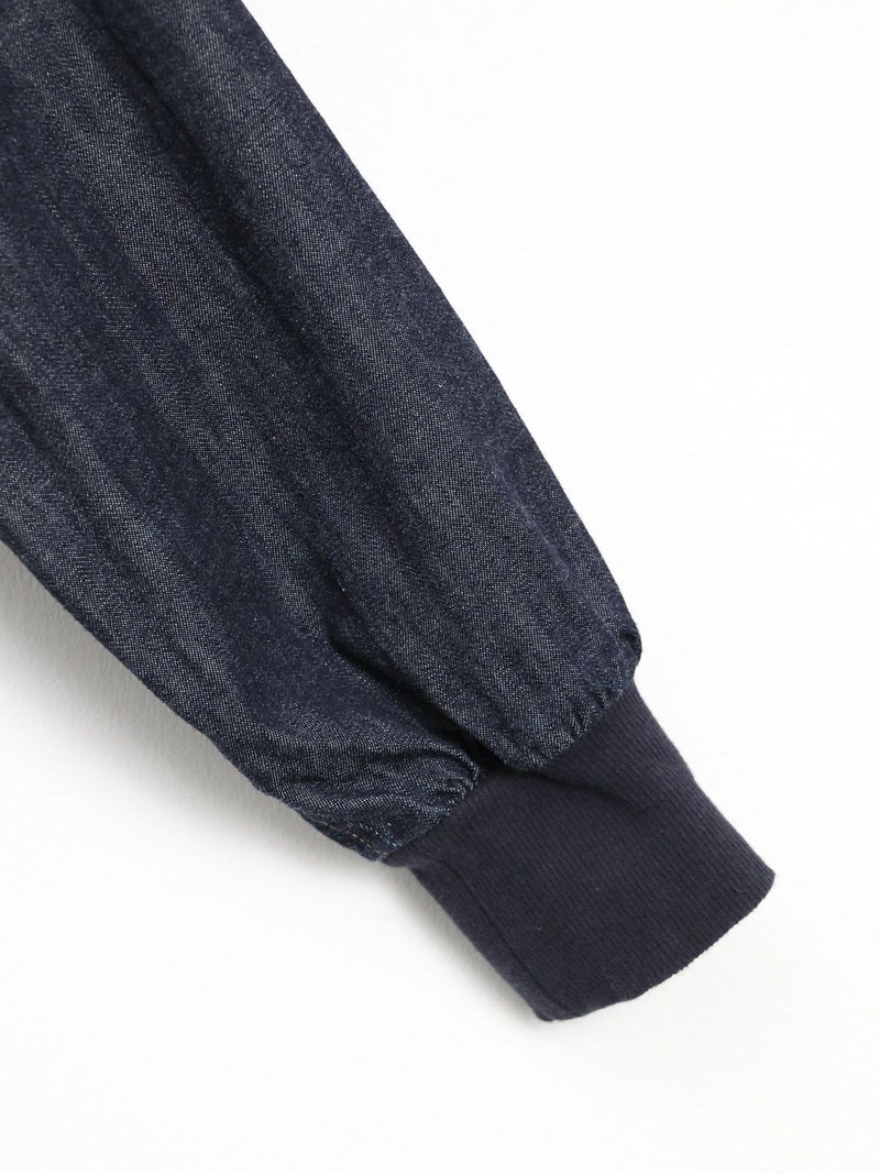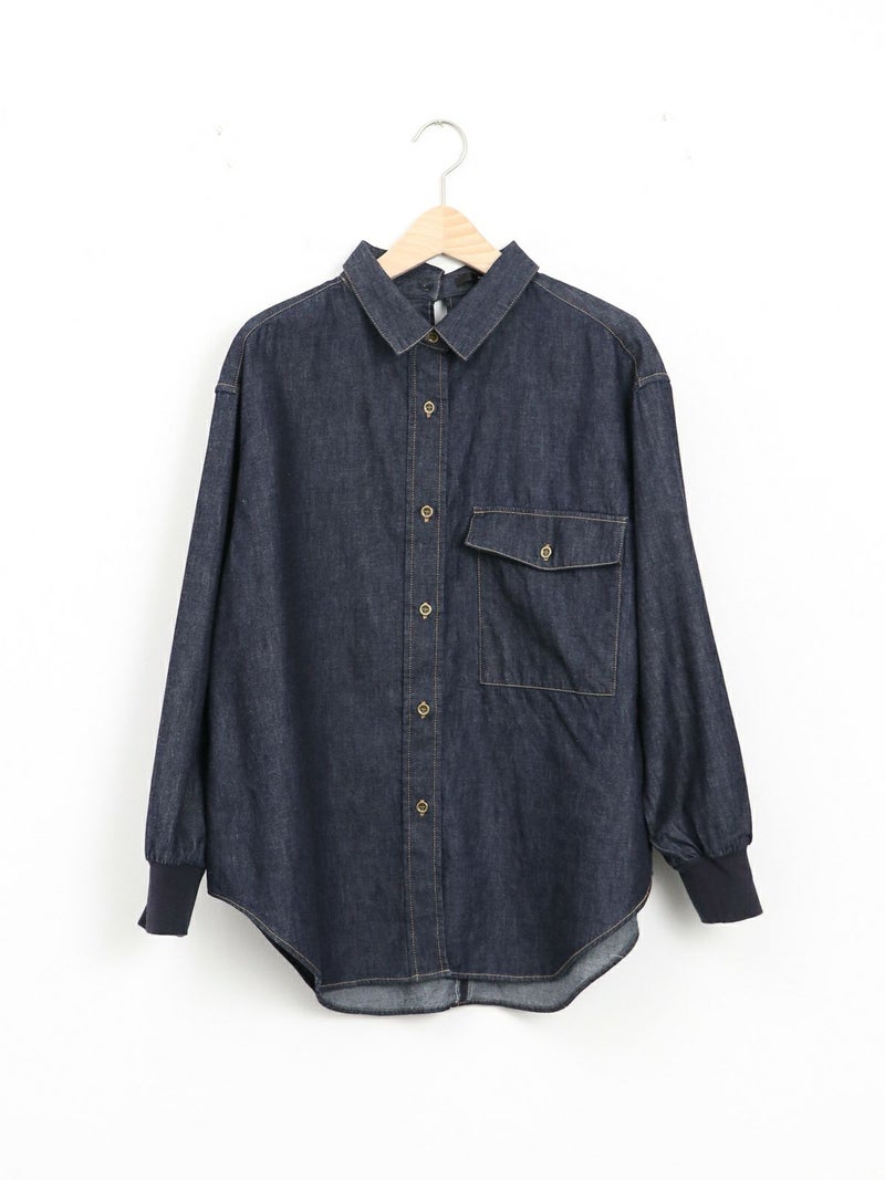 ロングセラーのデニムシャツを袖口リブ仕様にアレンジした6ozデニムシャツ。 程良くゆとりのあるサイジングでリラックスした雰囲気になります。後ろ衿をボタンで留めることによりスリットになり、カジュアル過ぎず女性らしさも演出できます。