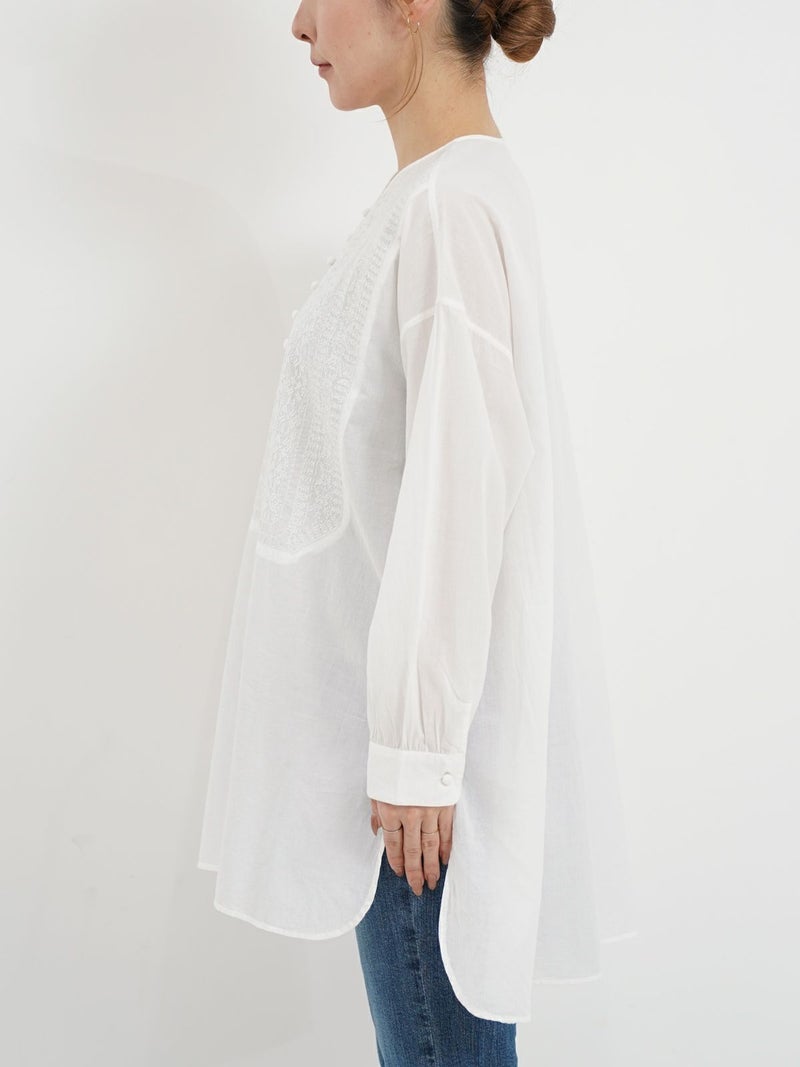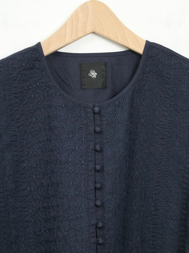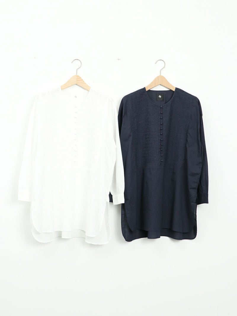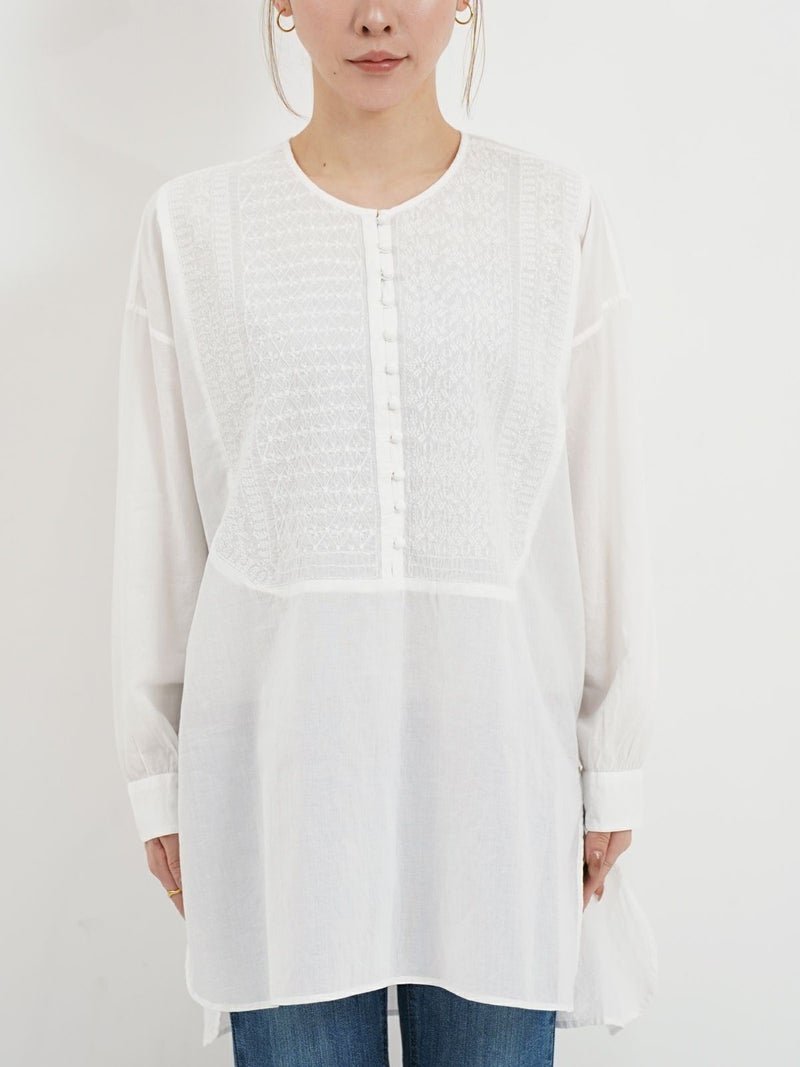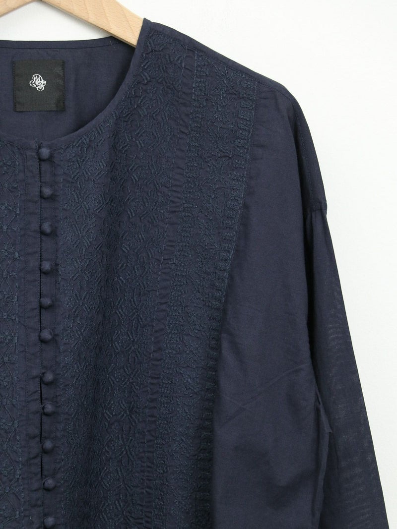 可愛らしい包みボタンをあしらったプルオーバータイプのブラウス。 絵を描くように表現した繊細な刺繍は、職人さんの技術の高さと手仕事による温もりを感じさせる贅沢な一品です。