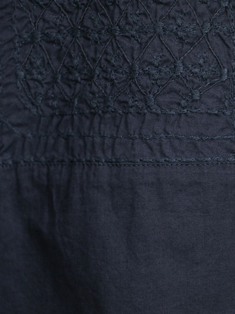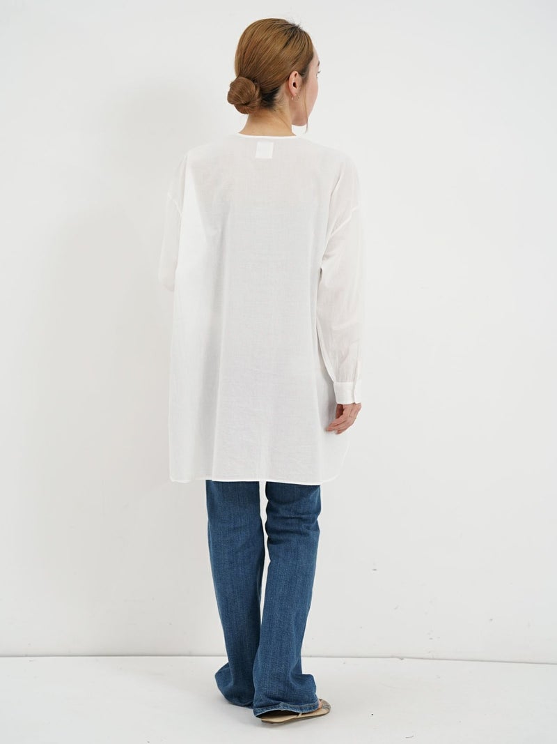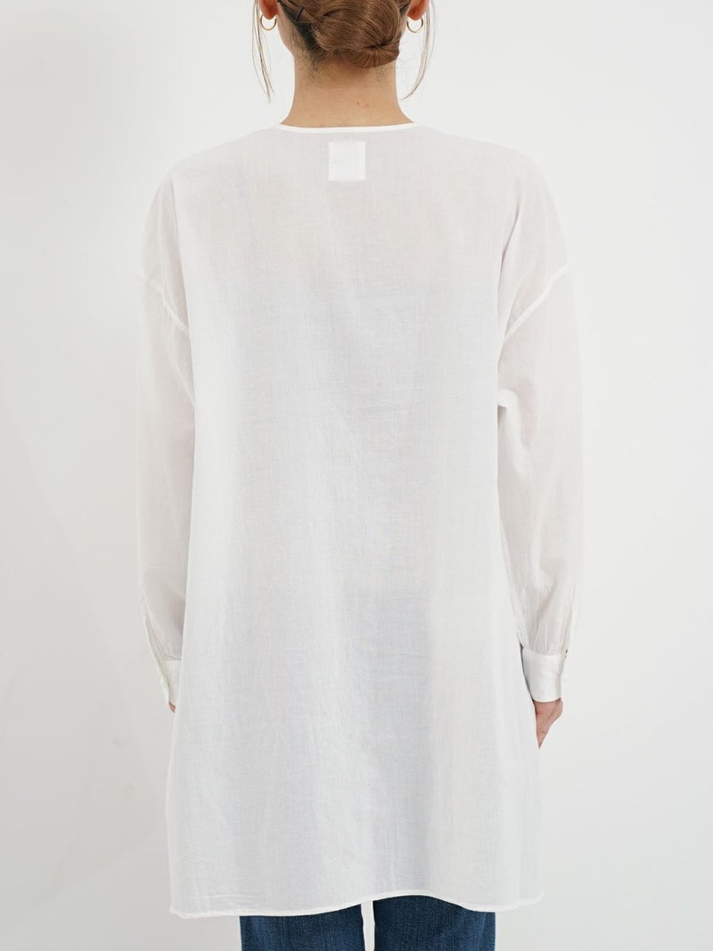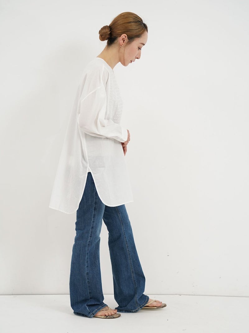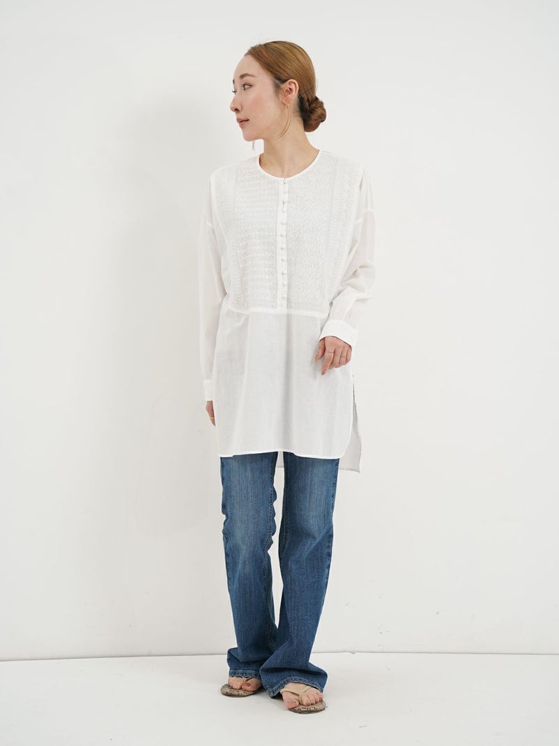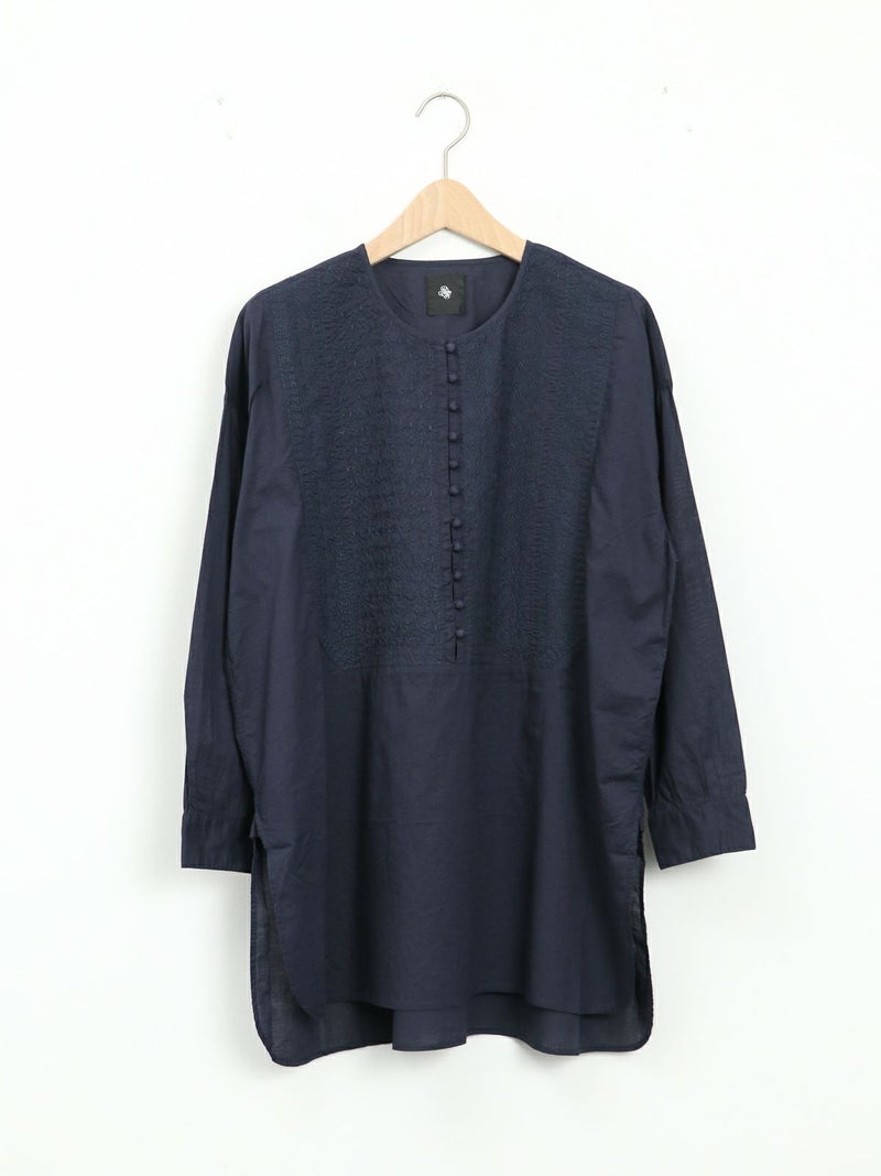 可愛らしい包みボタンをあしらったプルオーバータイプのブラウス。 絵を描くように表現した繊細な刺繍は、職人さんの技術の高さと手仕事による温もりを感じさせる贅沢な一品です。