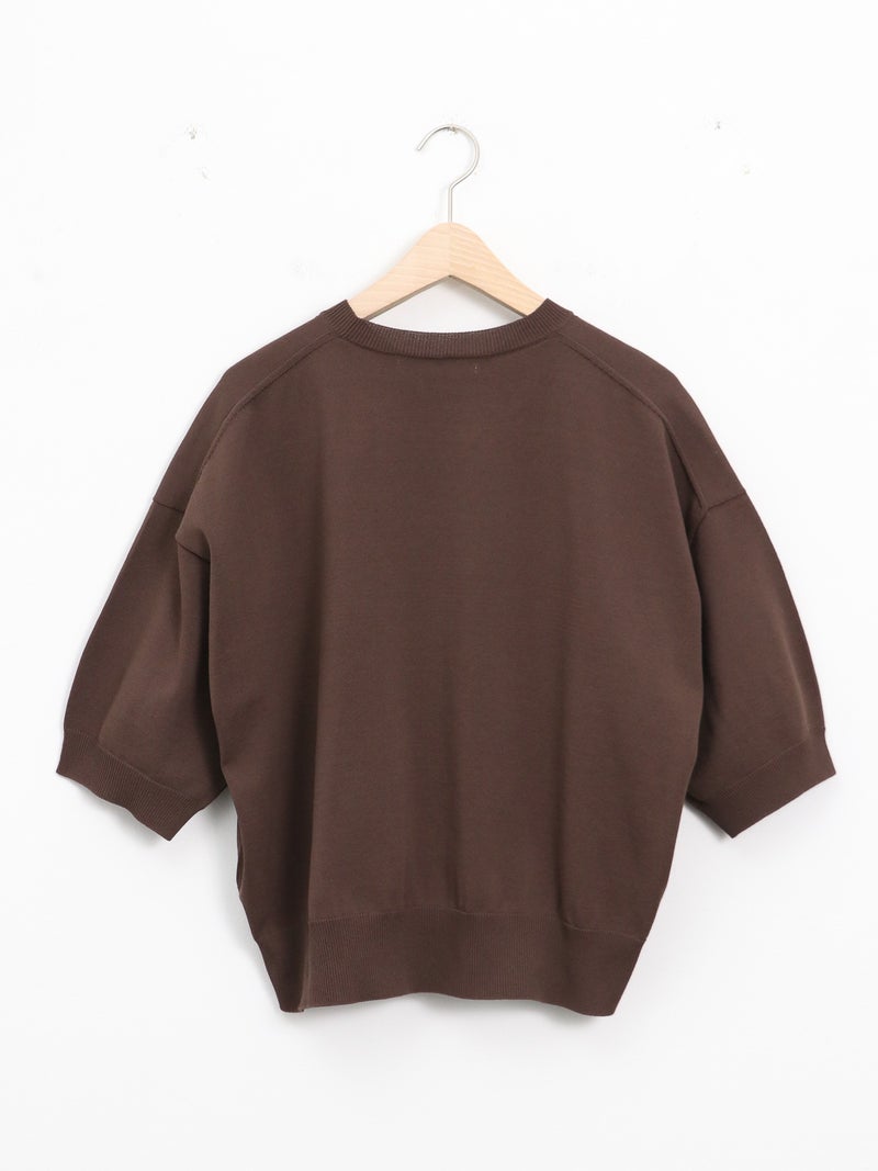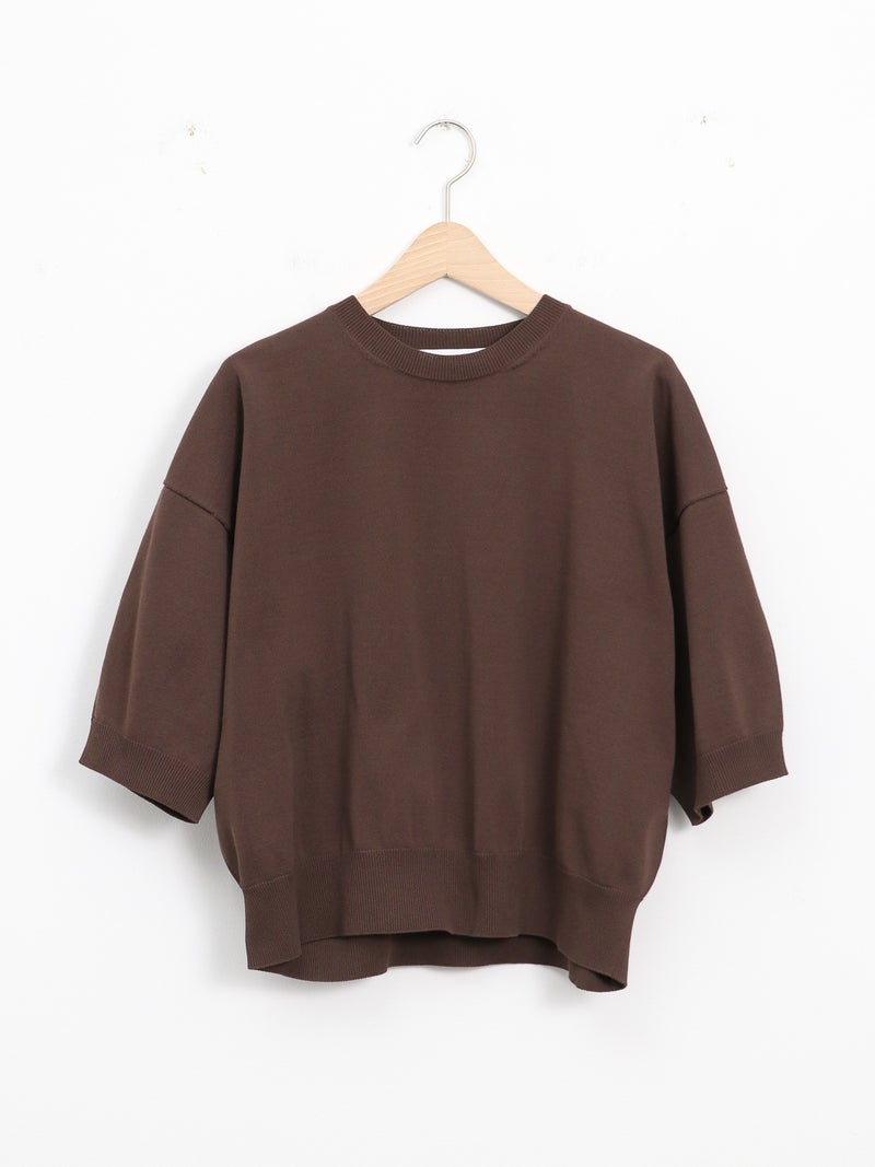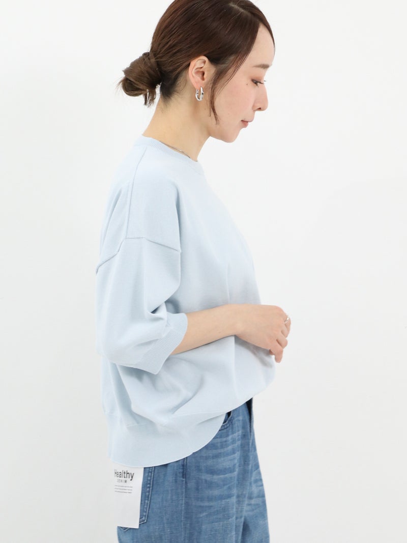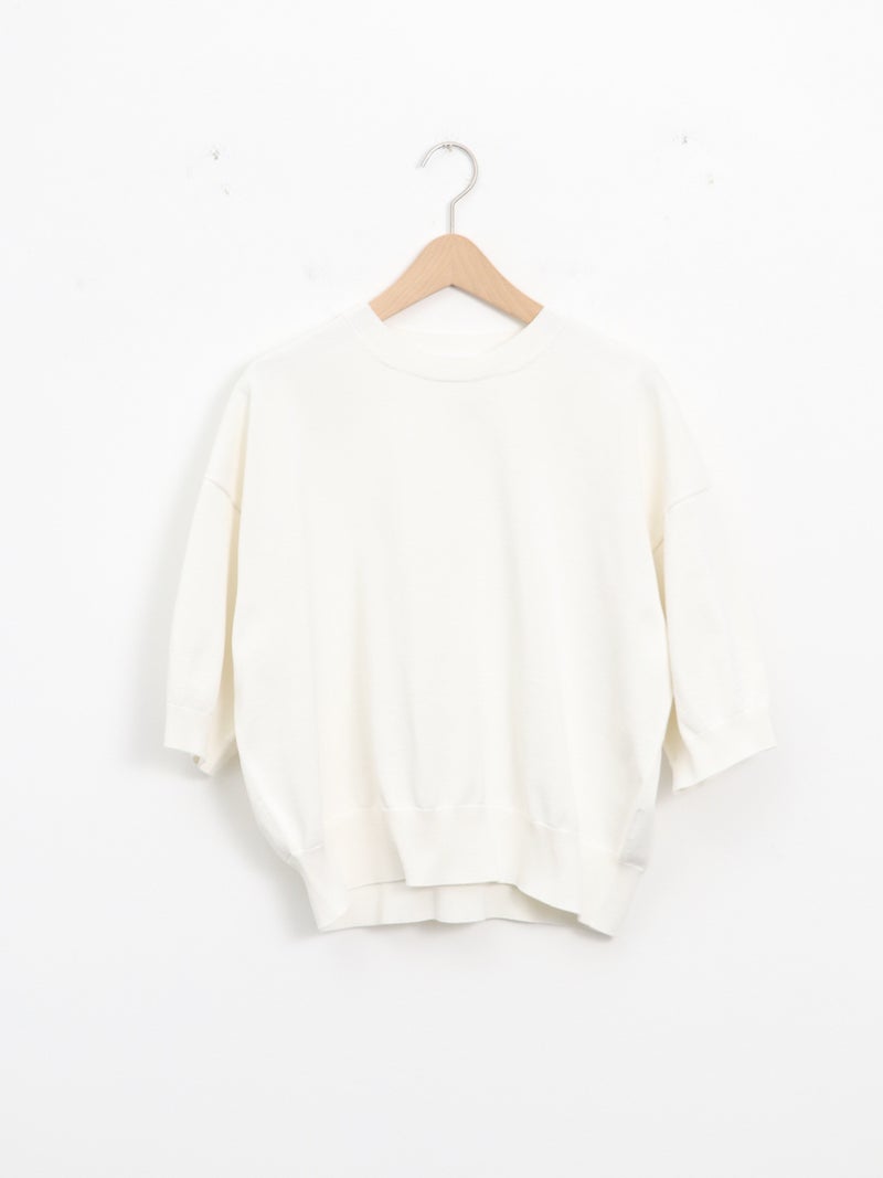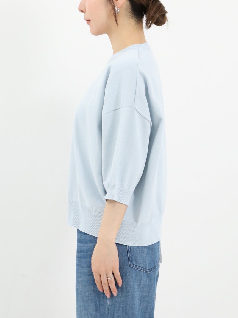 縫い目のないホールガーメント製法で仕立てた、ストレスフリーな着心地のプルオーバー。 コットンとポリエステルを半分ずつブレンドした素材を使用し、軽やかさと型崩れしにくい扱いやすさを両立しました。無縫製ならではの立体的なシルエットが体に優しく馴染み、滑らかで綺麗なラインを演出します。二の腕を上品にカバーする五分袖のデザインは、一枚着としてはもちろん、季節の変わり目のインナーとしても重宝。シンプルながらも洗練された、デイリーに頼れる上質な一着です。