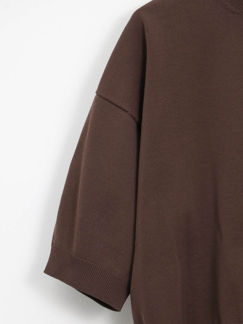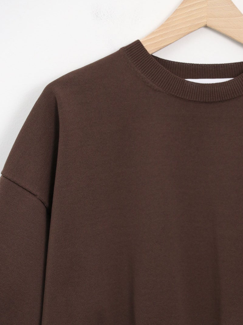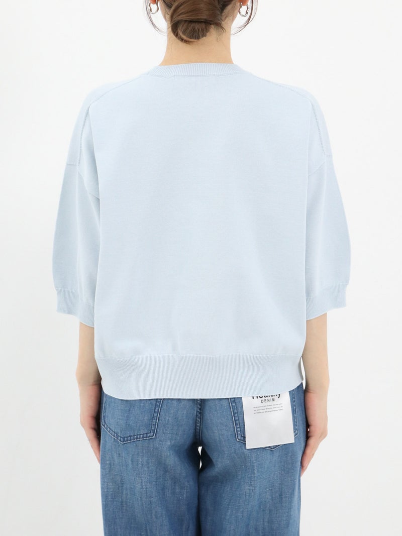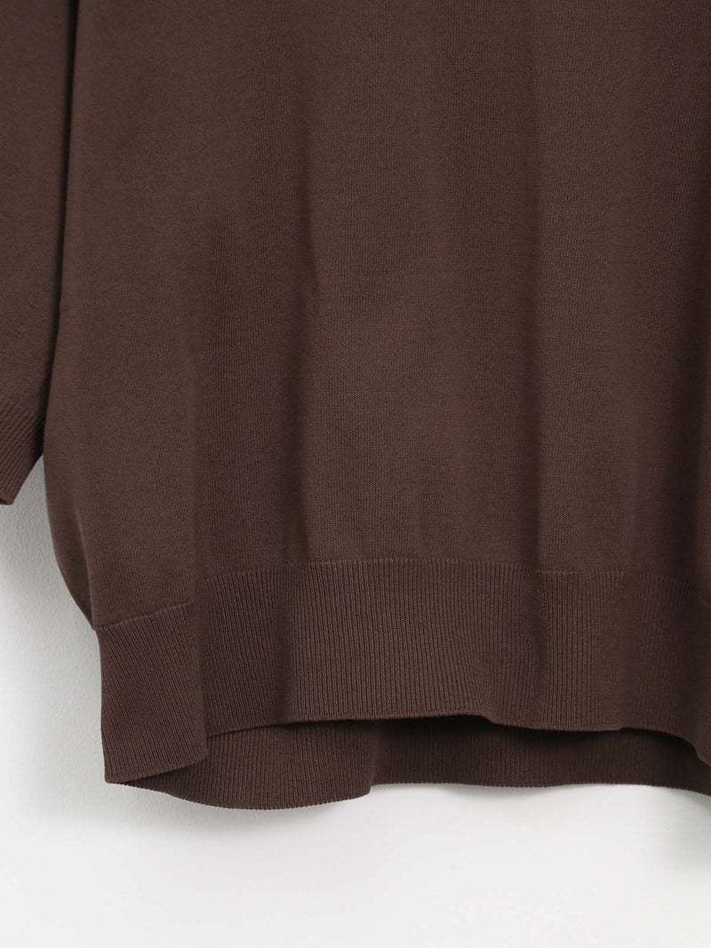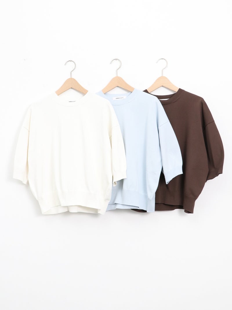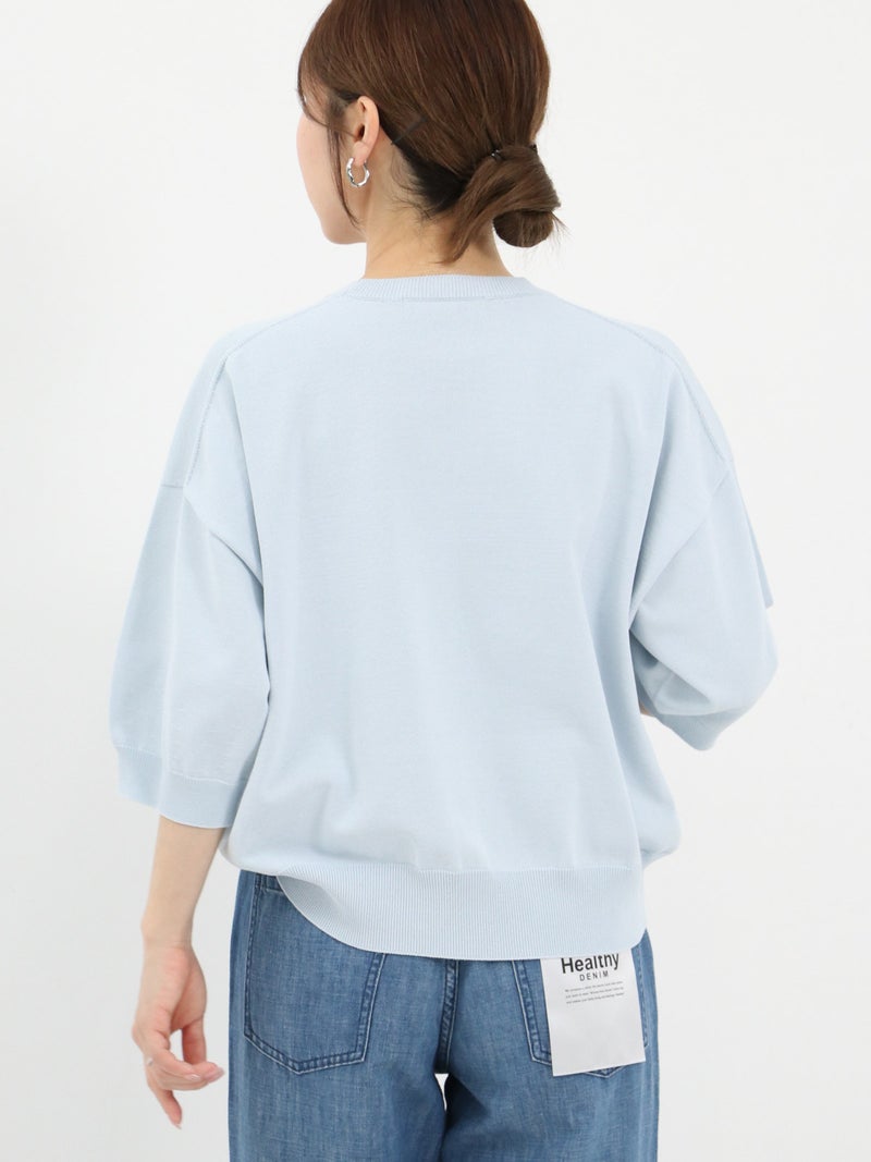 縫い目のないホールガーメント製法で仕立てた、ストレスフリーな着心地のプルオーバー。 コットンとポリエステルを半分ずつブレンドした素材を使用し、軽やかさと型崩れしにくい扱いやすさを両立しました。無縫製ならではの立体的なシルエットが体に優しく馴染み、滑らかで綺麗なラインを演出します。二の腕を上品にカバーする五分袖のデザインは、一枚着としてはもちろん、季節の変わり目のインナーとしても重宝。シンプルながらも洗練された、デイリーに頼れる上質な一着です。