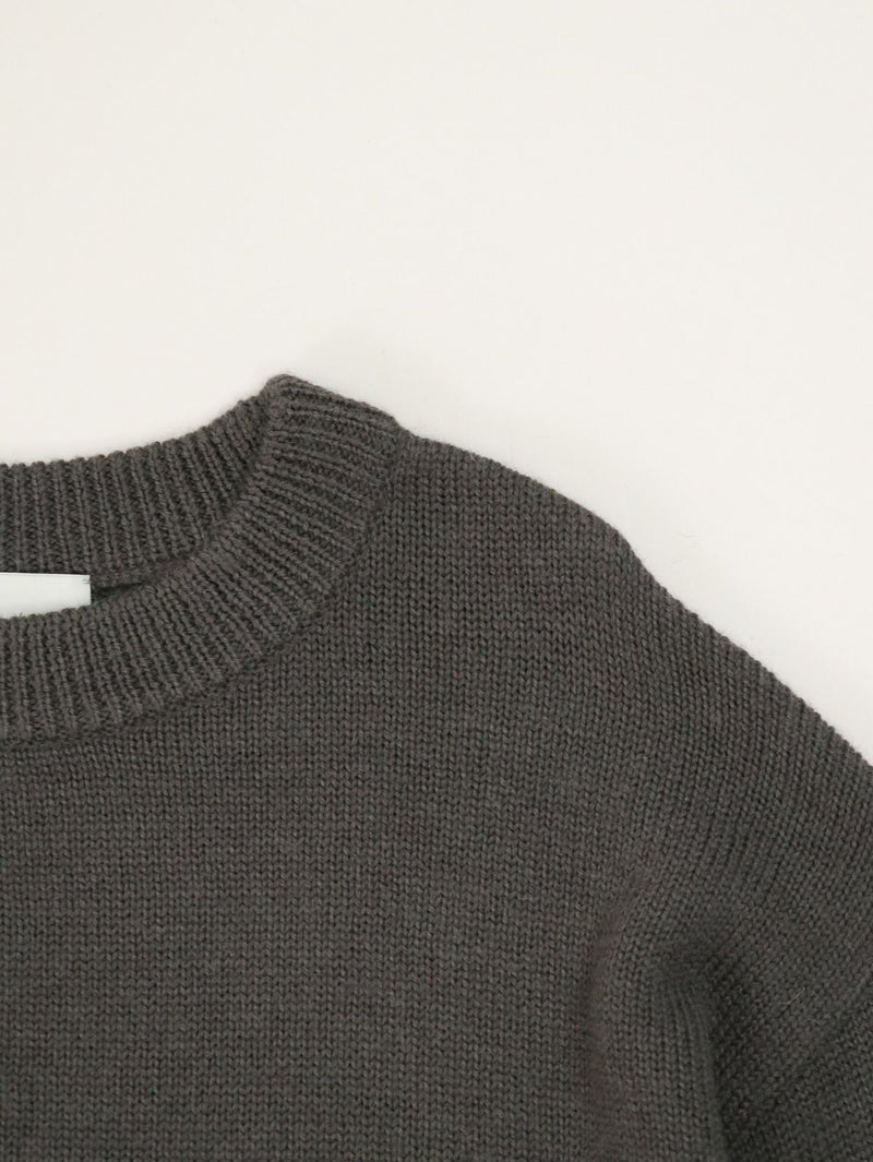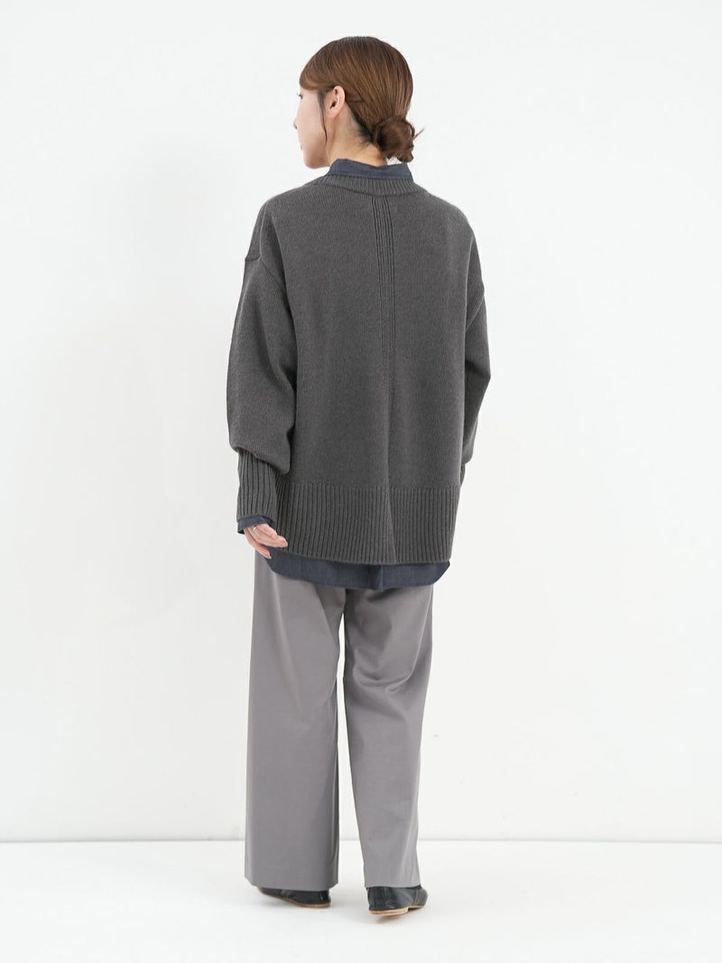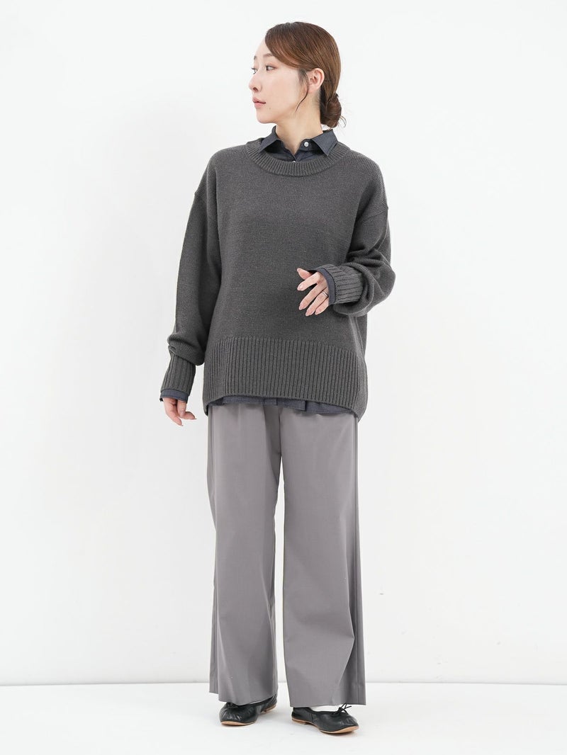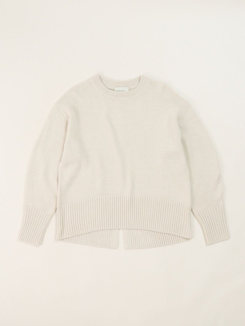 柔らかな風合いのウール混ニットプルオーバー。 ウールの暖かさとアクリルの軽さをバランスよく組み合わせたバルキー糸を使用。袖口と裾の長めのリブと、後ろのスリットがデザインポイントに。