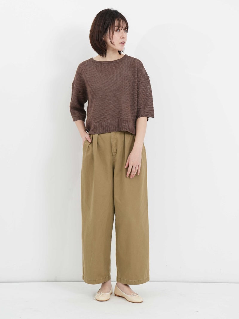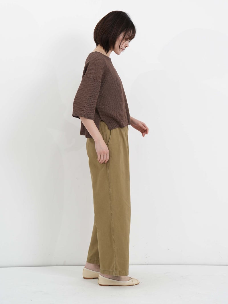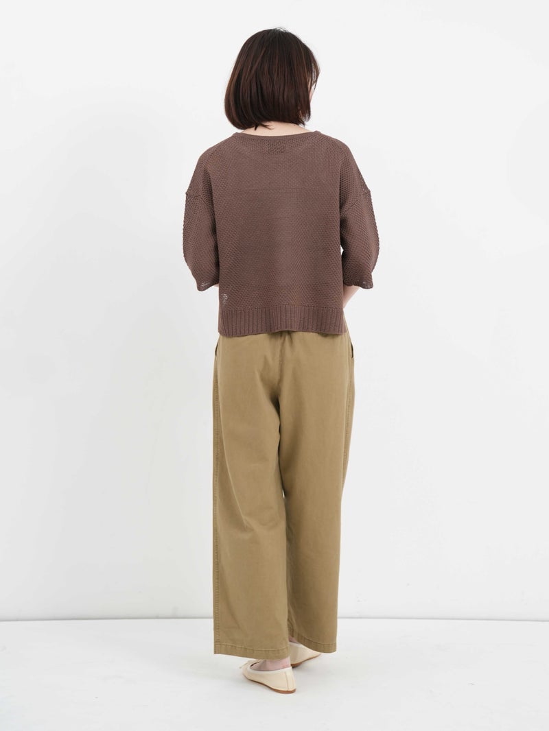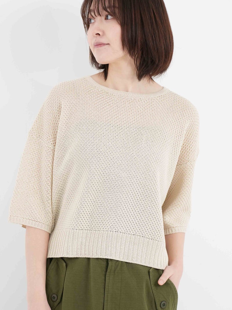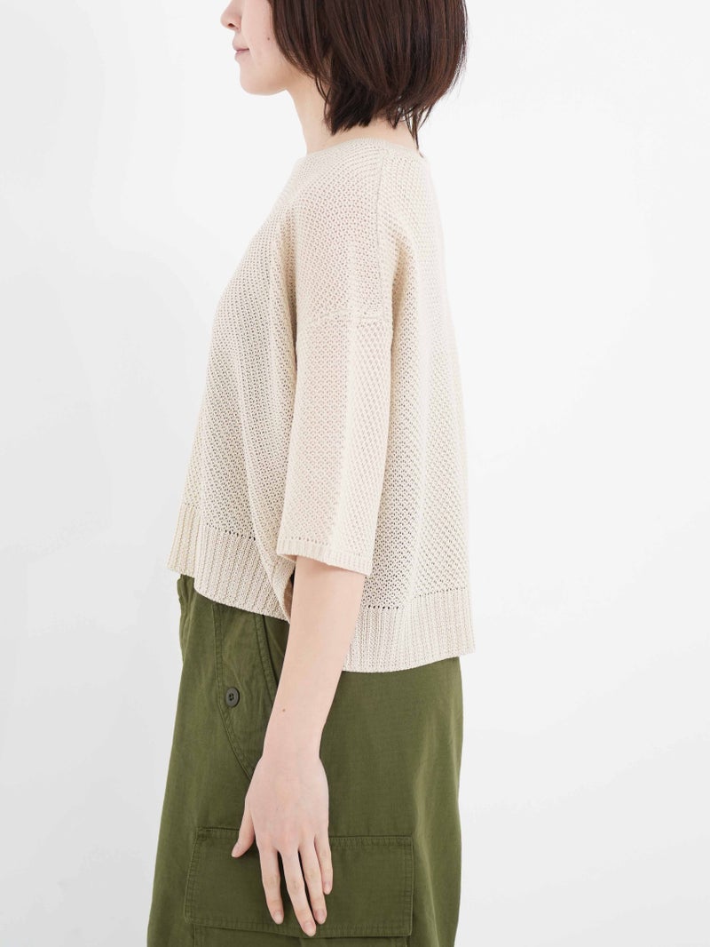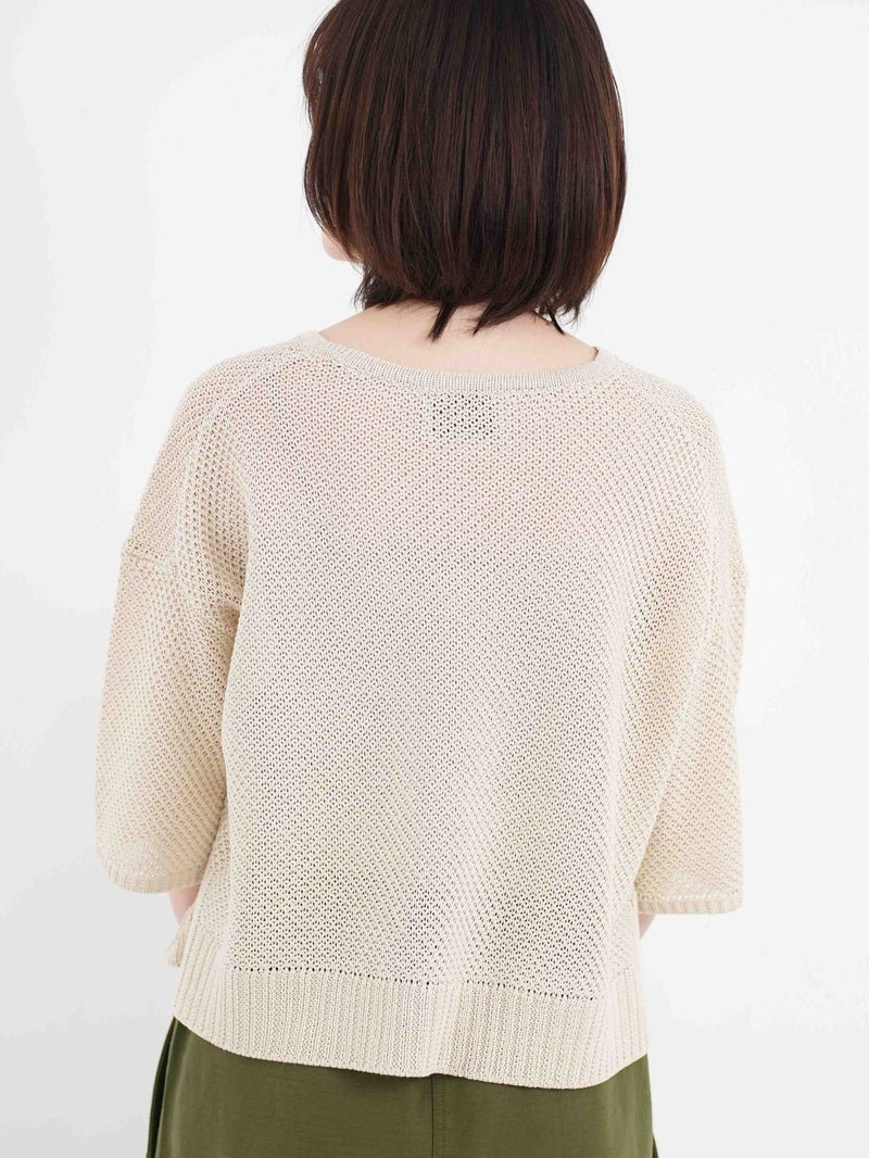 麻のようなドライタッチと清涼感が特徴のレーヨン混鹿の子編みニット。 凹凸感のある編地が肌離れをよくしサラッと着ていただけます。ワイドパンツやボリュームのあるスカートと合わせると◎