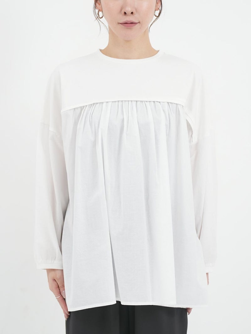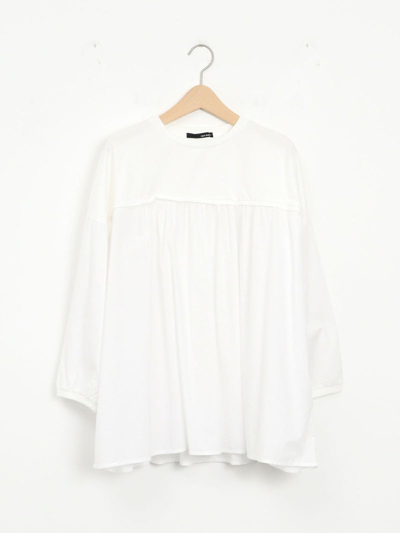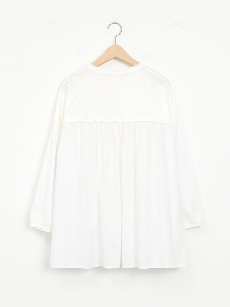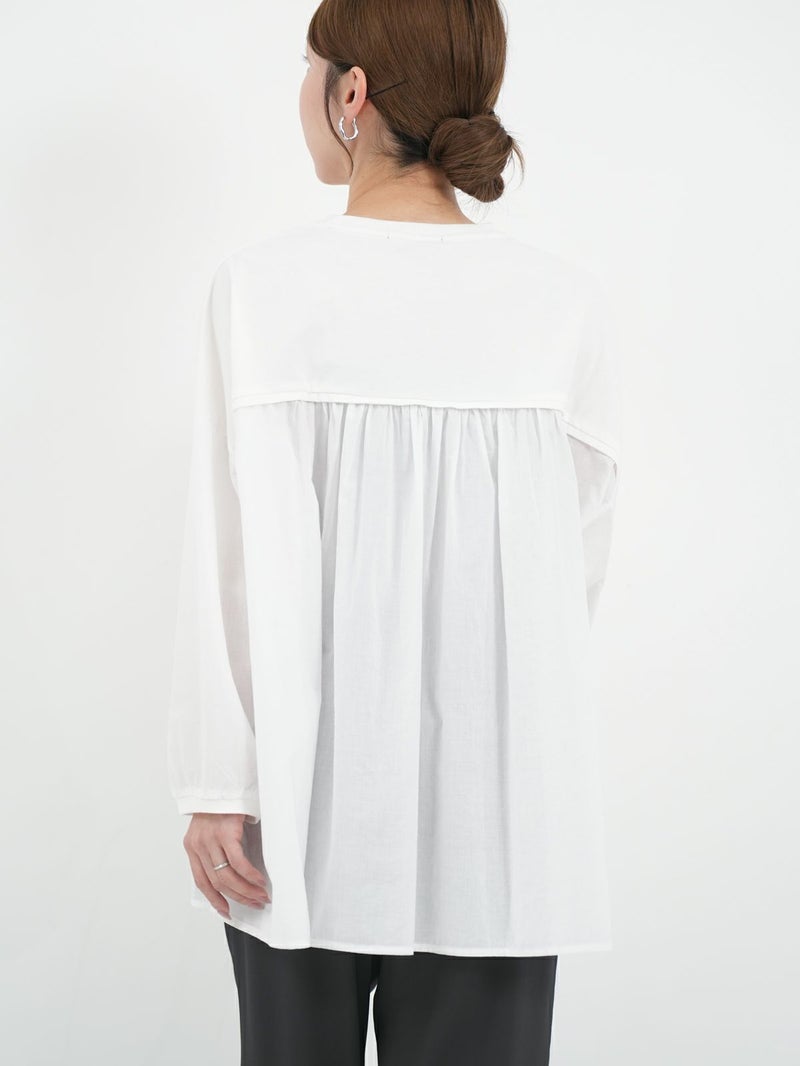 天竺カットソー素材とソフトなローン布帛地を組み合わせた、軽い着心地のコンビプルオーバー。 ゆったりとしたシルエットでボリュームがありながらも、野暮ったくならずに着用出来る1枚。袖口はリブ仕様で腕をまくってもずり落ちにくく、軽やかなに着こなして頂けます。