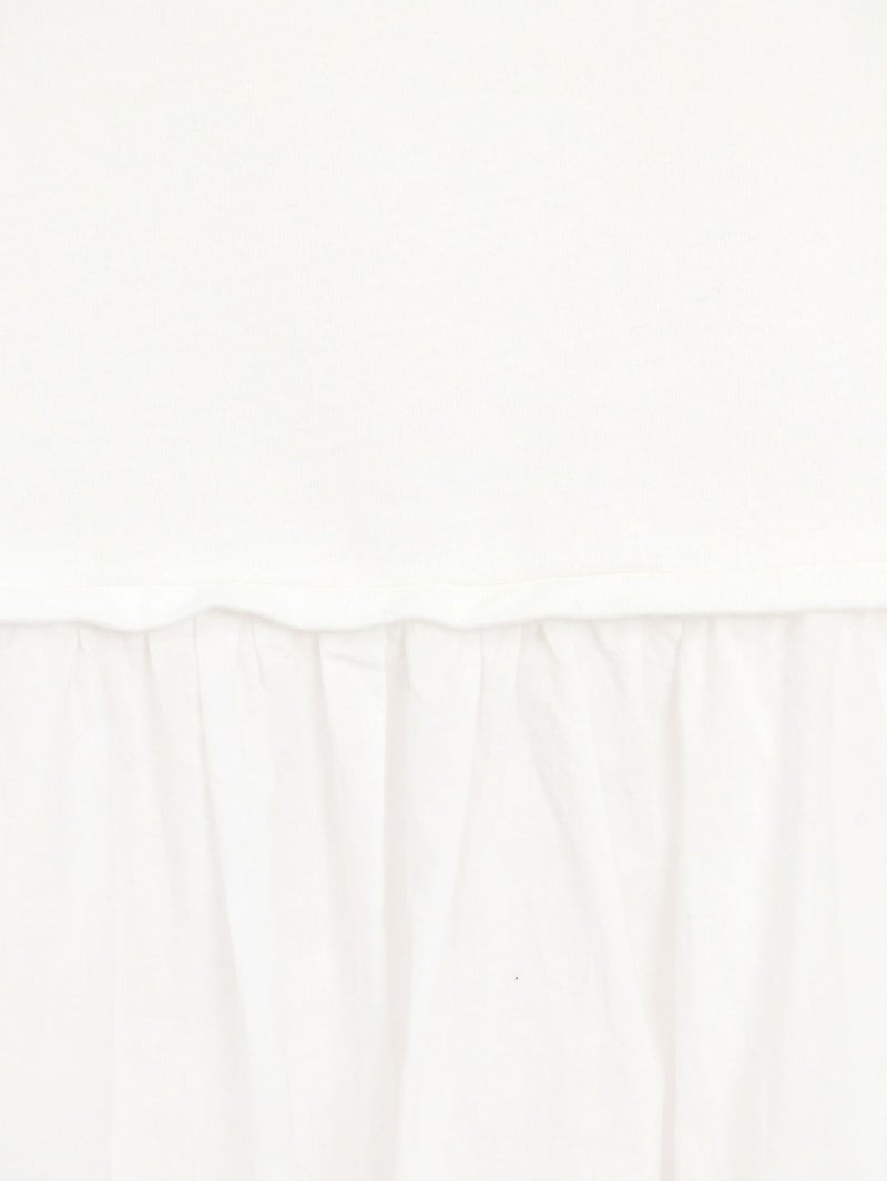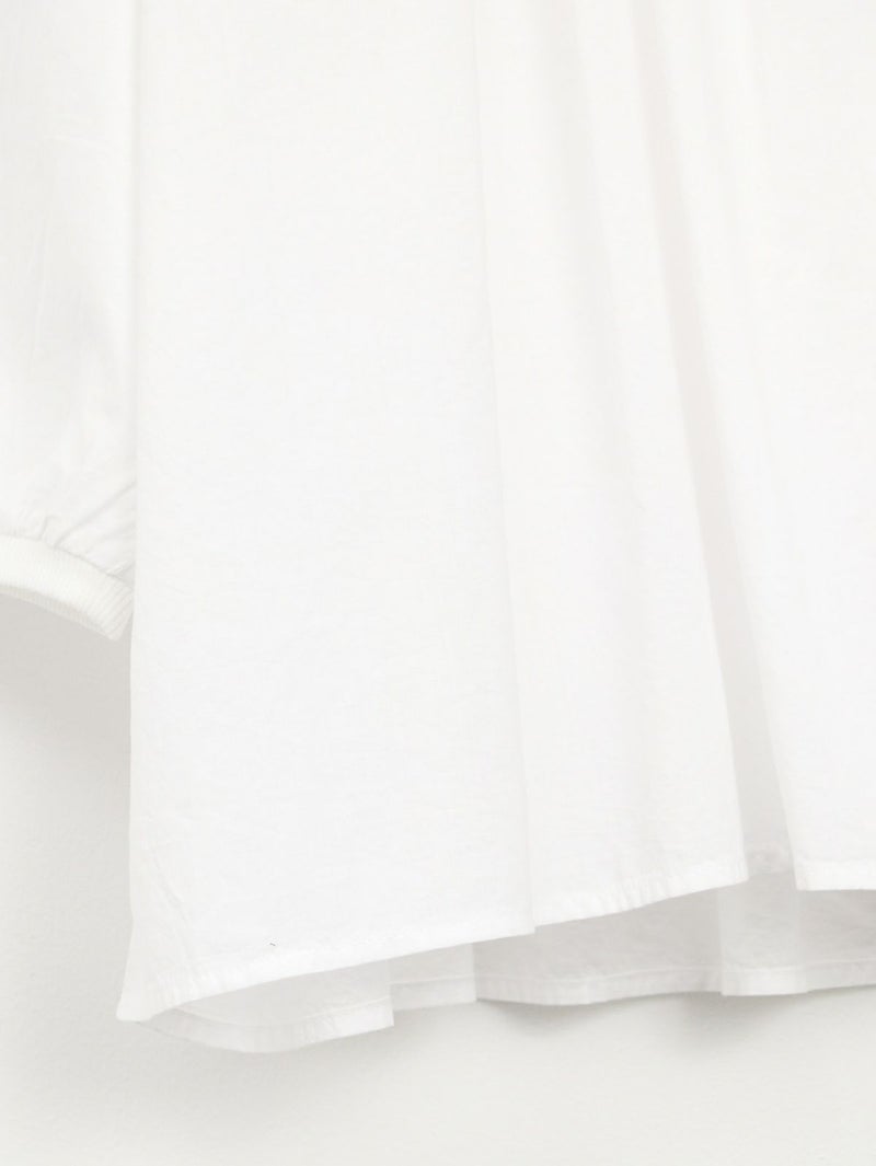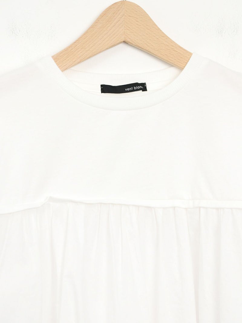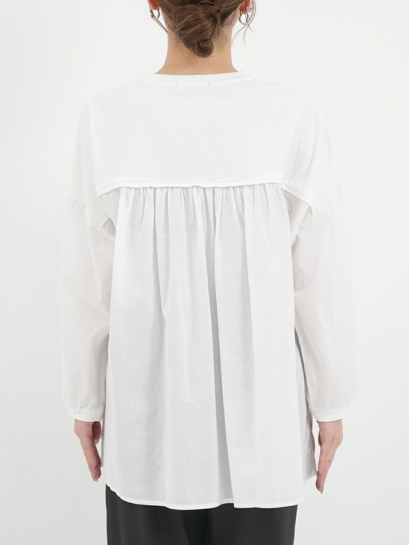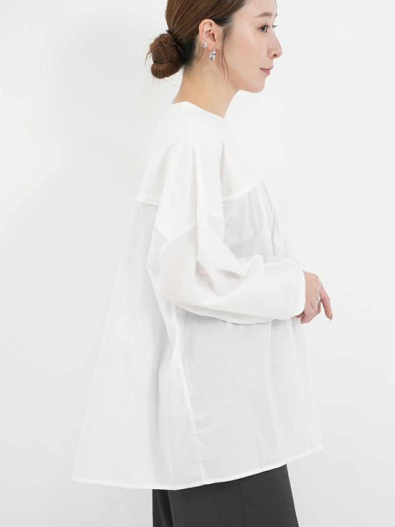 天竺カットソー素材とソフトなローン布帛地を組み合わせた、軽い着心地のコンビプルオーバー。 ゆったりとしたシルエットでボリュームがありながらも、野暮ったくならずに着用出来る1枚。袖口はリブ仕様で腕をまくってもずり落ちにくく、軽やかなに着こなして頂けます。