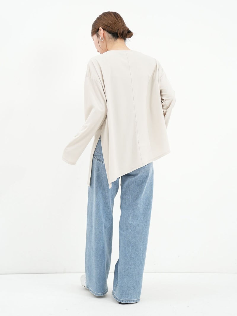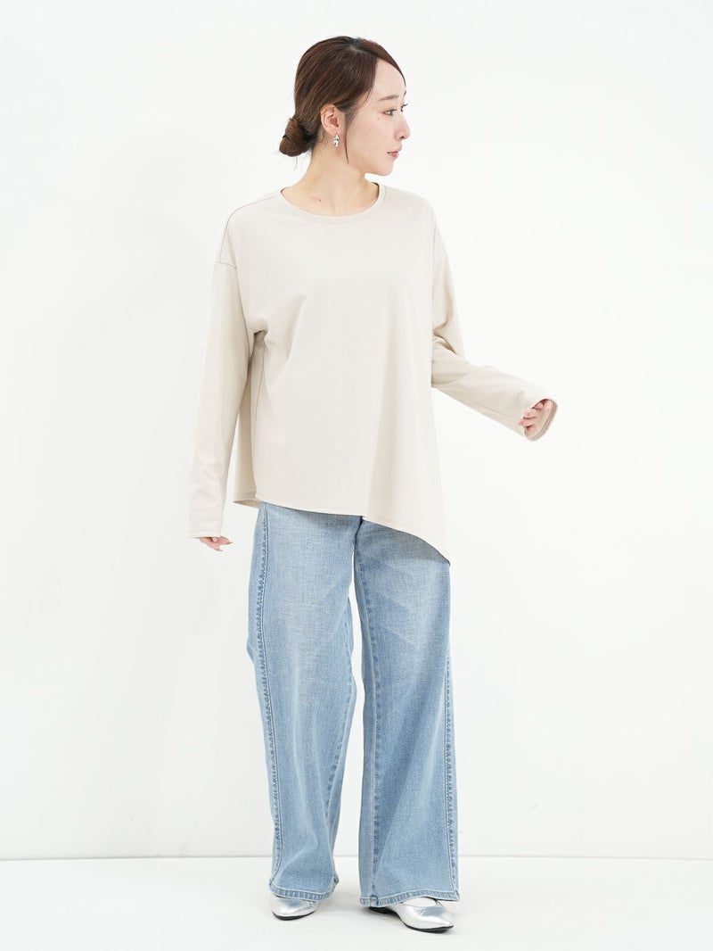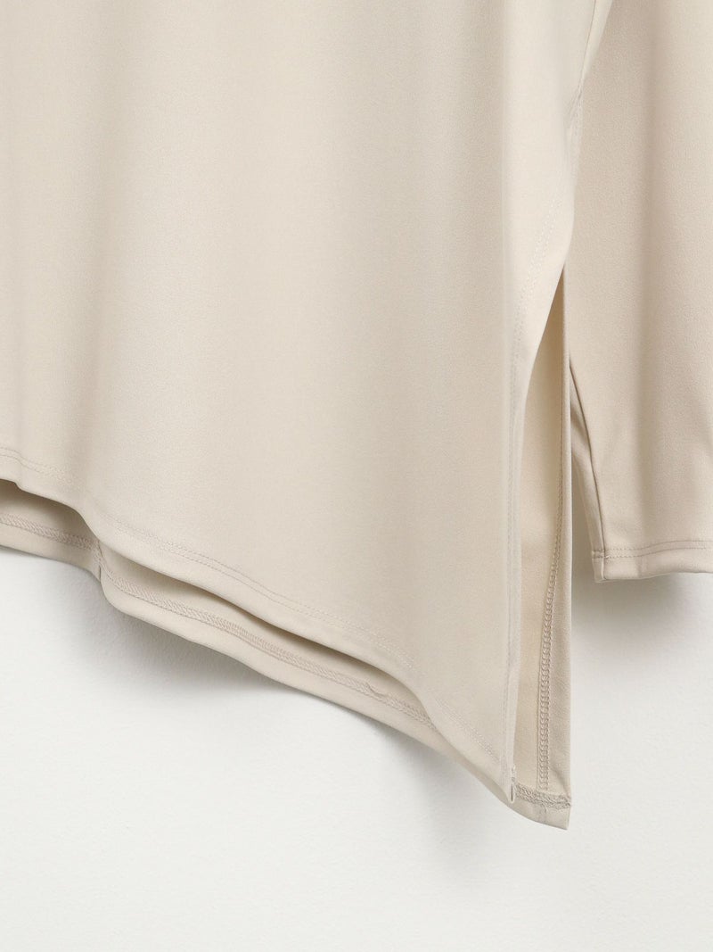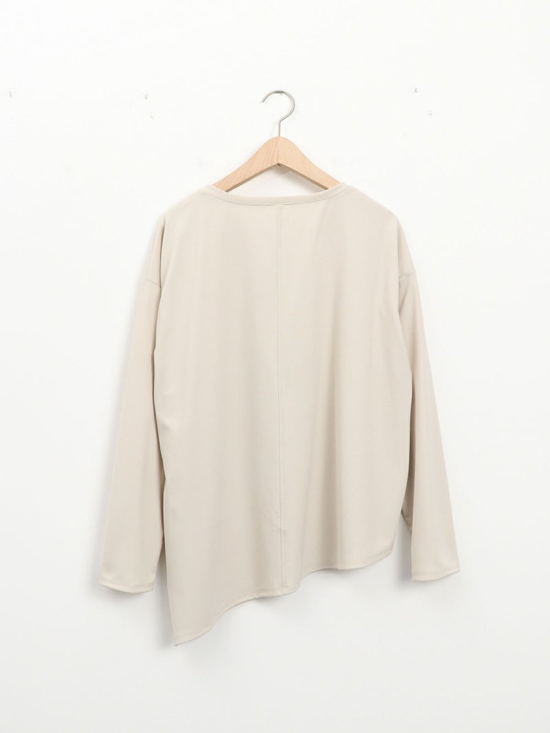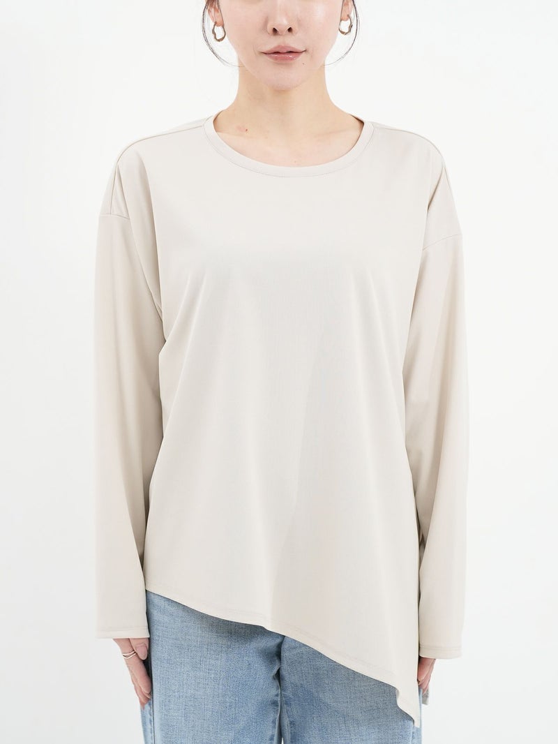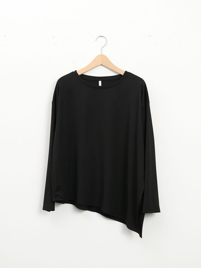 シンプルながら、アシンメトリーなカッティングが印象的なポリエステル素材のロンTブラウス。サラッとした柔らかさのある素材なのでカジュアル過ぎず大人のデイリー使いにおすすめです。