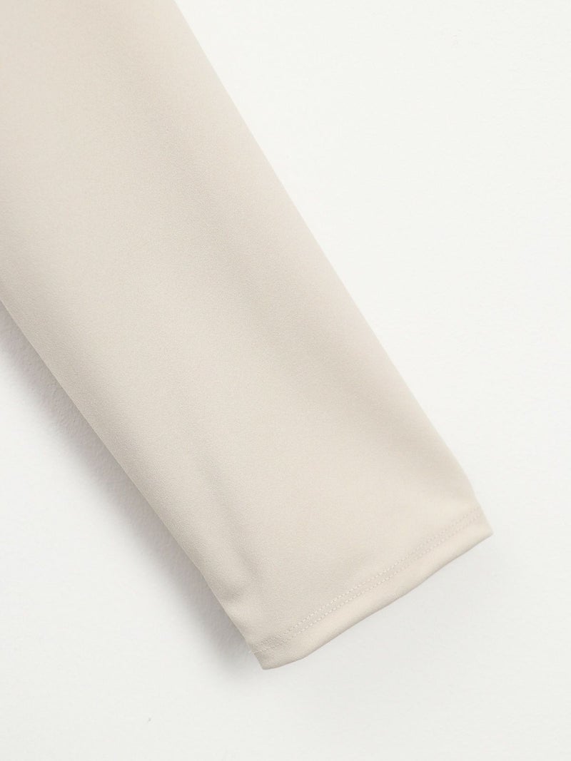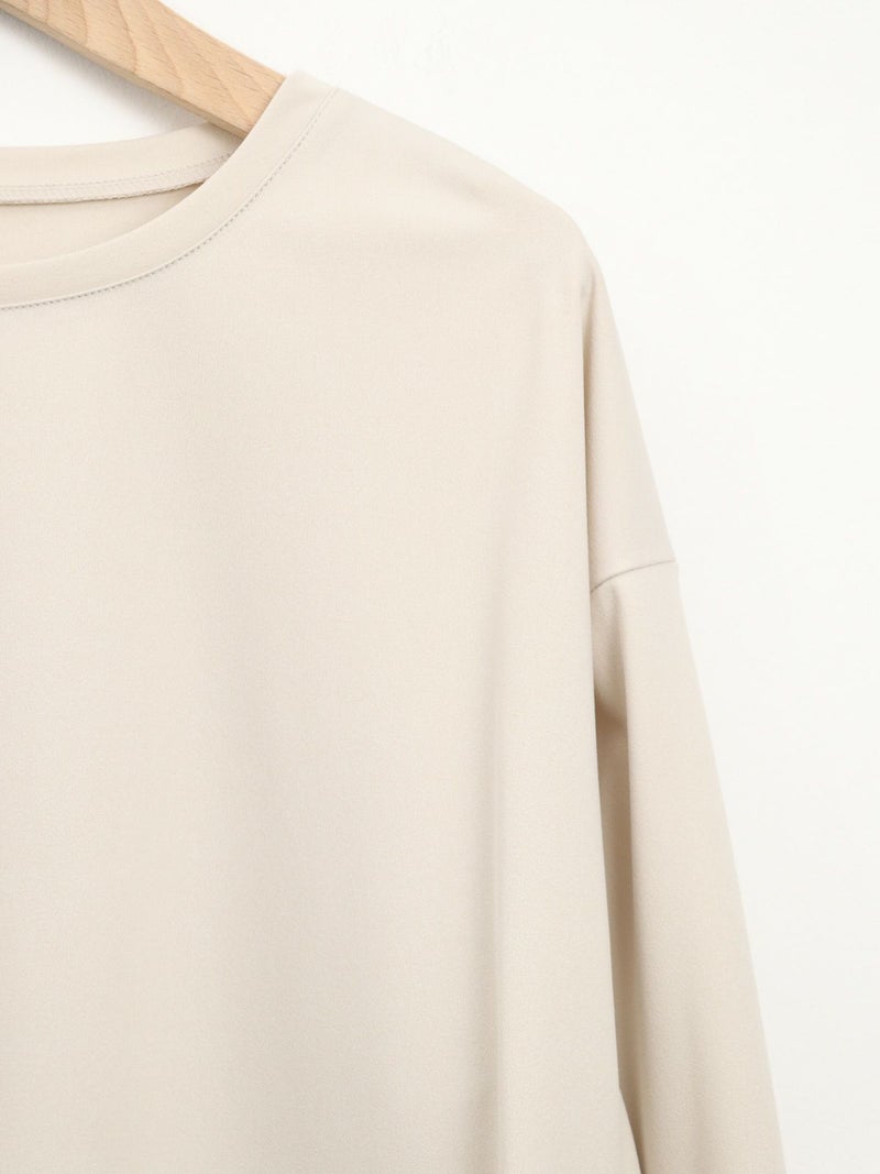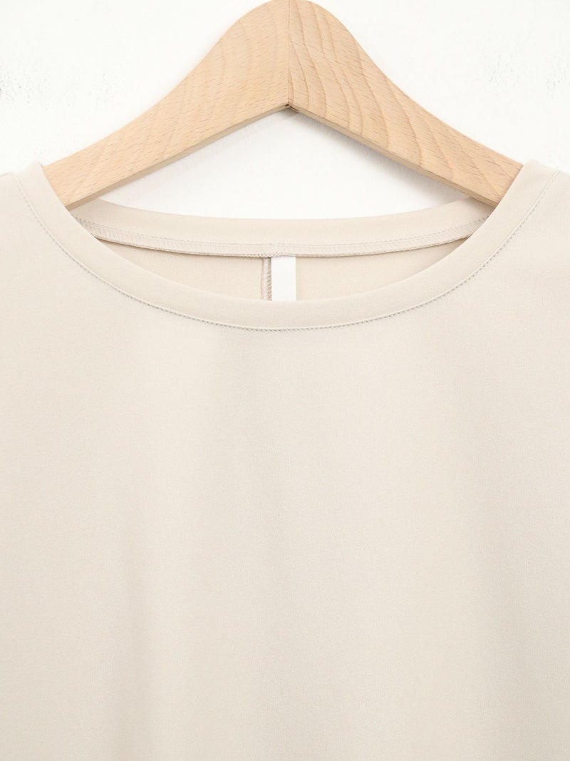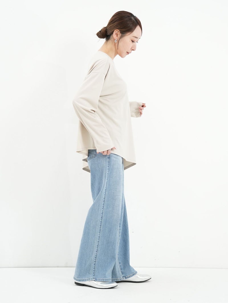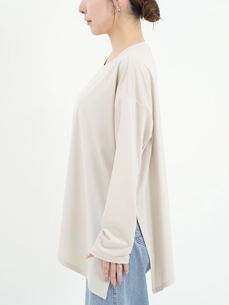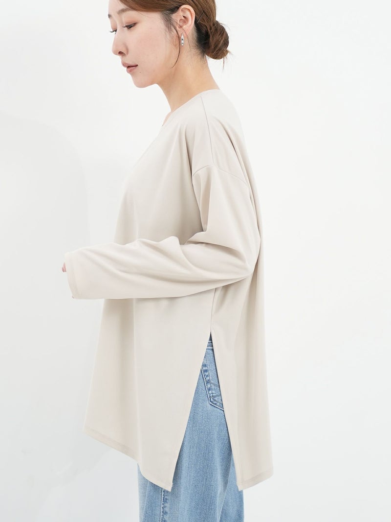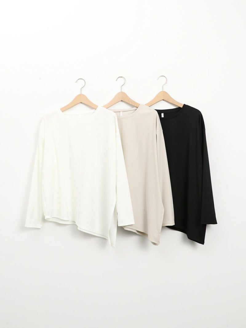 シンプルながら、アシンメトリーなカッティングが印象的なポリエステル素材のロンTブラウス。サラッとした柔らかさのある素材なのでカジュアル過ぎず大人のデイリー使いにおすすめです。