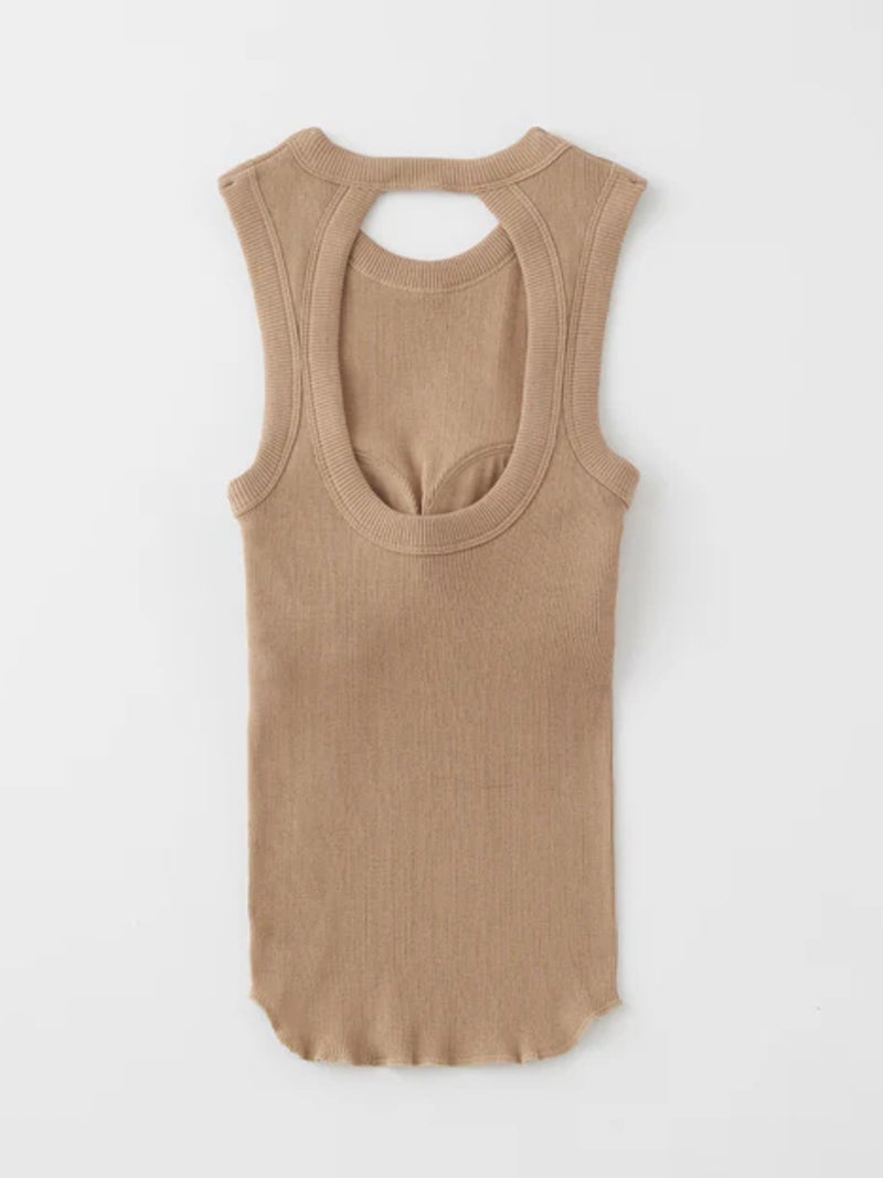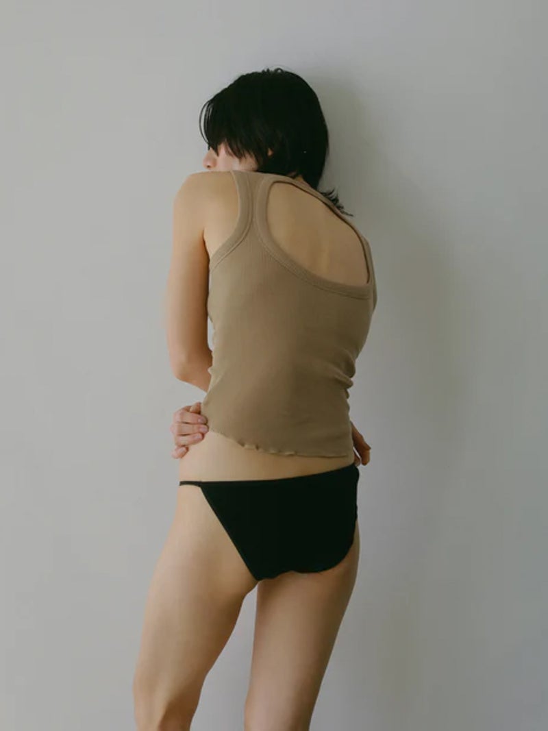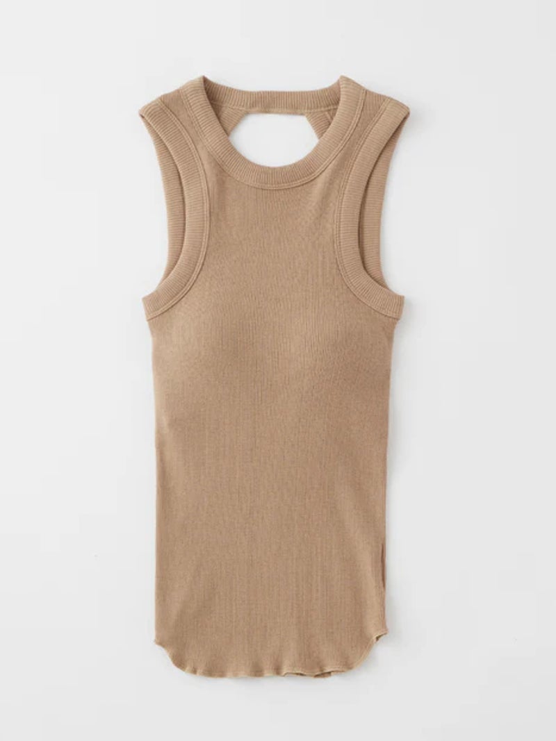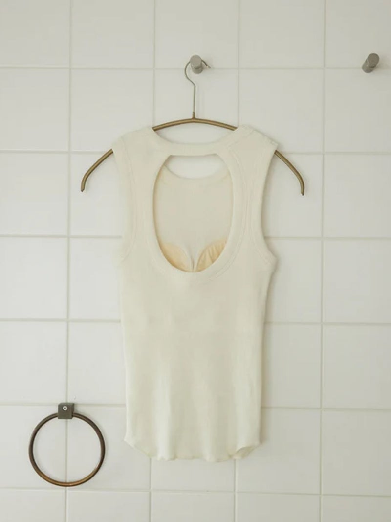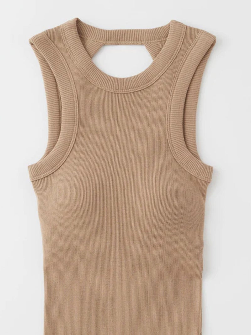 バックデザインが映えるカップ付きタンクトップ。 風合いの良いコットン100%のリブ素材を使用し、やわらかな肌触りで快適な着心地に仕上げた一枚です。安心感のある太めのショルダーデザインに、縦長のバックカットで後ろ姿もすっきりと美しく演出。縫い付けの丸型カップ付きで、一枚でも着用できる実用性の高さも魅力です。