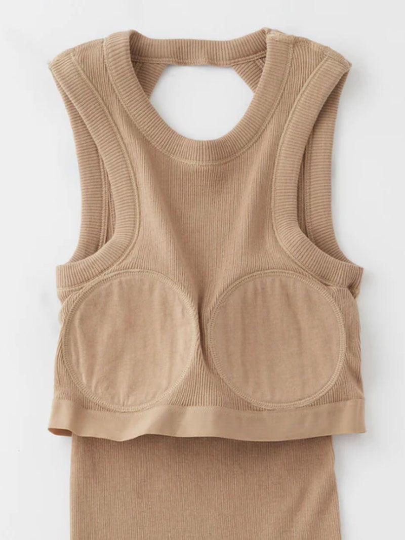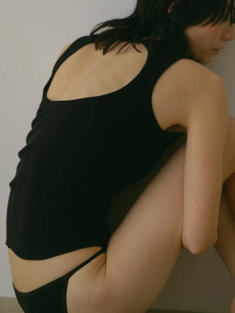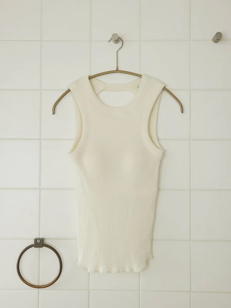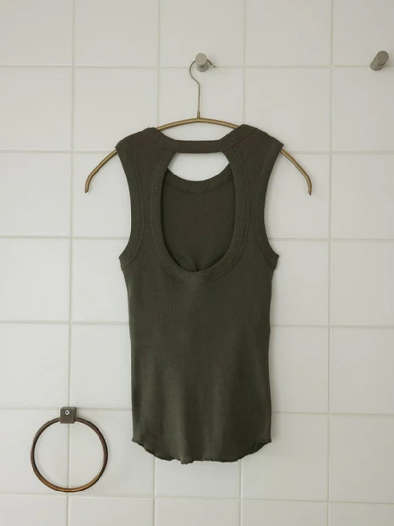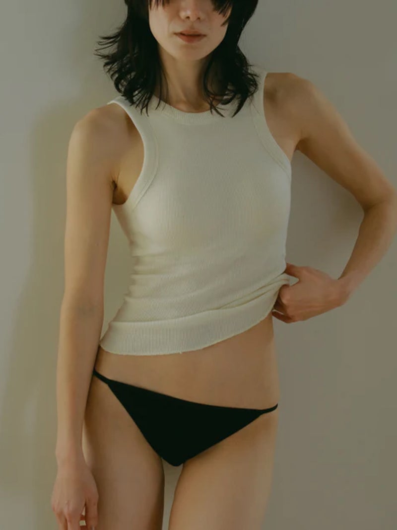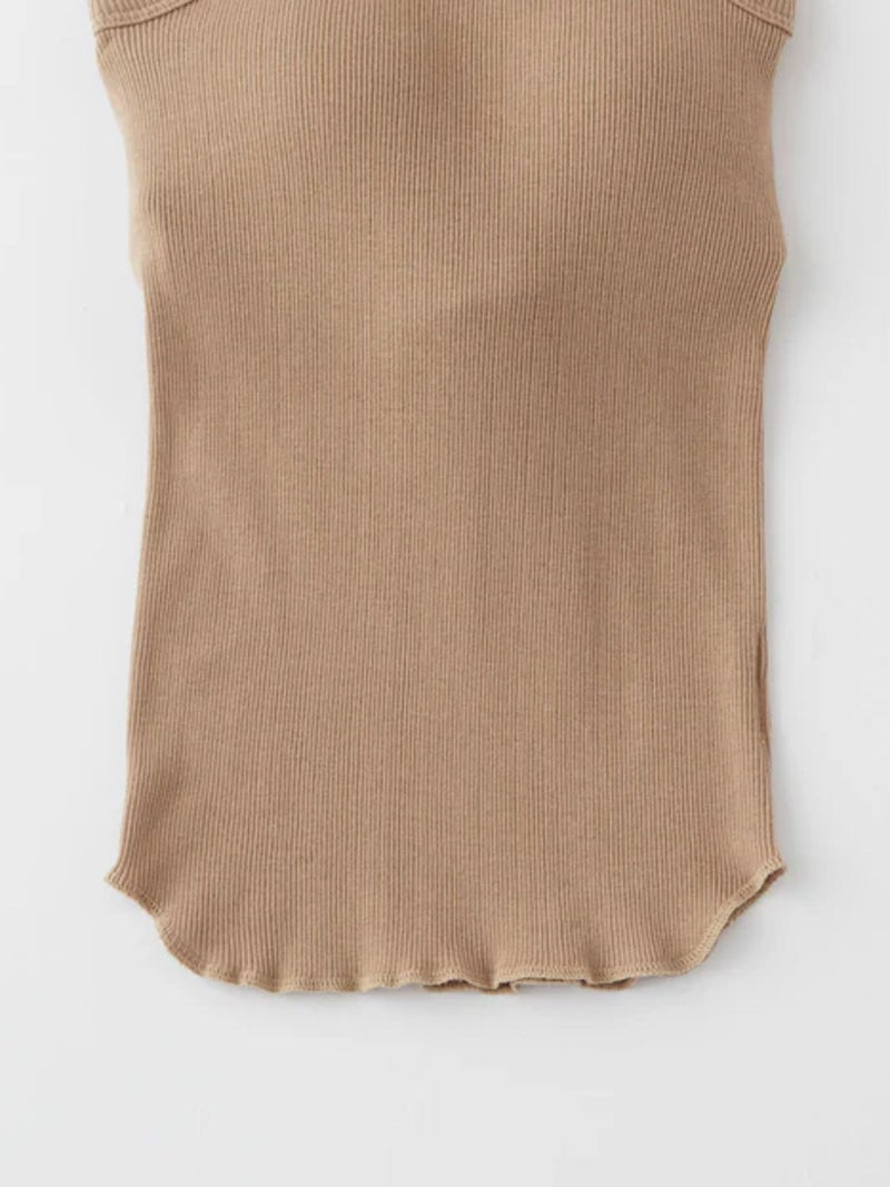 バックデザインが映えるカップ付きタンクトップ。 風合いの良いコットン100%のリブ素材を使用し、やわらかな肌触りで快適な着心地に仕上げた一枚です。安心感のある太めのショルダーデザインに、縦長のバックカットで後ろ姿もすっきりと美しく演出。縫い付けの丸型カップ付きで、一枚でも着用できる実用性の高さも魅力です。