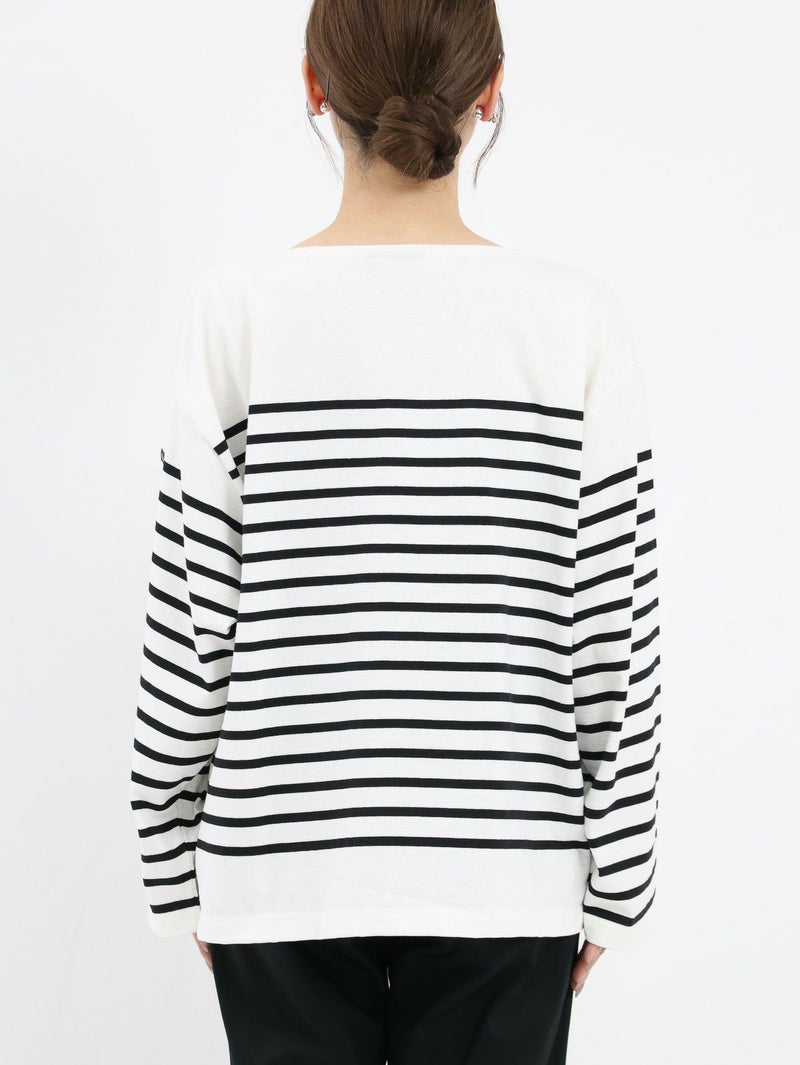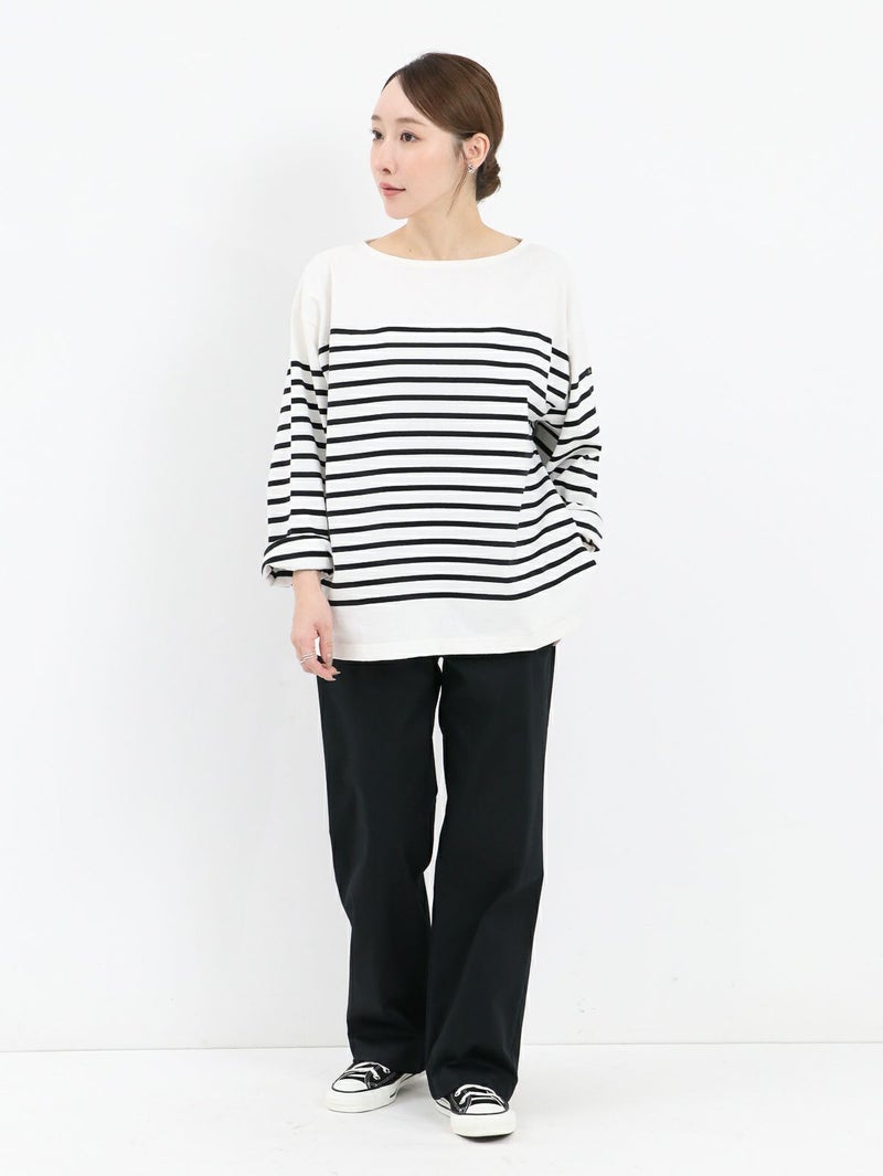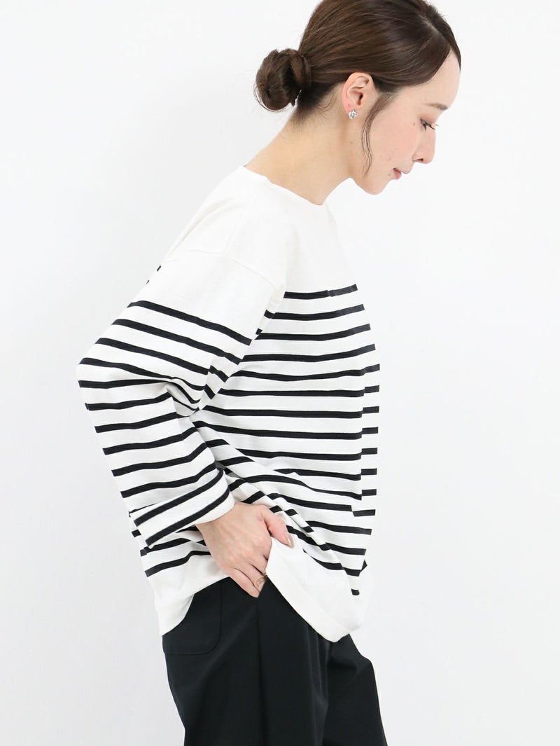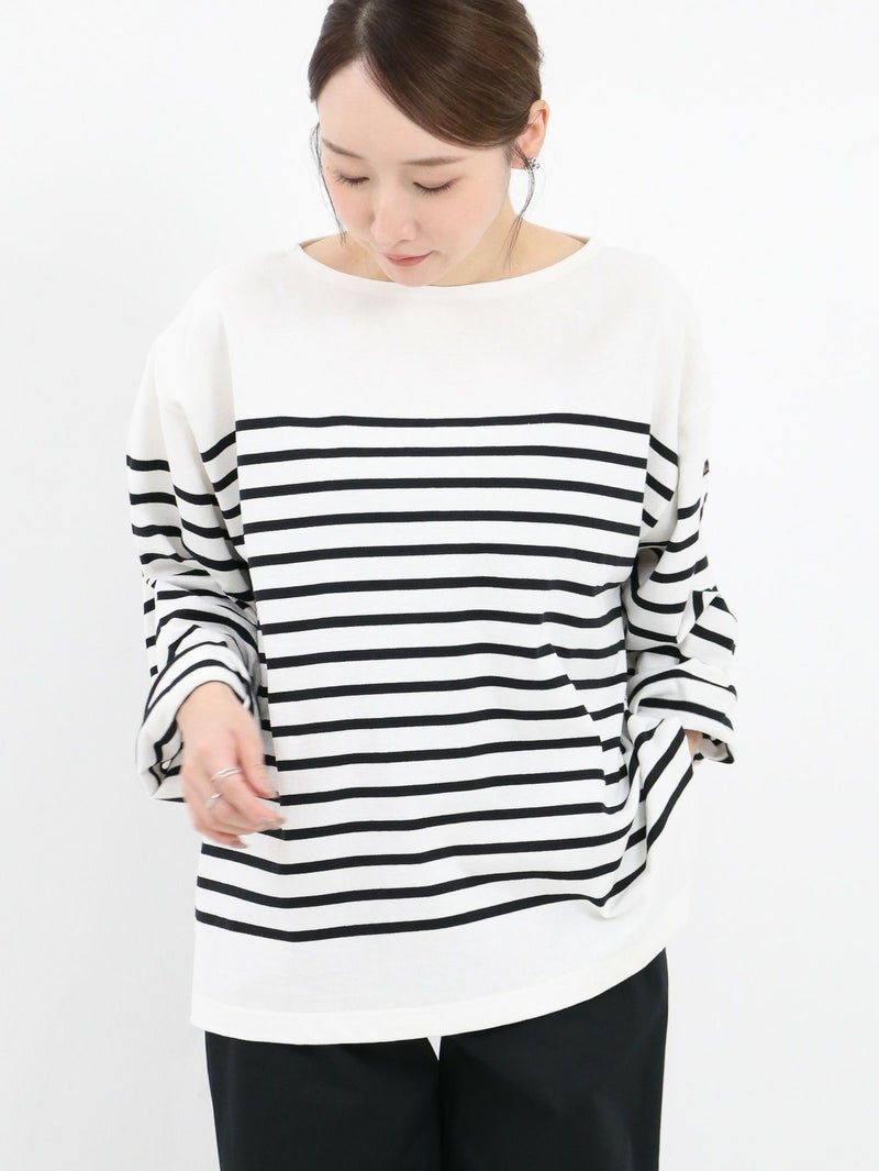 フレンチカジュアルの定番であるルミノアのバスクシャツ。 ゆったりしたサイズ感で一枚でも様になります。首元にボーダーのないデザインなのでスッキリ感があり、重ね着やスカーフやネックレスなどの小物とのスタイリングも楽しめます。