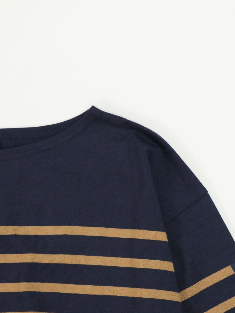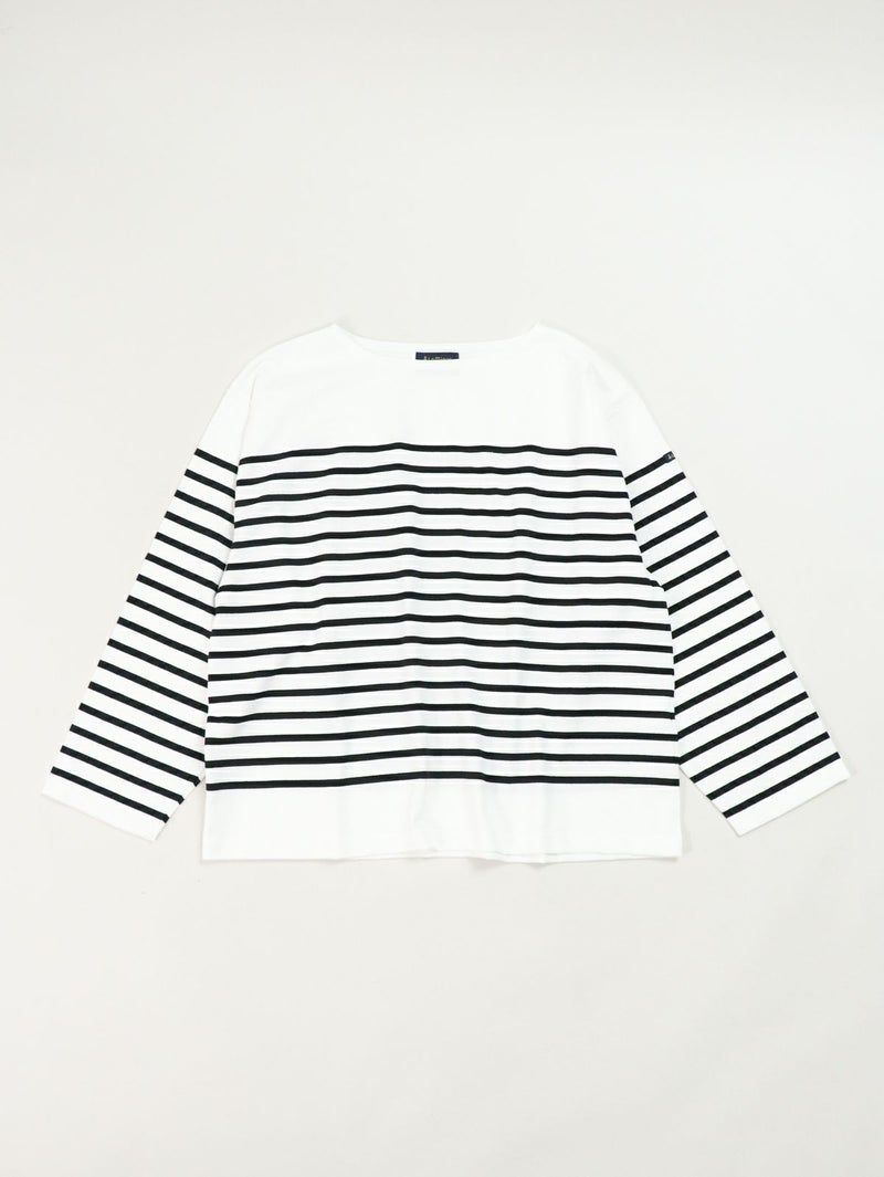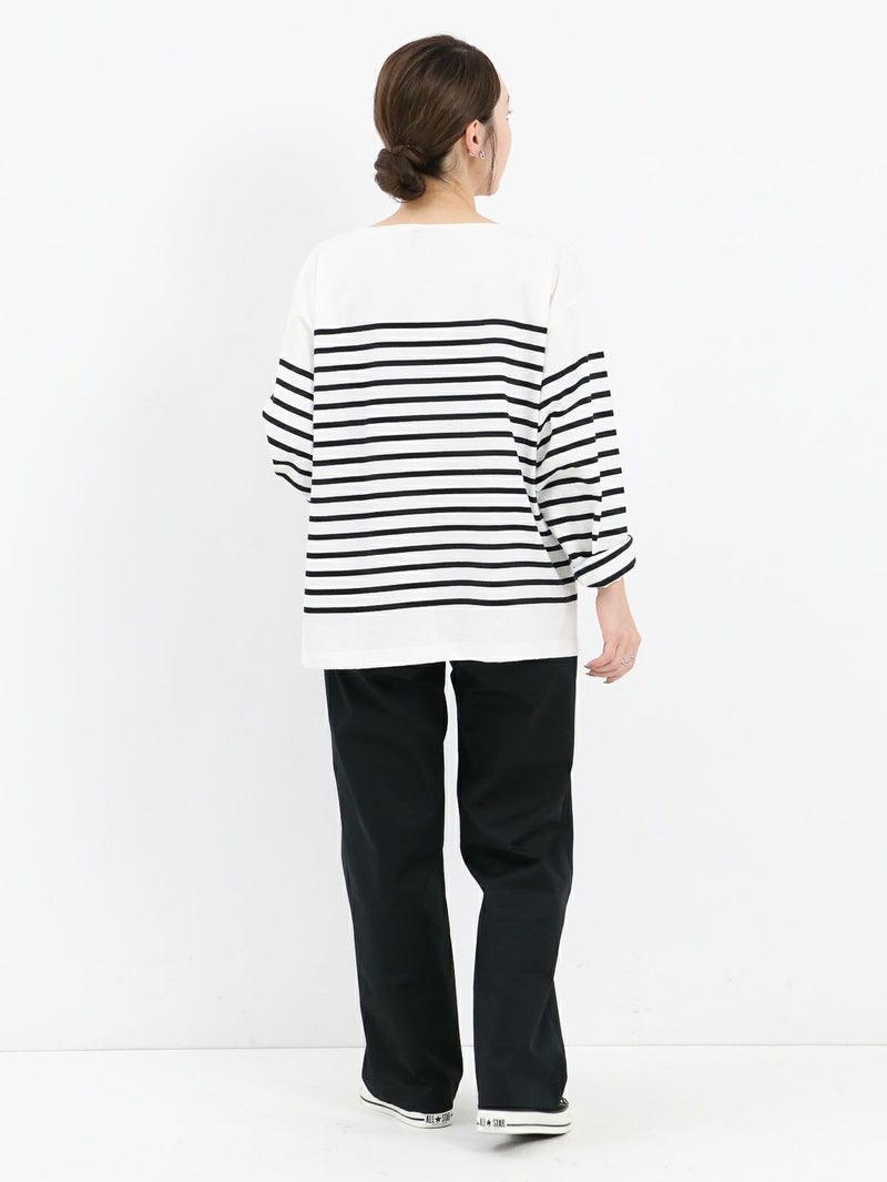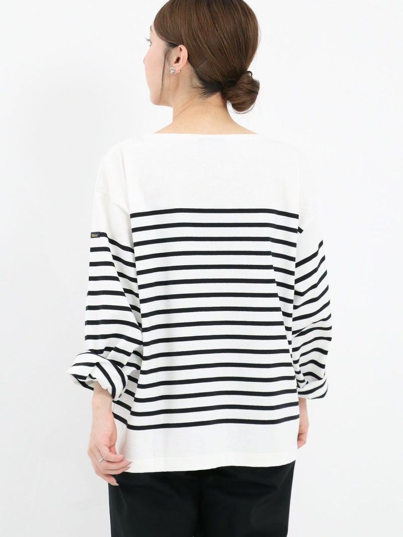 フレンチカジュアルの定番であるルミノアのバスクシャツ。 ゆったりしたサイズ感で一枚でも様になります。首元にボーダーのないデザインなのでスッキリ感があり、重ね着やスカーフやネックレスなどの小物とのスタイリングも楽しめます。
