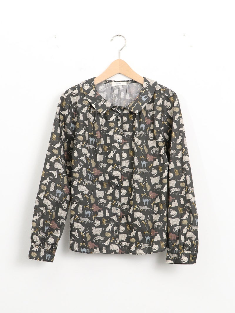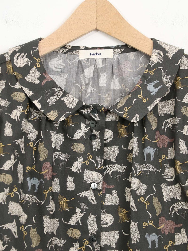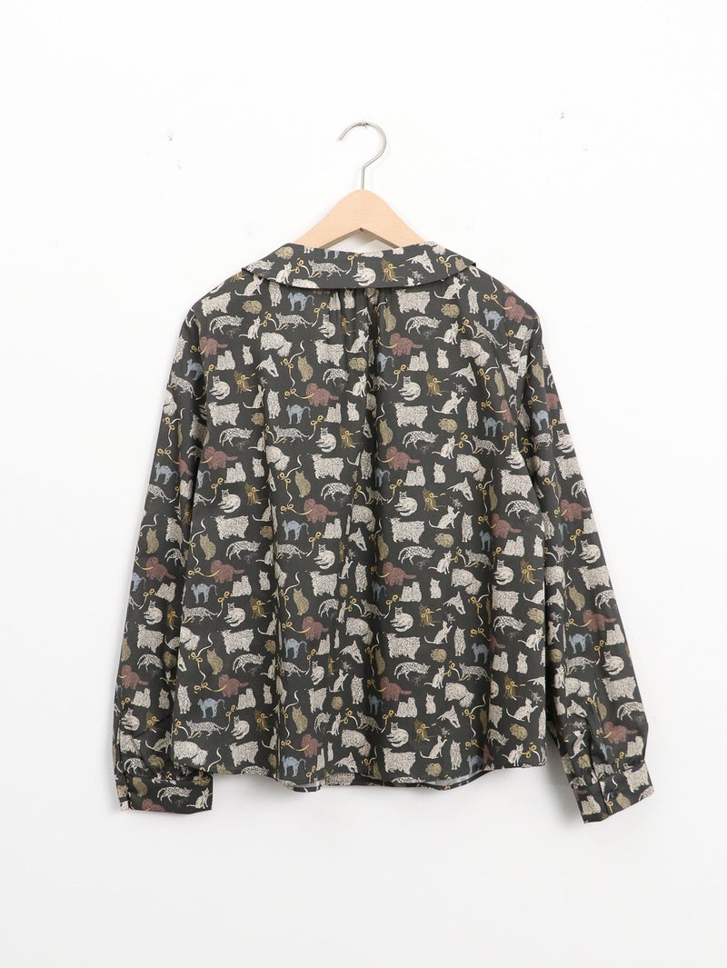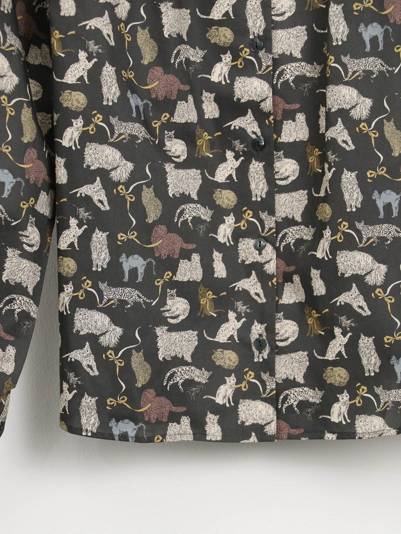 ねこ柄のリバティプリントブラウス。 細かいタッチで描かれたねこ達が遊び心のある1着。ネックラインにゆとりのある丸衿で、上品な印象のデザインです。フワッとしたシルエットでパンツスタイルとのバランスが◎