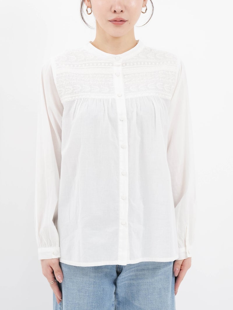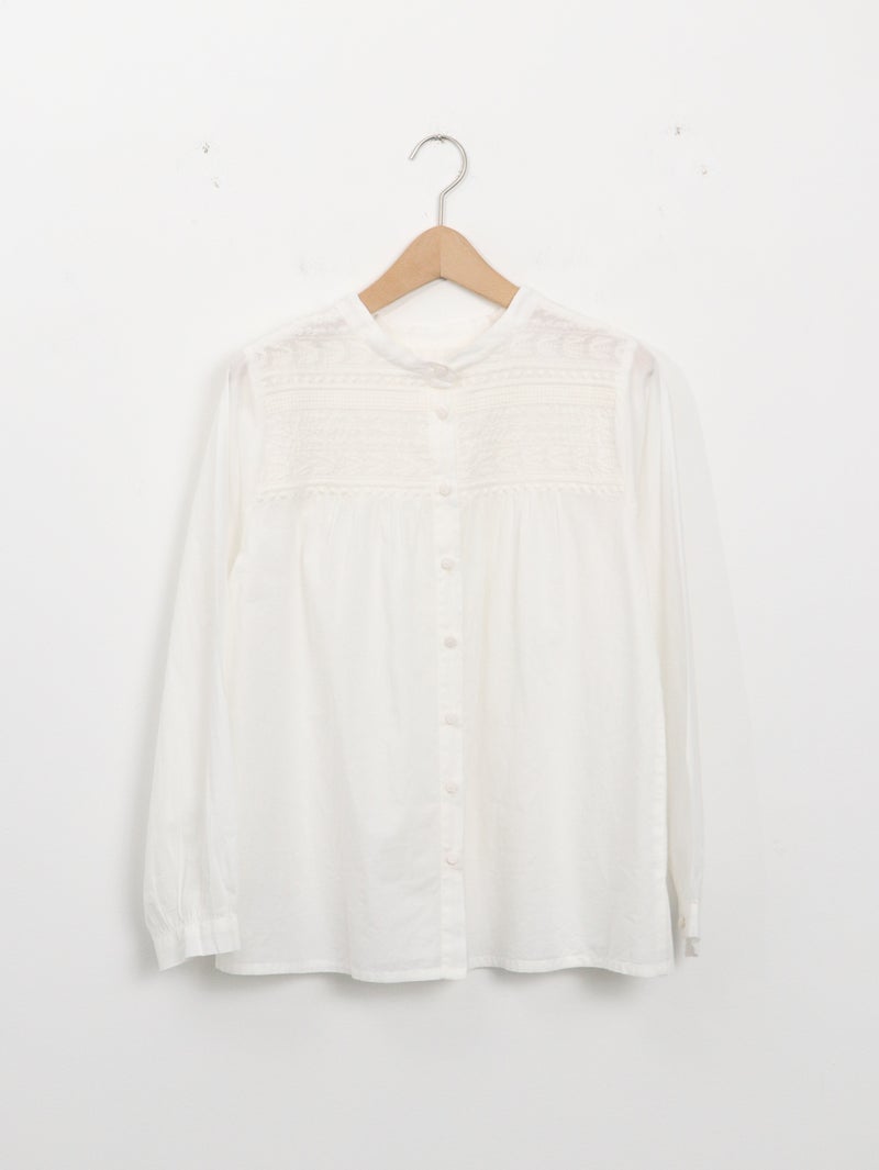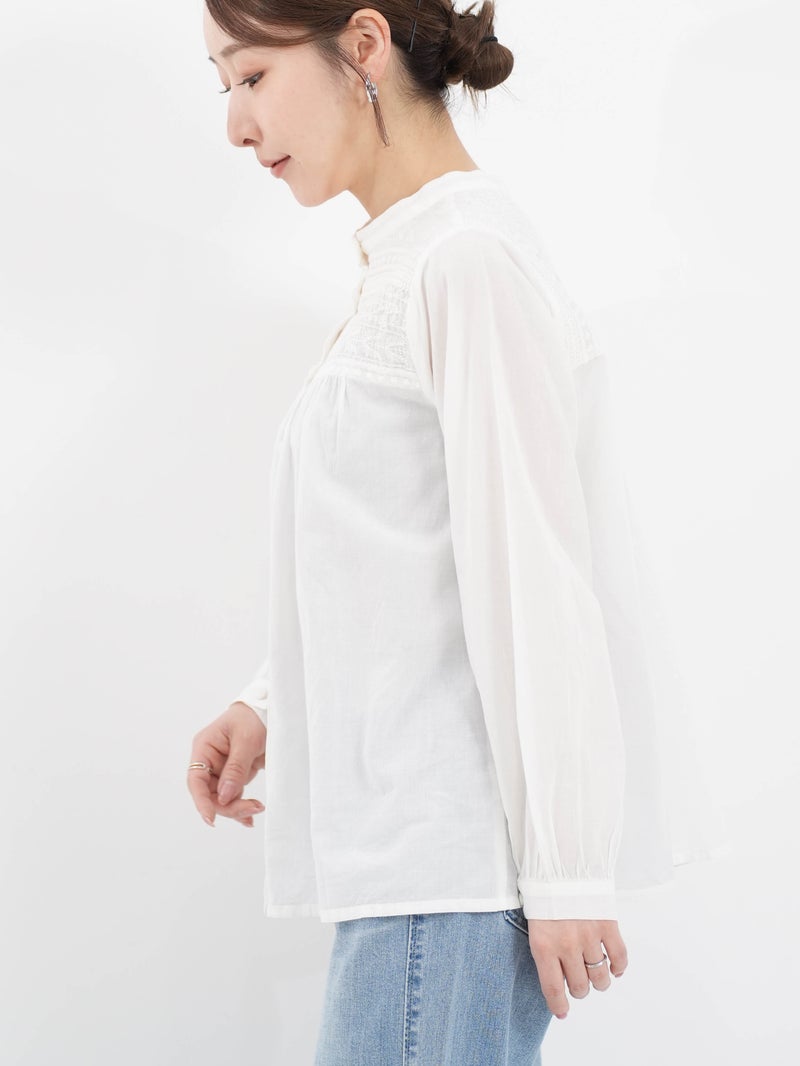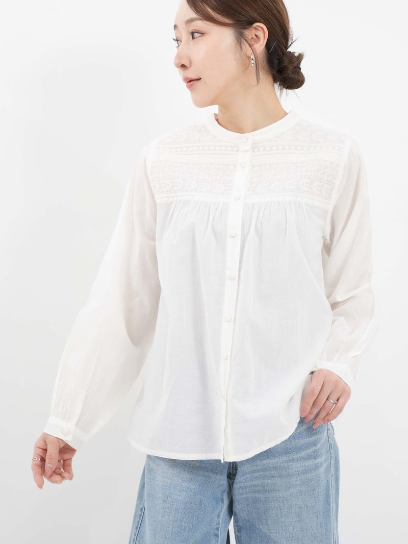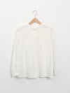 ラインモチーフの立体的な刺繍が美しいブラウス。 1つ1つ丁寧に作られたくるみボタンもポイントです。前後2WAYで着用可能。前を開けてカットソーの上から羽織るのもオススメです。