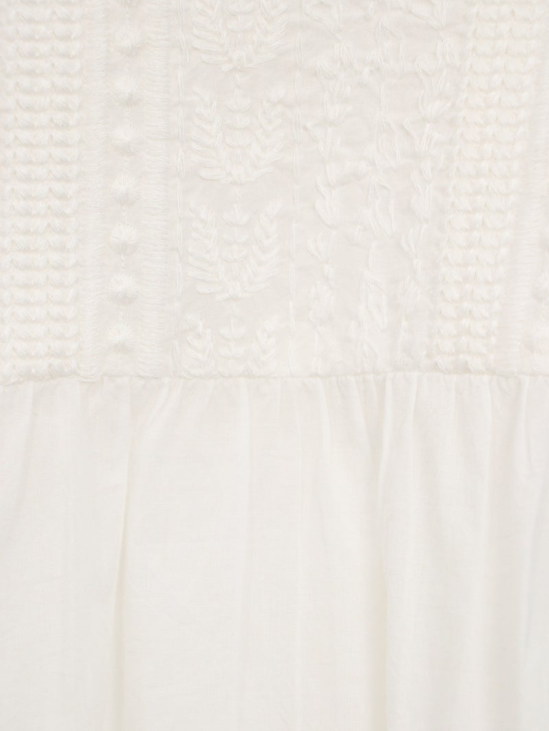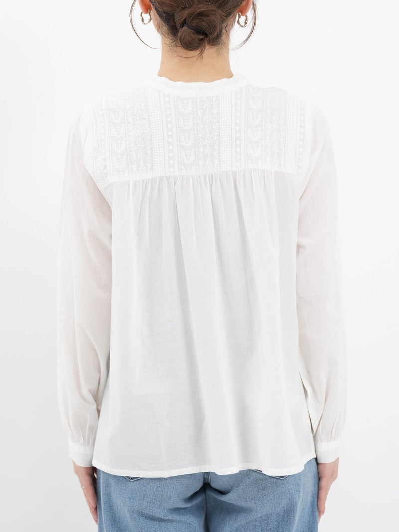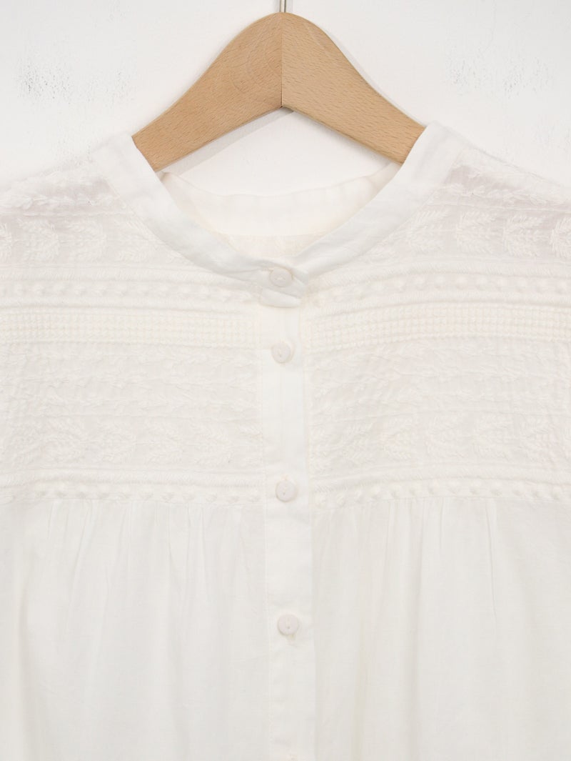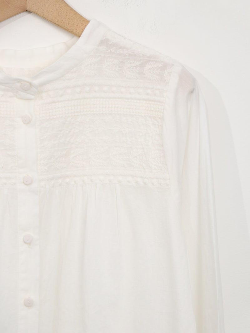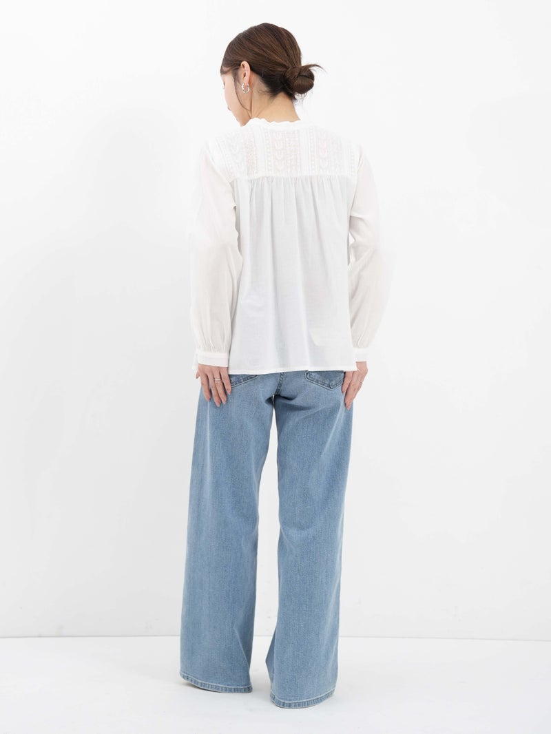 ラインモチーフの立体的な刺繍が美しいブラウス。 1つ1つ丁寧に作られたくるみボタンもポイントです。前後2WAYで着用可能。前を開けてカットソーの上から羽織るのもオススメです。