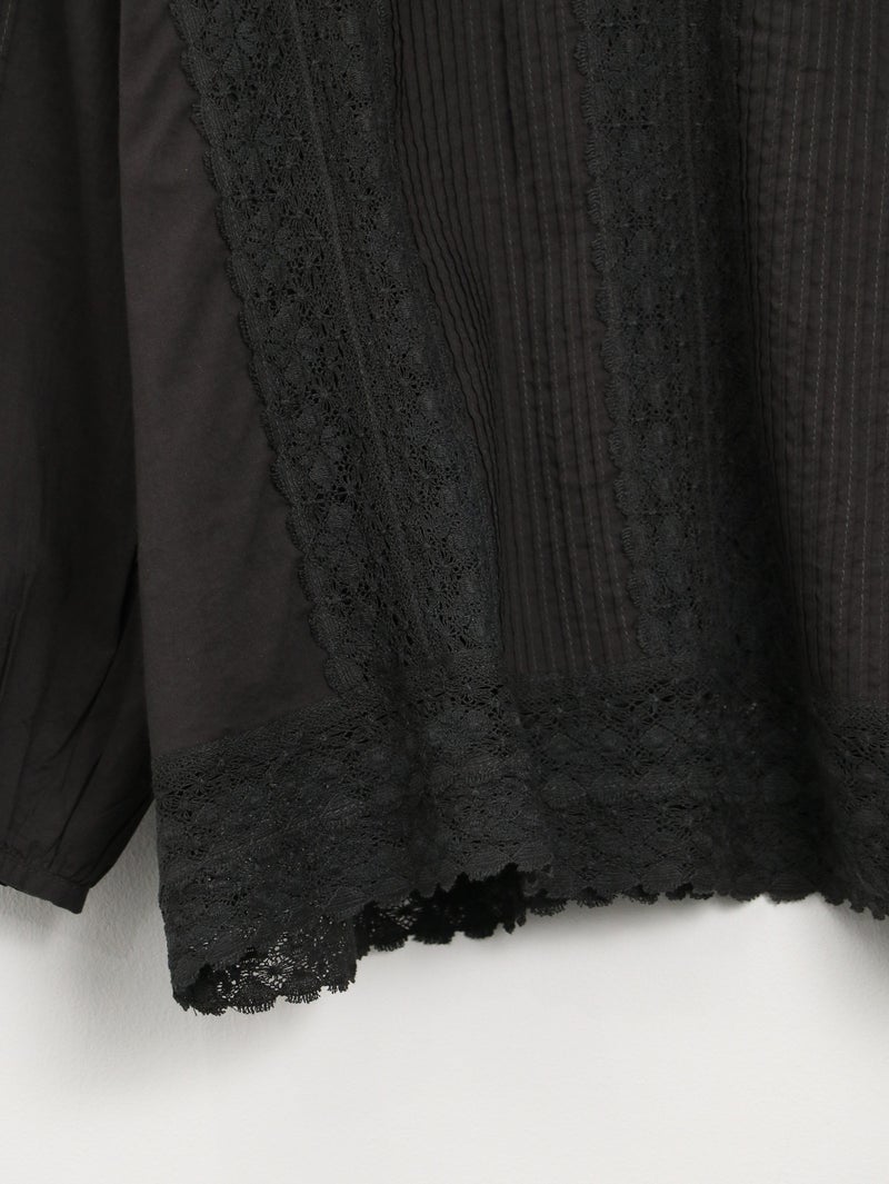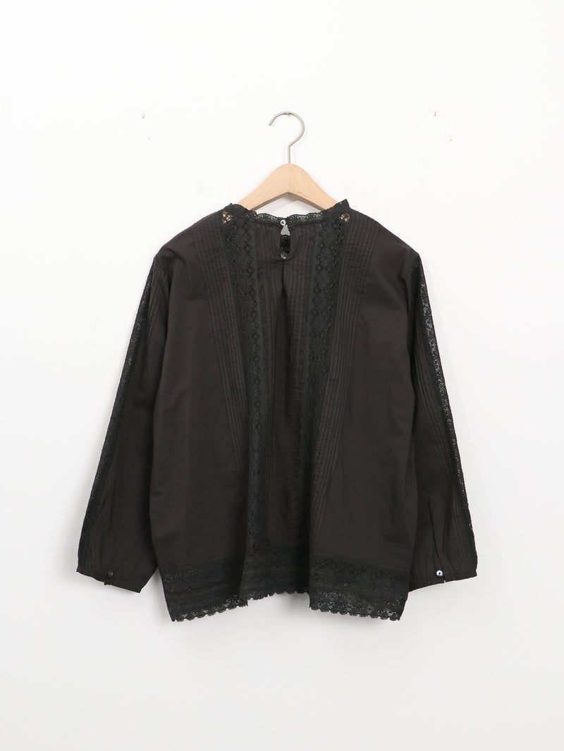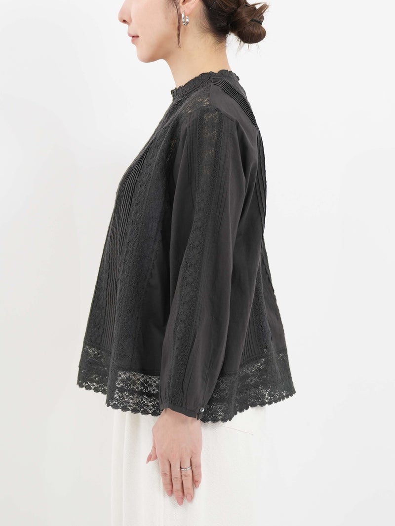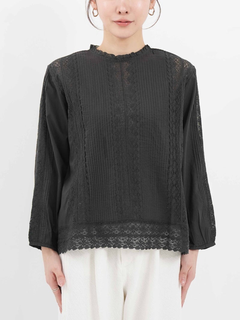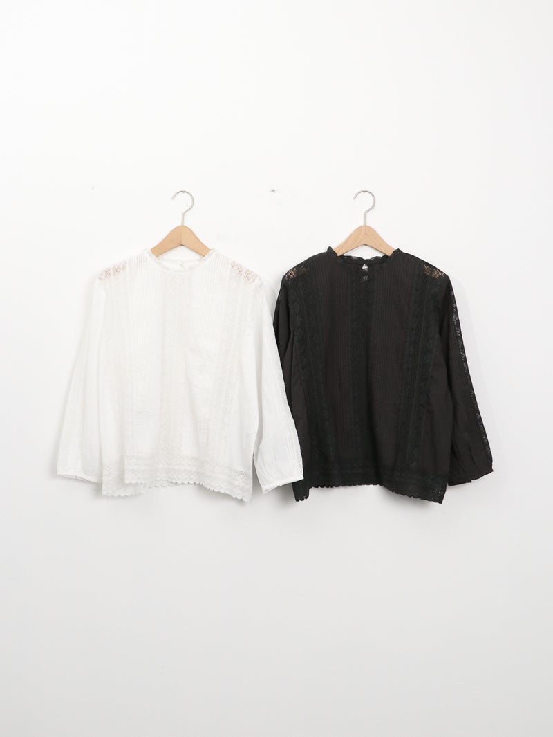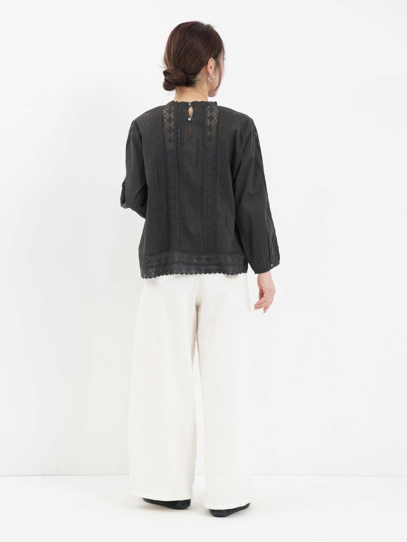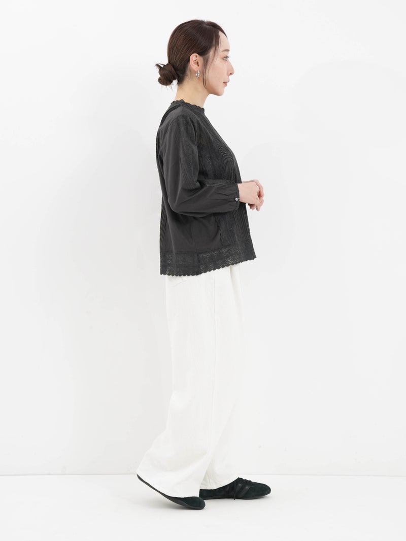 繊細なレース使いが上品なブラウス。 縦ラインのレースデザインで甘くなりすぎずスッキリとした印象に。ゆったりとしたシルエットで着心地も◎デニムでカジュアルに、きれいめボトムと合わせて上品にも着回せる一枚です。