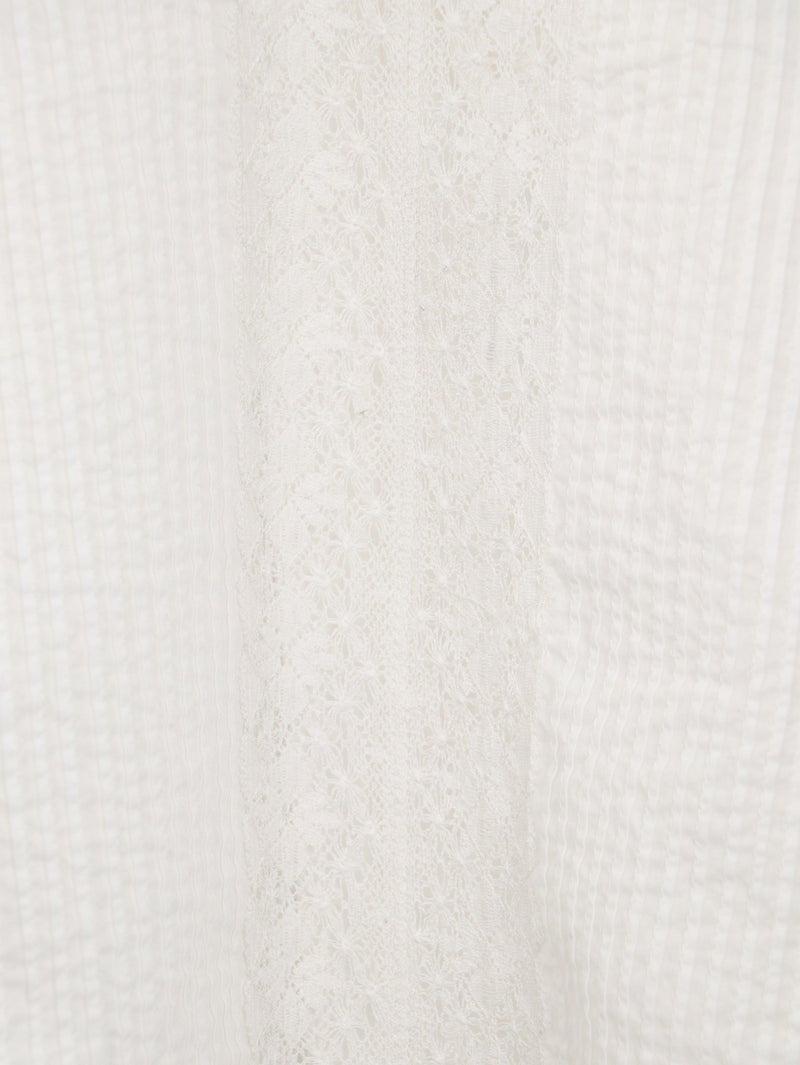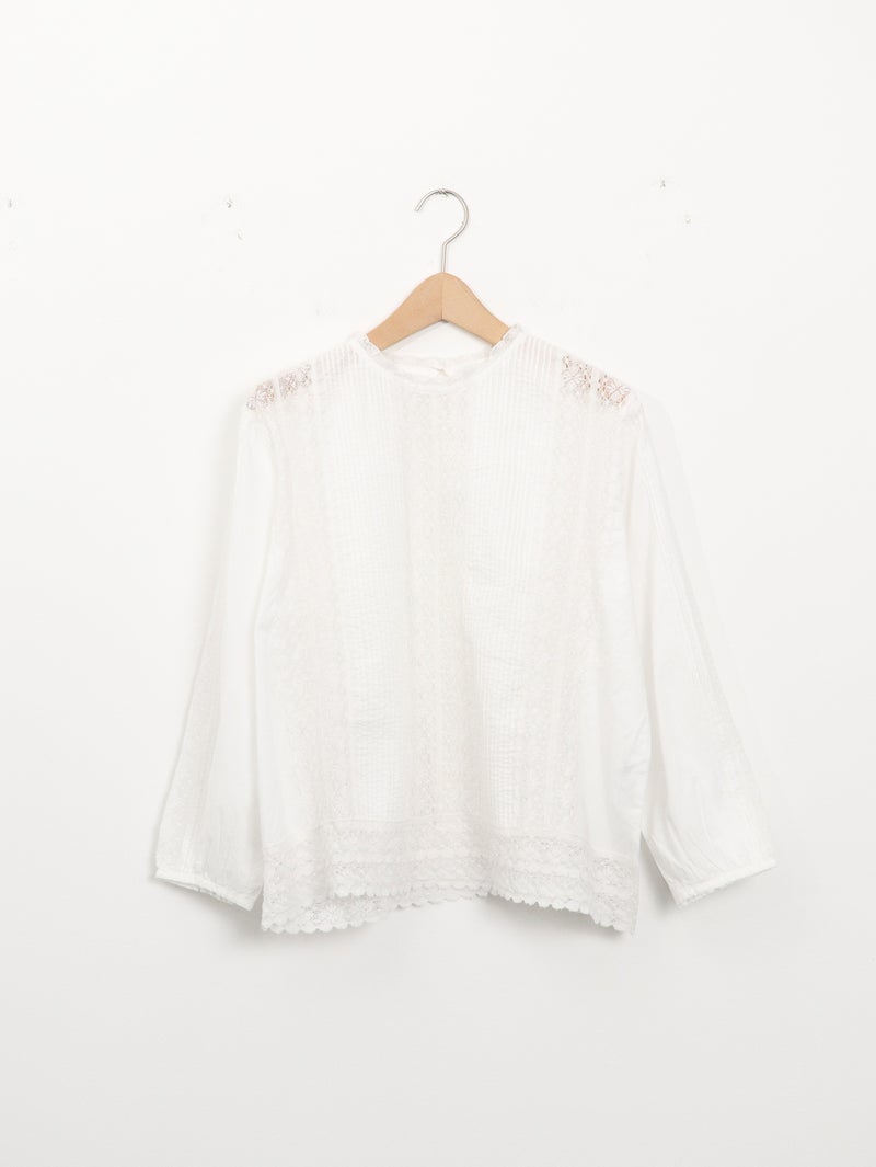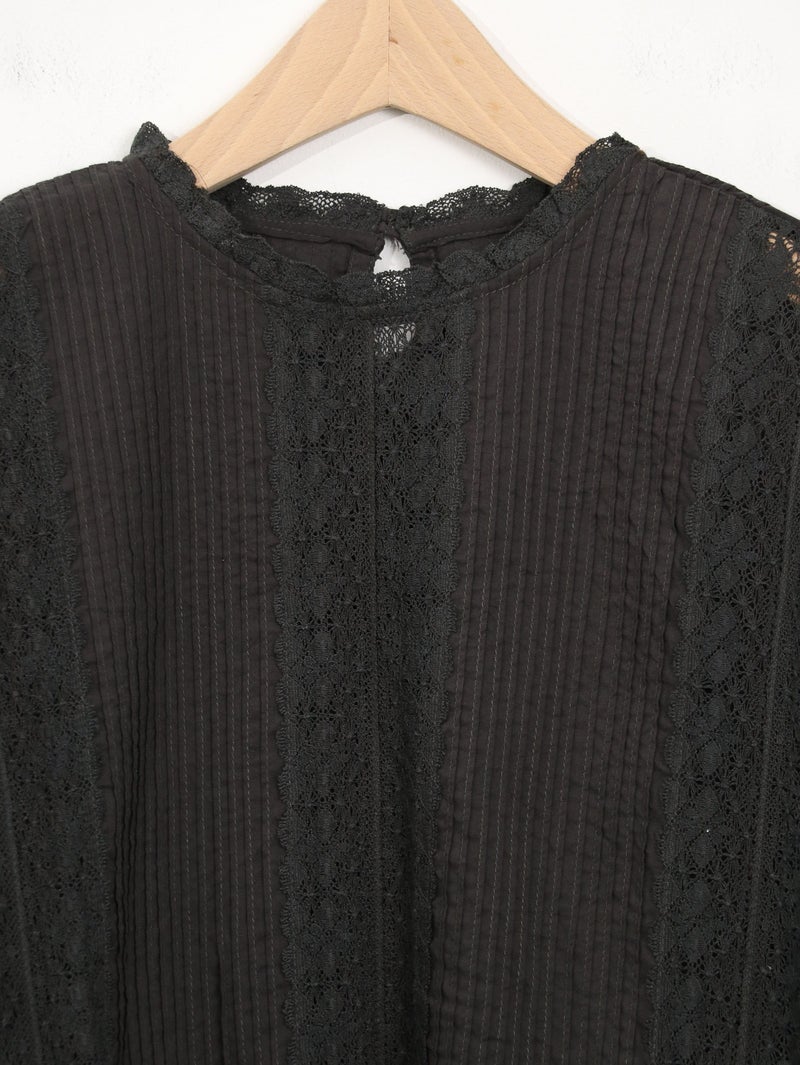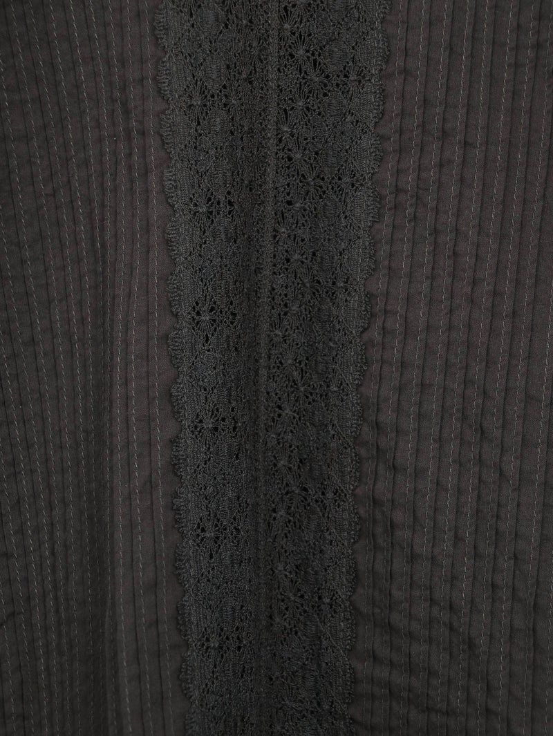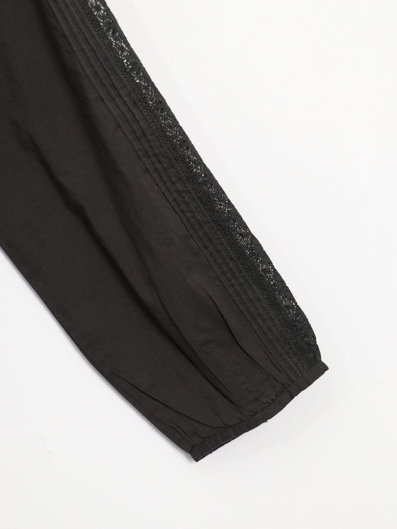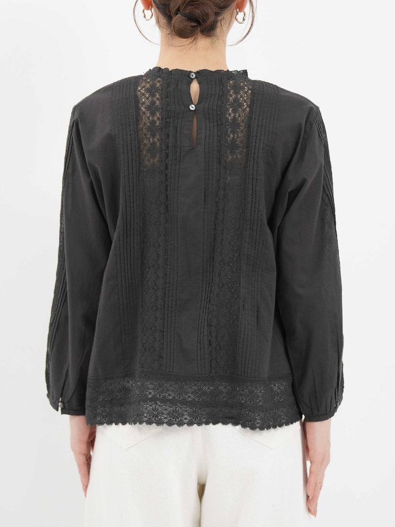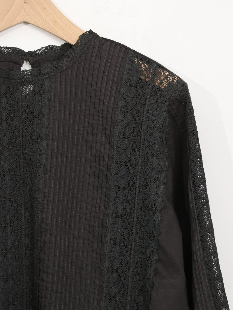 繊細なレース使いが上品なブラウス。 縦ラインのレースデザインで甘くなりすぎずスッキリとした印象に。ゆったりとしたシルエットで着心地も◎デニムでカジュアルに、きれいめボトムと合わせて上品にも着回せる一枚です。