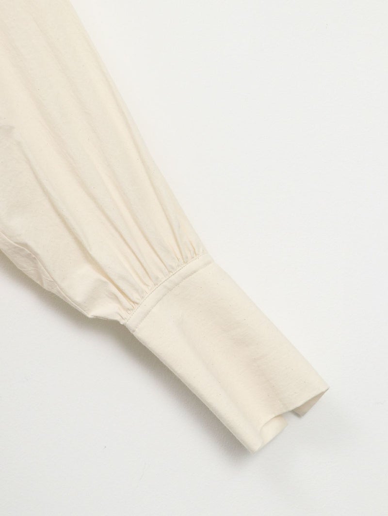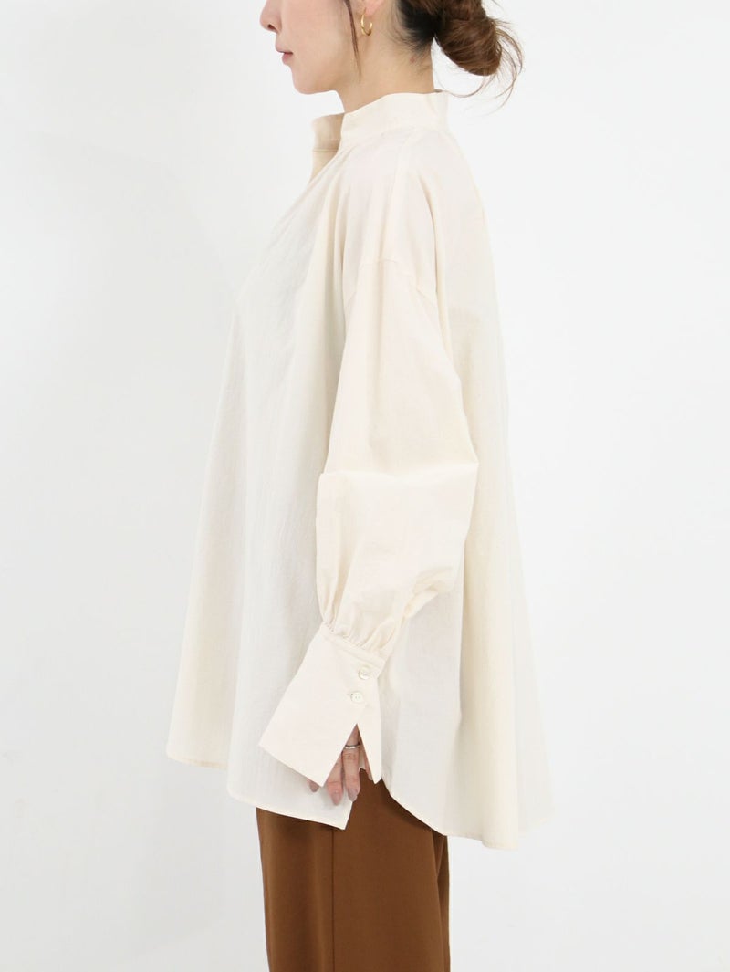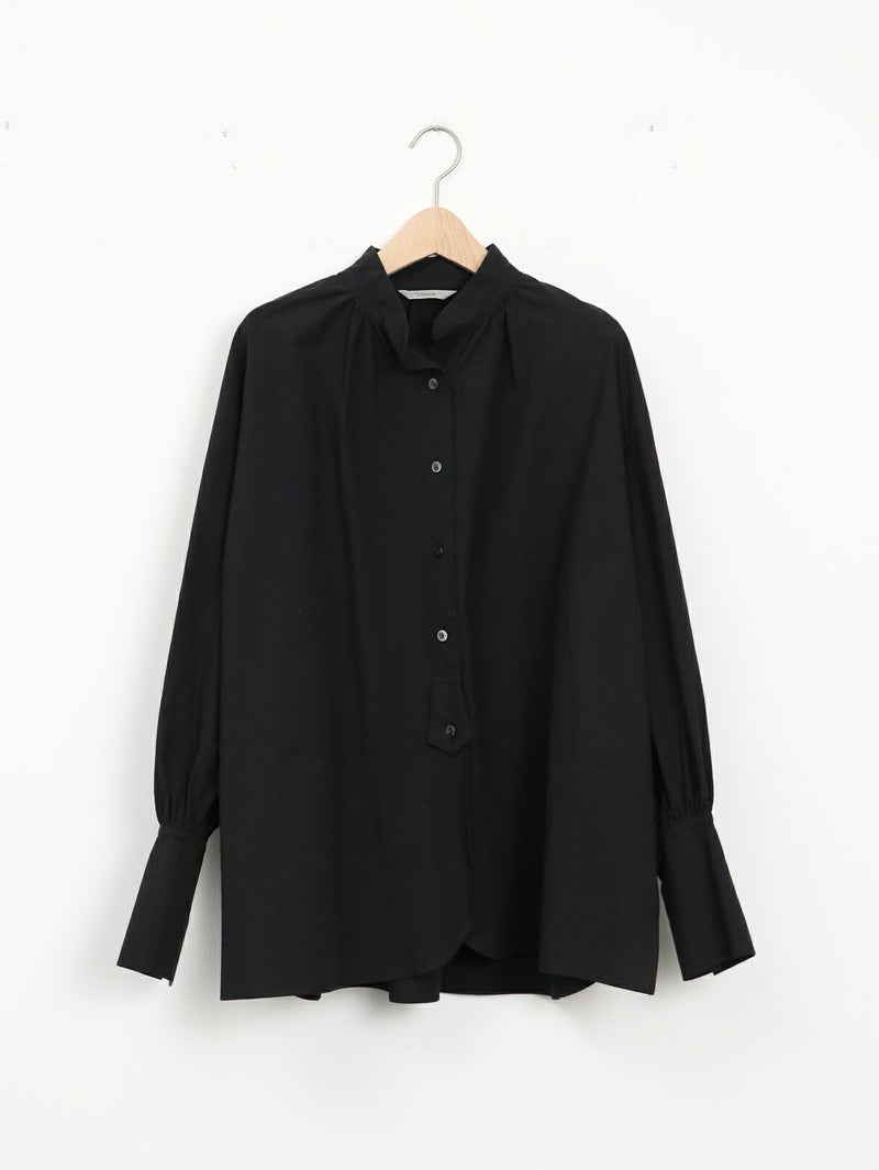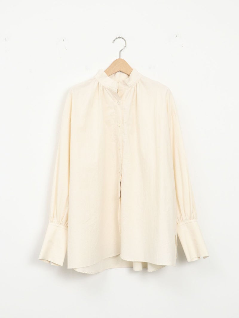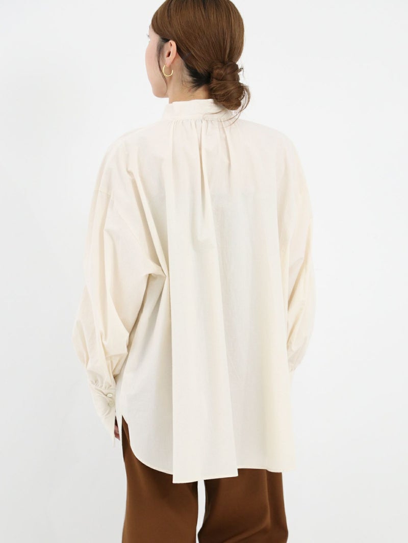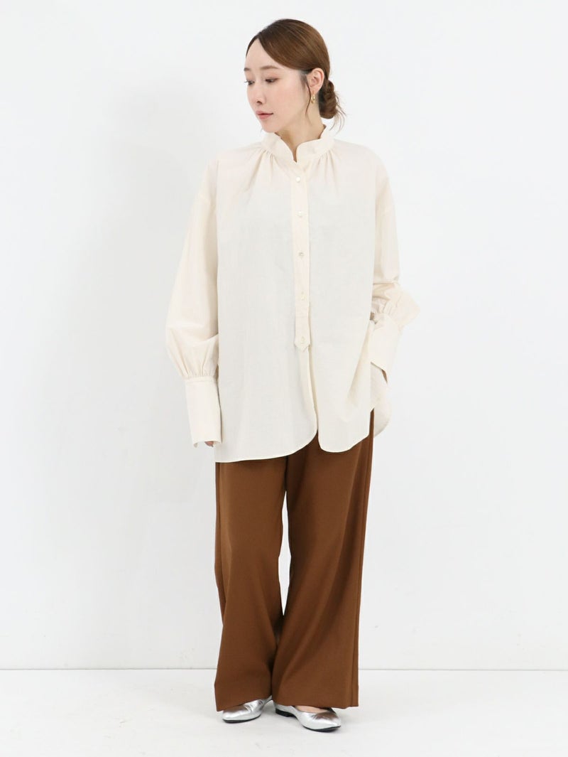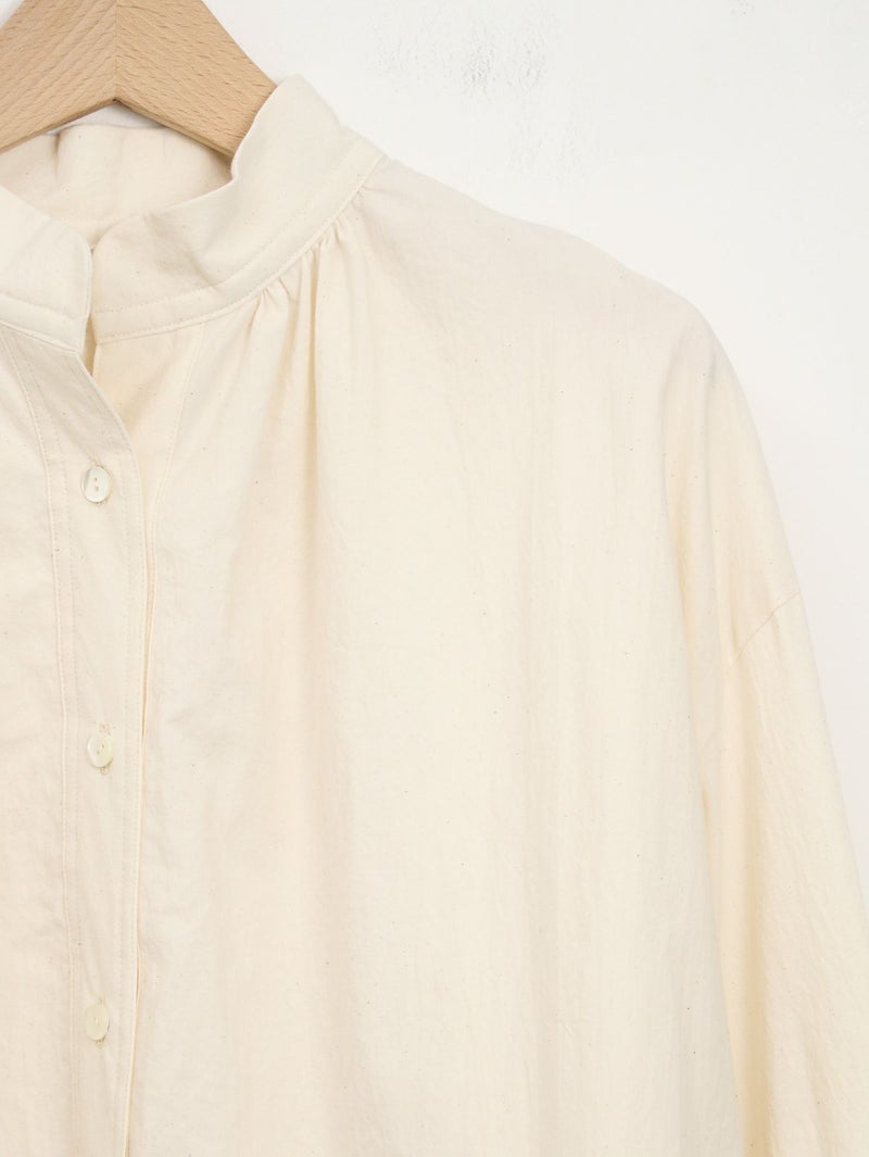 くったりと柔らかなコットン100%素材が心地よい、大人のためのスタンドカラーシャツ。 首周りに施した繊細なギャザーが、さりげないアクセントとなり、一枚で着るだけで顔周りを華やかに見せてくれます。程よくゆとりのあるサイズ感と、ニュアンスが出る袖口のデザインが、シンプルながらもこなれた雰囲気を演出します。