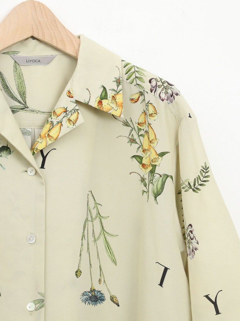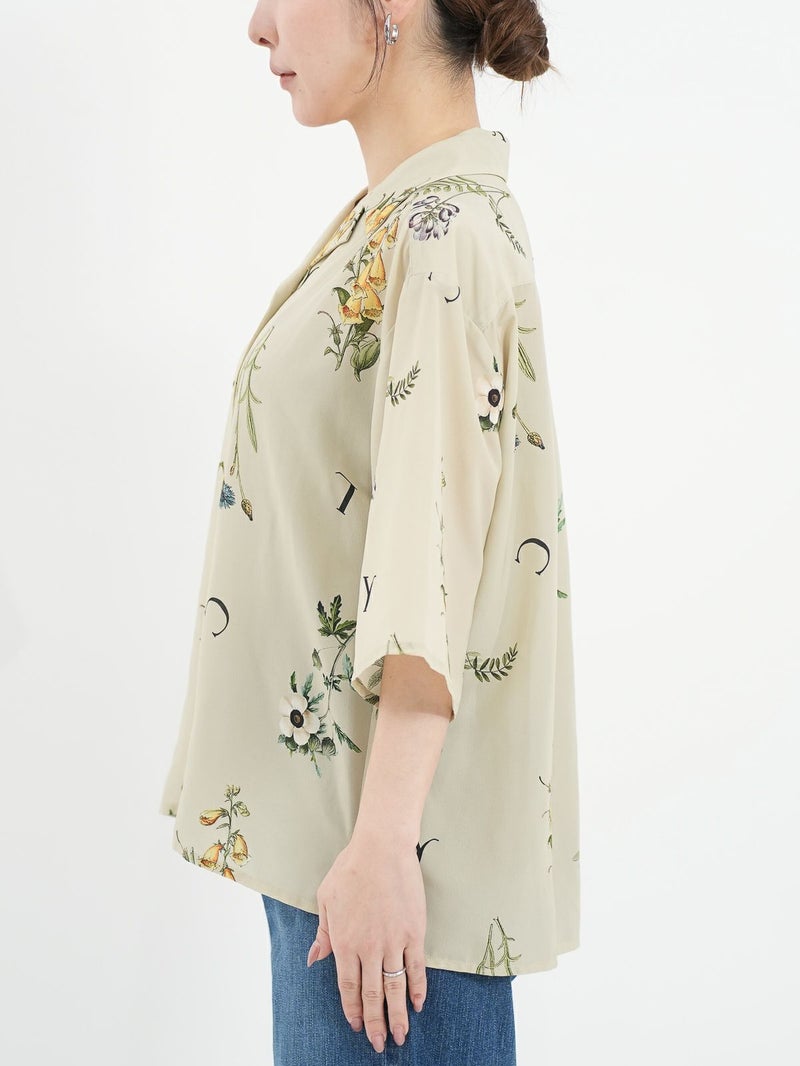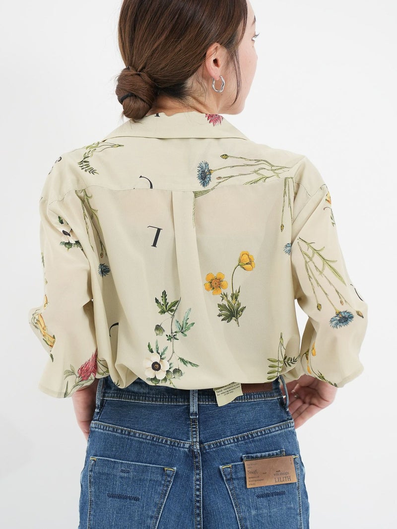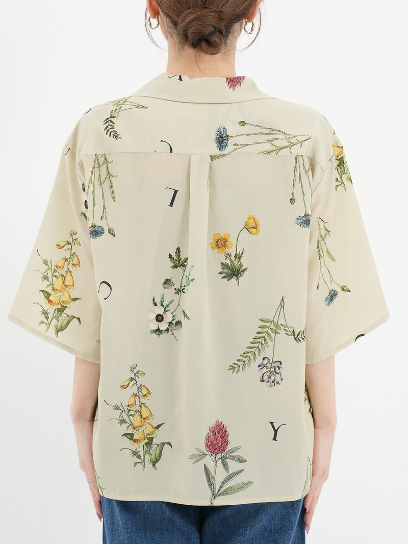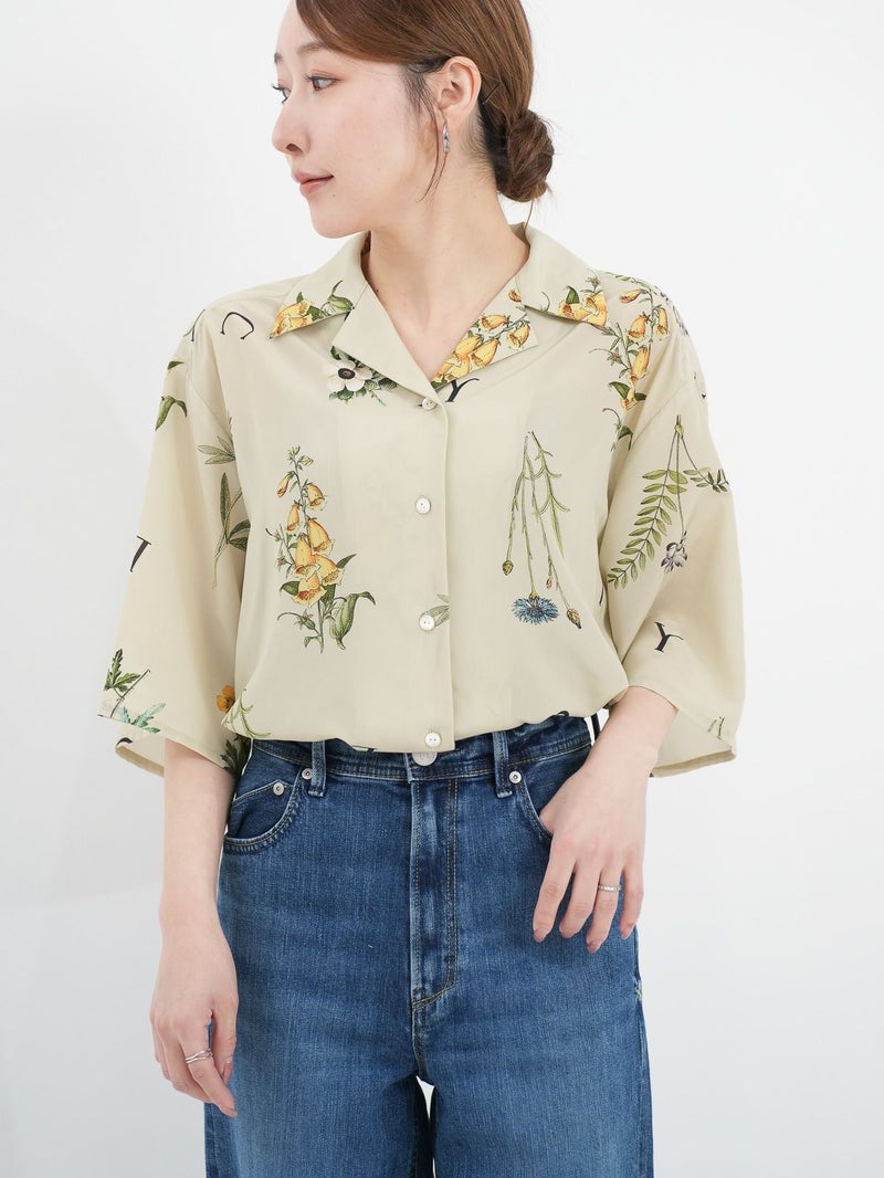 カラフルなボタニカル柄が目を惹くオープンカラーシャツ。 表面に細かい縮みじわを持った軽さとしなやかさのあるデシン素材を使用。インナーに長袖を重ねたり、ジャケットやカーディガンを羽織れば、ロングシーズンで活躍できます。