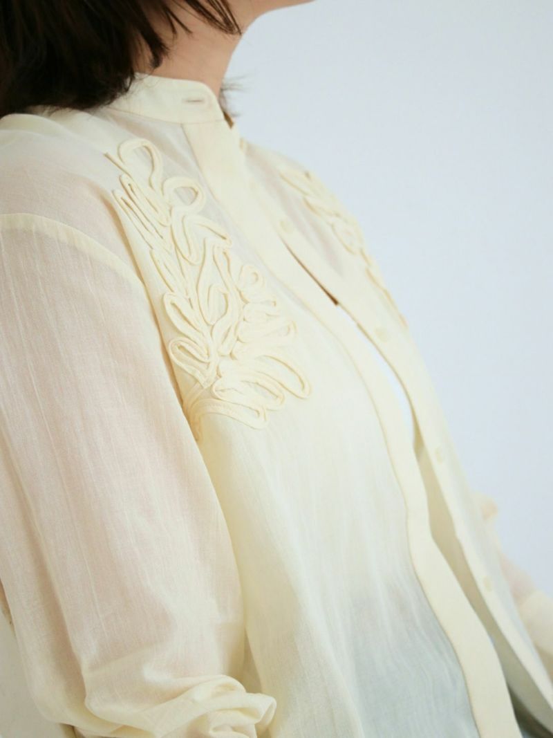 立体感のある刺繍がポイントのブラウス。 軽やかで透け感のある素材が絶妙なバランスです。 バンドカラーとヒヨクボタンで、刺繍を引き立てています。 体のラインを拾いにくく、上品なきれいめシルエット。 日焼けや冷房対策にもおすすめです◎