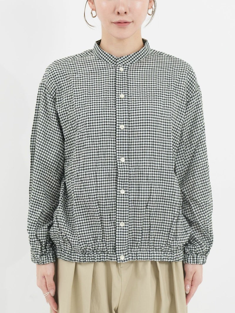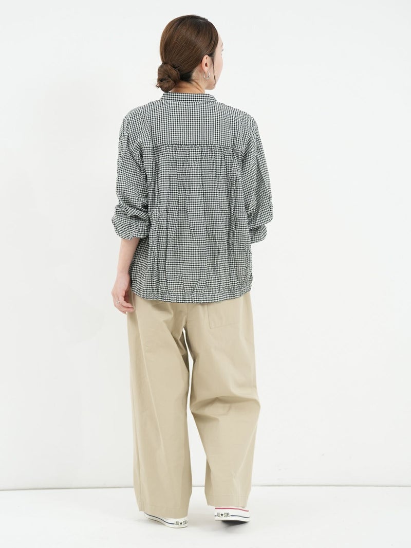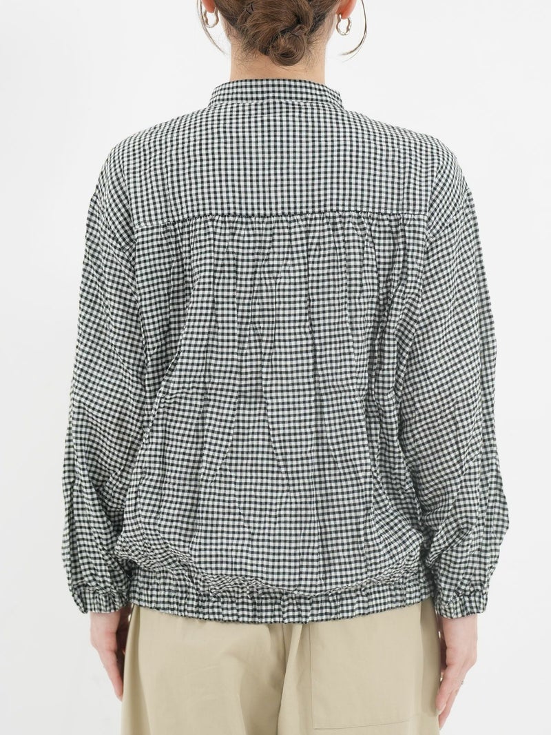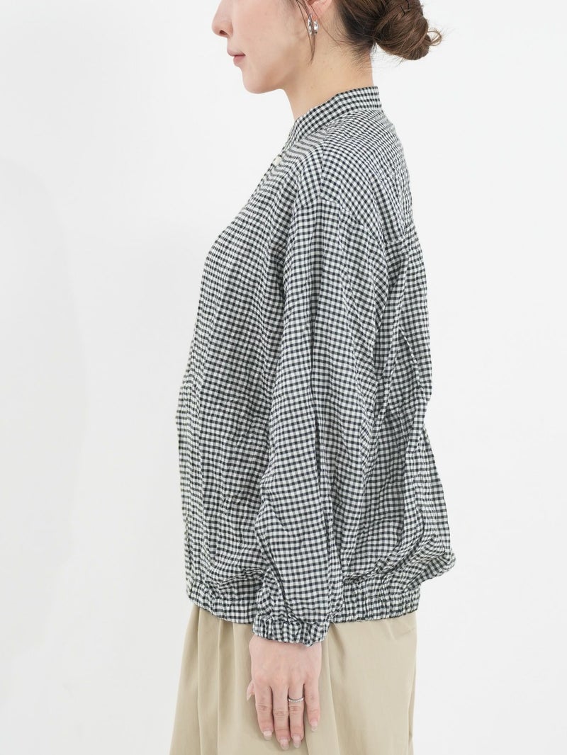 シャーリングが魅力のチェックシャツ。 さらっとした着心地で肌離れもよく◎裾はゴム仕様になっているのでブルゾン風にも着用していただけます。アイロンがけ不要なのもうれしいポイントです。