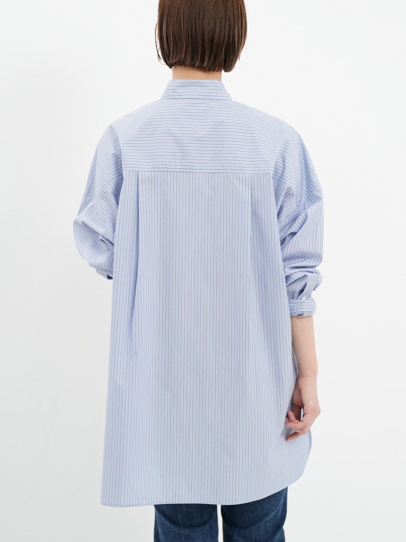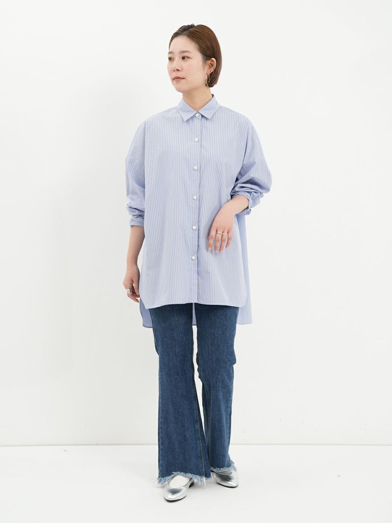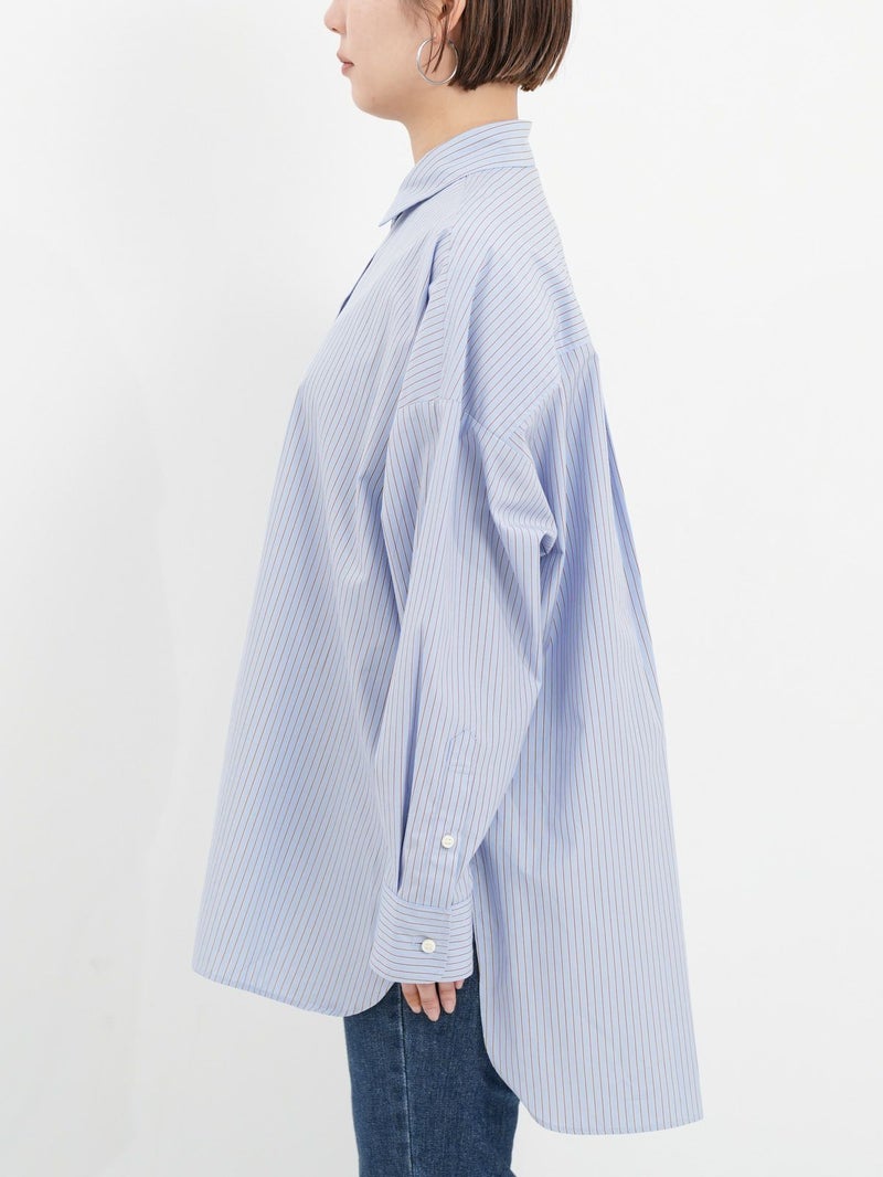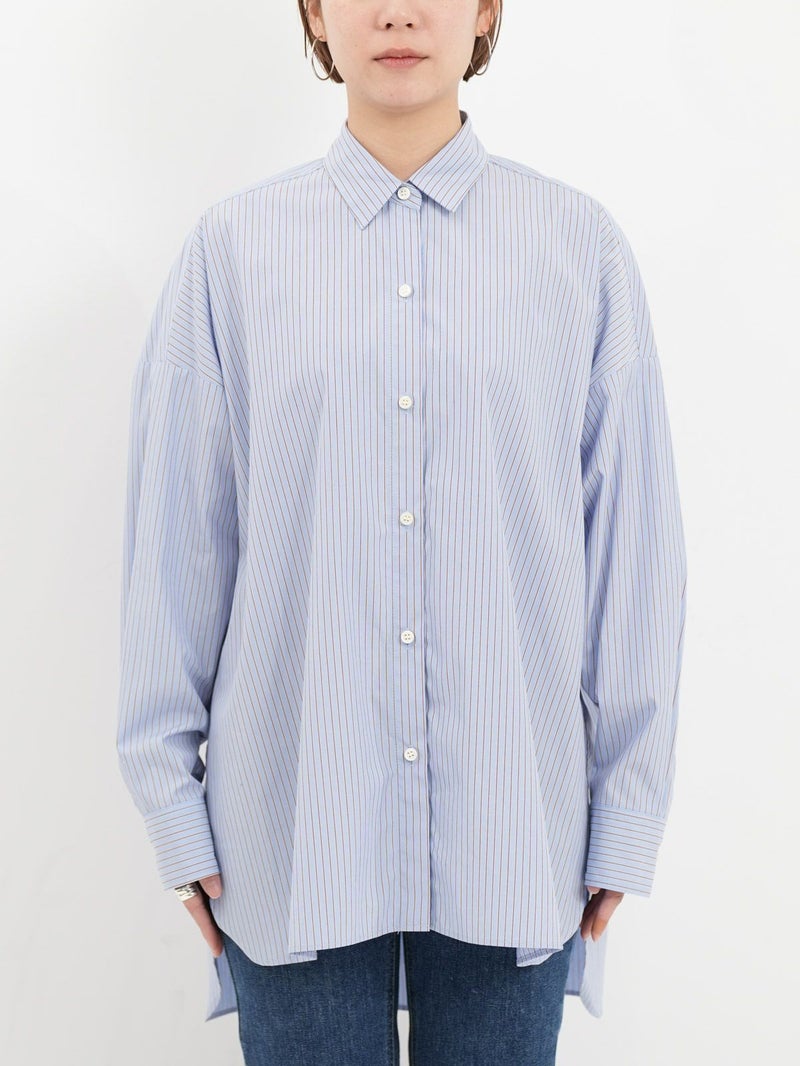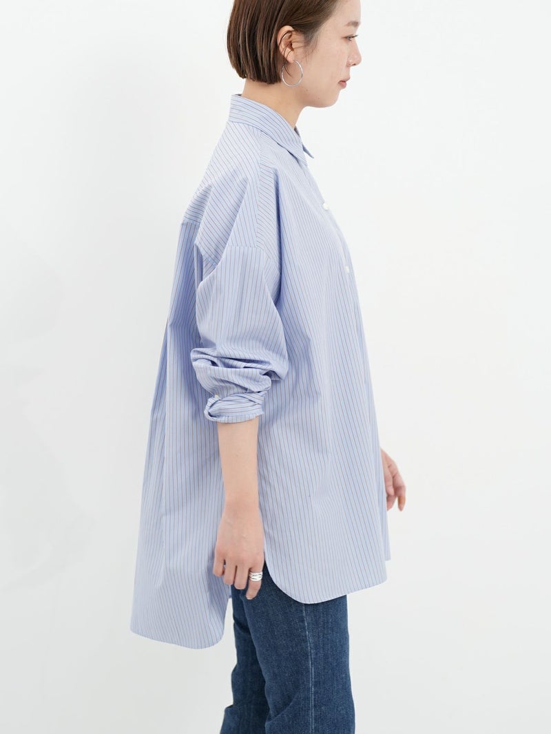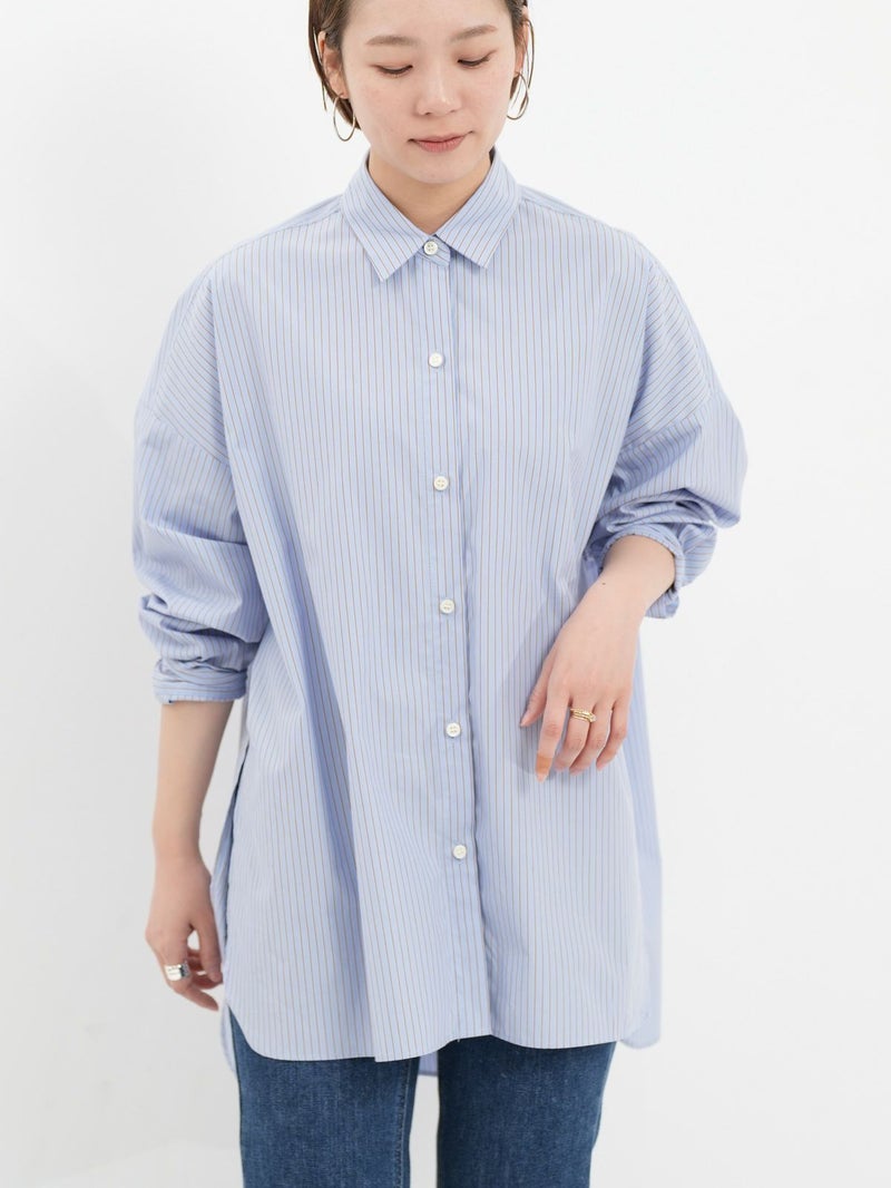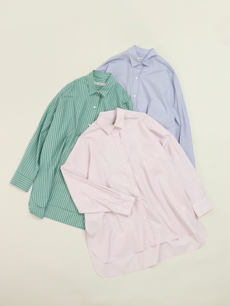 ストライプ柄がキレイに出るように設計した高密度ポプリンです。 気持ちが明るくなるような春にピッタリなカラーのストライプ柄を使用。 こなれ感の出る少しオーバーサイズなシルエットです。 ビンテージブラウスの裾のカッティングを参考にし、サイドは深めのスリットで抜け感を演出。さり気ないデザインポイントになっています。
