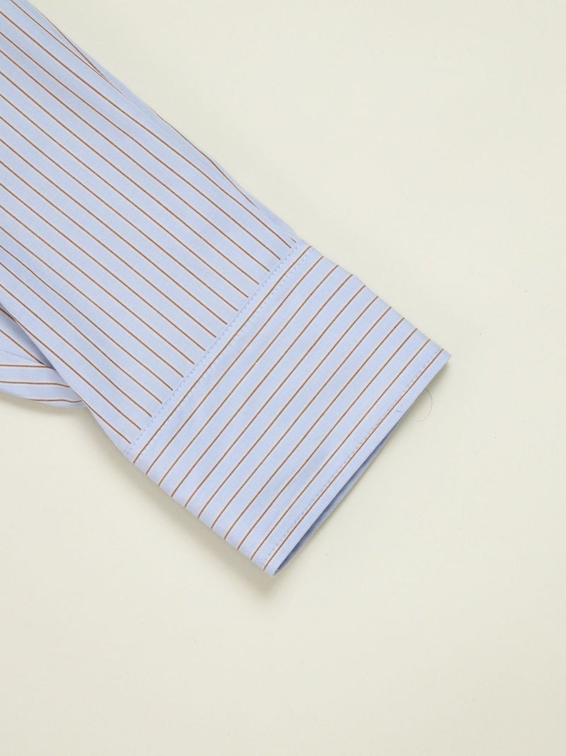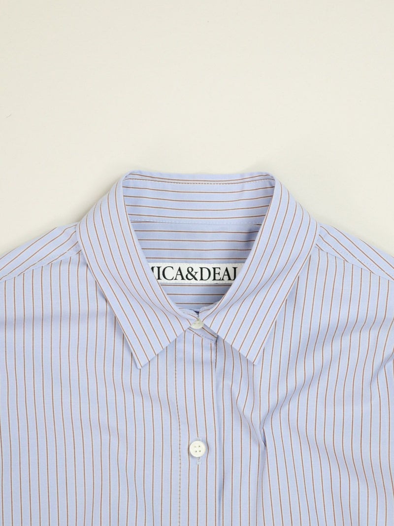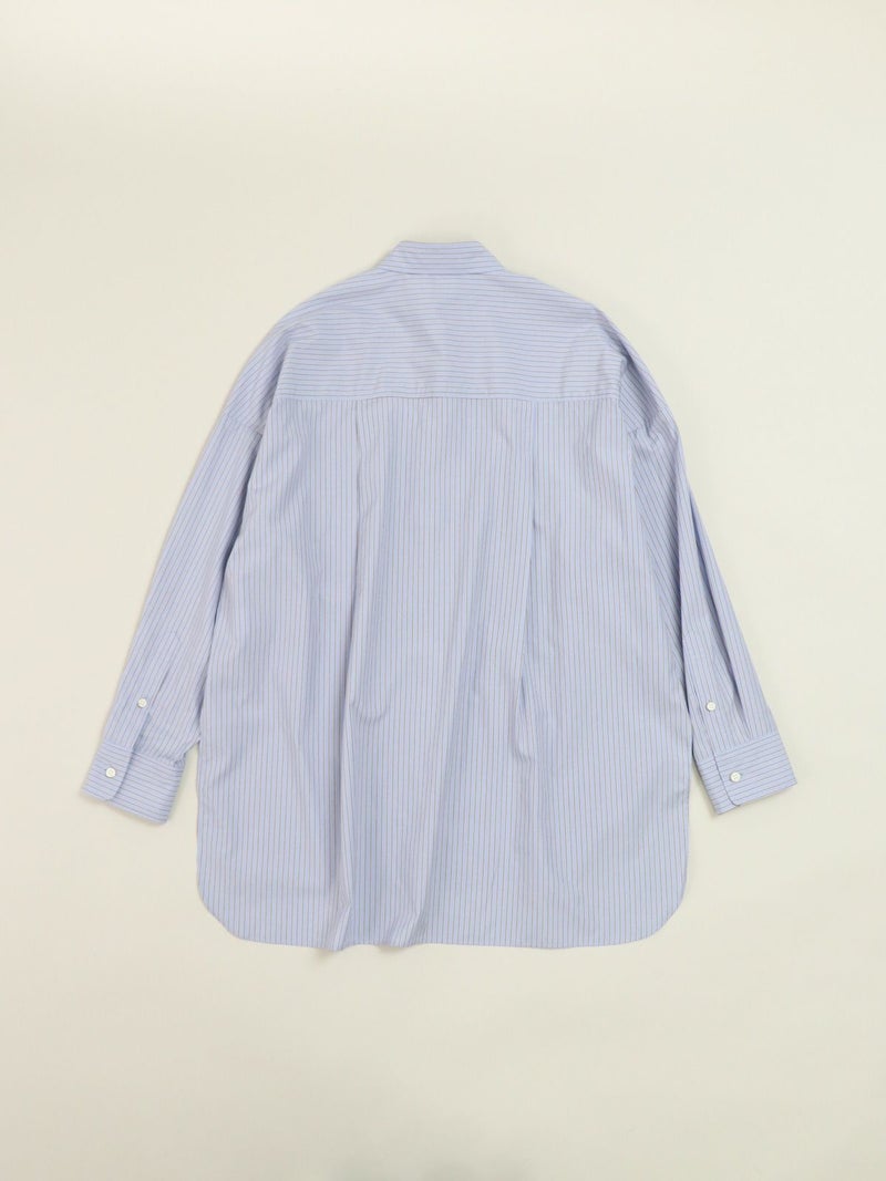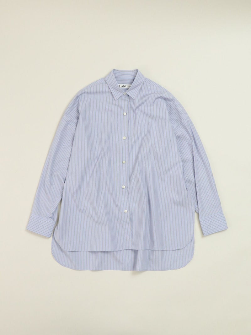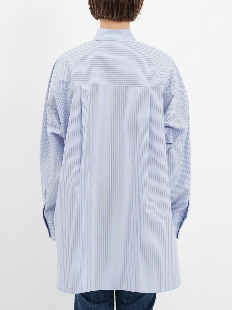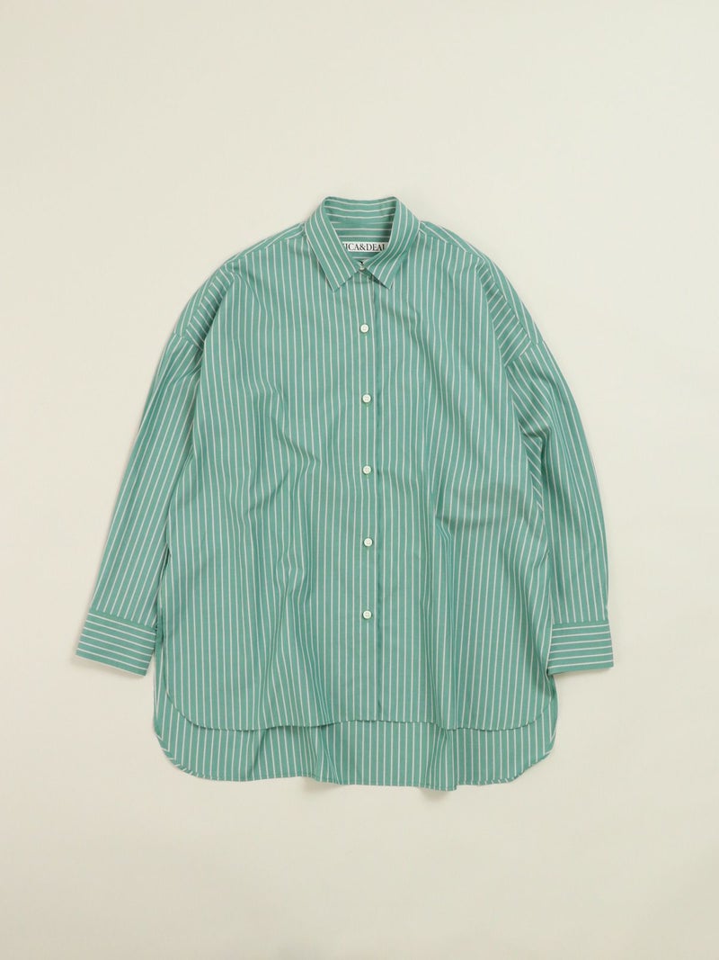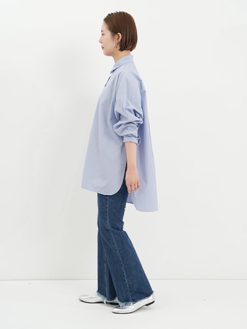 ストライプ柄がキレイに出るように設計した高密度ポプリンです。 気持ちが明るくなるような春にピッタリなカラーのストライプ柄を使用。 こなれ感の出る少しオーバーサイズなシルエットです。 ビンテージブラウスの裾のカッティングを参考にし、サイドは深めのスリットで抜け感を演出。さり気ないデザインポイントになっています。